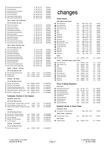 %u2752 Bulk Grapefruit & Orange Shampoo 5l 28.70 V 5.74 853541%u2752 Bulk Jojoba Shampoo 5l 28.70 V 5.74 853543%u2752 Bulk Lavender & Geranium Shampoo 5l 28.70 V 5.74 853545%u2752 Bulk Wild Rose Shampoo 5l 28.70 V 5.74 853566%u2752 Bulk Coconut Shampoo 20l 98.30 V 4.92 853578%u2752 Bulk Grapefruit & Orange Shampoo 20l 98.30 V 4.92 853579%u2752 Bulk Lavender & Geranium Shampoo 20l 98.30 V 4.92 853580Faith in Nature refill conditioners20% off list May and June%u2752 Bulk Aloe Vera Conditioner 5l 28.70 V 5.74 853550%u2752 Bulk Coconut Conditioner 5l 28.70 V 5.74 853552%u2752 Bulk Dragonfruit Conditioner 5l 28.70 V 5.74 853551%u2752 Bulk Fragrance Free Conditioner 5l 28.70 V 5.74 853556%u2752 Bulk Grapefruit & Orange Conditioner 5l 28.70 V 5.74 853554%u2752 Bulk Jojoba Conditioner 5l 28.70 V 5.74 853553%u2752 Bulk Lavender & Geranium Conditioner 5l 28.70 V 5.74 853555%u2752 Bulk Wild Rose Conditioner 5l 28.70 V 5.74 853569%u2752 Bulk Coconut Conditioner 20l 98.30 V 4.92 853581%u2752 Bulk Grapefruit & Orange Conditioner 20l 98.30 V 4.92 853585%u2752 Bulk Lavender & Geranium Conditioner 20l 98.30 V 4.92 853582Faith in Nature refill body wash20% off list May and June%u2752 Bulk Aloe Vera Body Wash 5l 24.00 V 4.80 853560%u2752 Bulk Coconut Body Wash 5l 24.00 V 4.80 853562%u2752 Bulk Dragon Fruit Body Wash 5l 24.00 V 4.80 853561%u2752 Bulk Fragrance Free Body Wash 5l 24.00 V 4.80 856564%u2752 Bulk Grapefruit & Orange Body Wash 5l 24.00 V 4.80 853563%u2752 Bulk Lavender & Geranium Body Wash 5l 24.00 V 4.80 853565%u2752 Bulk Wild Rose Body Wash 5l 24.00 V 4.80 853571%u2752 Bulk Coconut Body Wash 20l 80.80 V 4.04 853583%u2752 Bulk Grapefruit & Orange Body Wash 20l 80.80 V 4.04 855579%u2752 Bulk Lavender & Geranium Body Wash 20l 80.80 V 4.04 853584Organii - bodycare - SLS-free20% off list May and June%u2752 SPF15 Anti Ageing Facial Sun Cream organic 1x50ml 7.50 V 13.48 857669%u2752 SPF30 Sun Lotion organic 1x100ml 8.85 V 15.91 857671%u2752 SPF50 Sun Milk organic 1x125ml 12.40 V 22.23 857674Urtekram - Spa Range15% off list May and June%u2752 Shampoo - Wild Lemongrass organic 6x500ml 38.65 V 11.04 859135%u2752 Body Wash - Wild Lemongrass organic 6x500ml 40.10 V 11.46 859137%u2752 Sensitive Scalp Shampoo Fragrance Free organic 6x500ml 38.65 V 11.04 859139%u2752 Sensitive Skin Body Wash Fragrance Free organic 6x500ml 40.10 V 11.46 859147%u2752 Maximum Shine Shampoo - Soothing Lavender organic 6x500ml 38.65 V 11.04 859086%u2752 Body Wash - Soothing Lavender organic 6x500ml 40.10 V 11.46 859096Toothpaste, Brushes & Oral HygieneGeorganics Dental Care25% off list May and June%u2752 Fluoride Toothpaste - Activated Charcoal - tube - New! 1x75ml 1.70 V 2.91 881923%u2752 Fluoride Toothpaste - Fresh Mint - tube - New! 1x75ml 1.70 V 2.91 881293%u2752 Geokids Fluoride Toothpaste - Strawberry - tube - New! 1x75ml 1.70 V 2.91 881300Urtekram15% off list May and June%u2752 Bio9 Fresh Mint - Whitening Toothpaste organic 6x75ml 11.85 V 3.39 865096%u2752 Bio9 Strong Mint - Sensitive Toothpaste organic 6x75ml 11.85 V 3.39 862098%u2752 Aloe Vera Toothpaste organic 6x75ml 11.85 V 3.39 862103%u2752 Children's Tutti Frutti Toothpaste organic 6x75ml 11.85 V 3.39 862107%u2752 Tea Tree Toothpaste organic 6x75ml 11.85 V 3.39 862130Urtekram - with Fluoride15% off list May and June%u2752 Mint & Fluoride Toothpaste organic 6x75ml 11.85 V 3.39 862135changesCereal GrainsBulk Organic Cereal Grains%u25b2 Brown Jasmine Rice organic 25kg 64.00 2.56 10675%u25b2 Brown Jasmine Rice organic 5kg 14.60 2.92 10680%u25bc White Couscous - Italy organic 25kg 57.00 2.28 10541%u25bc White Couscous - Italy organic 5kg 13.20 2.64 10544%u25bc Millet organic 25kg 47.00 1.88 10555%u25bc Millet organic 5kg 11.20 2.24 10560%u25bc Popping Corn organic 25kg 50.00 2.00 10575%u25bc Popping Corn organic 5kg 11.80 2.36 10580%u25b2 Quinoa Grain organic 25kg 108.00 4.32 10592%u25b2 Quinoa Grain organic 5kg 23.40 4.68 10593%u25b2 Black Quinoa Grain organic 25kg 115.00 4.60 10687%u25b2 Black Quinoa Grain - 2.5kg organic 2.5kg 13.30 5.32 10691%u25b2 Tricolour Quinoa Grain organic 25kg 110.00 4.40 10692%u25b2 Tricolour Quinoa Grain organic 5kg 23.80 4.76 10693%u25bc Spelt Grain organic 25kg 47.00 1.88 10602%u25bc Spelt Grain organic 5kg 11.20 2.24 10603%u25b2 Wheat Grain organic 25kg 40.00 1.60 10615%u25b2 Wheat Grain organic 5kg 9.80 1.96 10620Biona%u25b2 Wild Rice Mix organic 6x500g 19.75 4.39 10972Infinity - Pre-Packed Organic Cereal Grains%u25b2 Brown Jasmine Rice organic 6x500g 10.50 2.34 1190%u25b2 White Couscous - Italy organic 6x450g 9.00 2.00 1057%u25b2 Millet organic 6x500g 8.45 1.88 1075%u25b2 Popping Corn organic 6x500g 8.80 1.96 1105%u25b2 Quinoa Grain organic 6x450g 14.70 3.27 1127%u25b2 Quinoa Grain organic 6x1kg 28.95 6.43 1128%u25b2 Black Quinoa Grain organic 6x450g 15.45 3.43 1157%u25b2 Tricolour Quinoa Grain organic 6x450g 14.90 3.31 1159%u25b2 Tricolour Quinoa Grain organic 6x1kg 29.40 6.54 1160%u25bc Spelt Grain organic 6x500g 8.45 1.88 1138%u25b2 Wheat Grain organic 6x500g 7.80 1.73 1150Flours & Baking RequisitesDoves Farm%u25c6 Wholemeal Strong Bread Flour organic 5x1.5kg 9.10 2.43 40540%u25c6 Strong White Bread Flour organic 5x1.5kg 9.75 2.60 40560%u25c6 Fine Plain Wholemeal Flour organic 5x1kg 6.50 1.73 40505%u25c6 Self Raising Wholemeal Flour organic 5x1kg 6.55 1.75 40515%u25c6 Plain White Flour organic 5x1kg 7.20 1.92 40545%u25c6 Self Raising White Flour organic 5x1kg 7.30 1.95 40565%u25c6 Malthouse Bread Flour organic 5x1kg 8.45 2.25 40574%u25c6 Pasta & Pizza Flour organic 5x1kg 8.70 2.32 51070%u25c6 Seedhouse Bread Flour organic 5x1kg 13.85 3.69 51067Breakfast Cereals & Cereal FlakesCommunity Foods%u25b2 De Luxe Muesli - 16 natural ingredients 25kg 73.90 2.96 70515Infinity Foods - Gluten-free%u25b2 Gluten-free Muesli - Original organic 25kg 146.00 5.84 62015Kallo Foods%u25b2 Puffed Rice Natural organic 8x225g 22.40 3.73 62505%u2748 new product %u2752 on offer%u25b2 price rise %u25bc fall Page 12%u272b size/other change%u25c6 offer ended