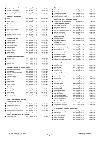 %u25c6 Mountain Honeybush Tea Bags organic 4x20bgs 7.90 2.63 560565%u25c6 Night Sky Calm Bags organic 4x20bgs 8.65 2.88 560567%u25c6 Sleepy Mint & Honeybush Bags organic 4x20bgs 8.65 2.88 560563%u25c6 Sweet Rosehip & Raspberry Bags organic 4x20bgs 8.65 2.88 560564%u25c6 Three Mint Medley Bags organic 4x20bgs 8.65 2.88 560566Dragonfly - Rooibos Teas%u25c6 Rooibos organic 4x40bgs 9.10 3.03 544008%u25c6 Rooibos - Earl Grey organic 4x40bgs 9.10 3.03 544110%u25c6 Rooibos - Vanilla organic 4x40bgs 9.10 3.03 544112Essential%u25b2 Camomile Tea Sachets organic 4x20bgs 9.00 3.00 571906%u25b2 Fennel Tea Sachets organic 4x20bgs 9.00 3.00 571907%u25b2 Ginger & Lemon Tea Sachets organic 4x20bgs 9.00 3.00 571908%u25b2 Hibiscus Tea Sachets organic 4x20bgs 9.00 3.00 571909%u25b2 Liquorice Tea Sachets organic 4x20bgs 9.00 3.00 571911%u25b2 Peppermint & Spearmint Tea Sachets organic 4x20bgs 9.00 3.00 571912%u25b2 Peppermint Tea Sachets organic 4x20bgs 9.00 3.00 571913Hambleden Tea Bags%u25b2 Chamomile Tea Bags organic 6x20bgs 13.55 3.01 560505%u25b2 Elderflower Tea Bags organic 6x20bgs 18.10 4.03 560510%u25b2 Hibiscus Tea Bags organic 6x20bgs 13.55 3.01 560520%u25b2 Lemon Verbena Tea Bags organic 6x20bgs 13.55 3.01 560530%u25b2 Limeflower Tea Bags organic 6x20bgs 18.10 4.03 560535%u25b2 Nettle Tea Bags organic 6x20bgs 13.55 3.01 560538%u25b2 Peppermint Tea Bags organic 6x20bgs 13.55 3.01 560540%u25b2 Rosehip Tea Bags organic 6x20bgs 18.10 4.02 560545%u25b2 Turmeric Chai Tea Bags organic 6x20bgs 18.10 4.05 560548Hambleden loose herb infusions%u25b2 Chamomile - loose organic 6x40g 18.10 4.03 560705%u25b2 Hibiscus - loose organic 6x50g 18.10 4.03 560710%u25b2 Lemon Verbena - loose organic 6x20g 18.10 4.03 560720%u25b2 Peppermint - loose organic 6x45g 18.10 4.03 560730%u25b2 Raspberry Leaf - loose organic 6x45g 18.10 4.03 560735Hampstead - string & tag envelope- Infusion%u25c6 Herbal Harmonies Selection Pack demeter 4x20bgs 11.95 3.99 560809%u25c6 Camomile Mellow organic 4x20bgs 11.35 3.79 560808%u25c6 Digest Well - was Fennel & Peppermint demeter 4x20bgs 11.35 3.79 560810%u25c6 Lemon Ginger demeter 4x20bgs 11.35 3.79 560815%u25c6 Peppermint & Spearmint demeter 4x20bgs 11.35 3.79 560820%u25c6 Meditate Lavender & Valerian demeter 4x20bgs 11.35 3.79 560823%u25c6 Rooibos organic 4x20bgs 11.35 3.79 560824%u25c6 Rosehip Hibiscus organic 4x20bgs 11.35 3.79 560825%u25c6 Sleep Well organic 4x20bgs 11.35 3.79 560826%u25c6 Turmeric & Cinnamon organic 4x20bgs 11.35 3.79 560828Tick Tock Rooibos%u25c6 Rooibos Tea Bags organic 4x40bgs 8.05 2.68 561712%u25c6 Rooibos Tea Bags organic 4x80bgs 15.75 5.25 561716%u25c6 Rooibos Tea Loose organic 6x100g 12.00 2.67 561717%u25c6 Green Rooibos Tea Bags organic 4x40bgs 8.55 2.85 561718%u25c6 Rooibos Earl Grey Tea Bags 4x40bgs 8.55 2.85 561722Teas - Black, Green & WhiteClipper FairTrade - black tea %u25b2 Assam Tea Bags organic 6x40bgs 13.40 2.98 580310%u25b2 English Breakfast Tea Bags - 80's organic 4x80bgs 14.40 4.81 580330%u25b2 Breakfast Fairtrade 40 Tea Bags organic 6x40bgs 15.65 3.48 580314%u25b2 Earl Grey Fairtrade Tea Bags - 40's organic 6x40bgs 15.40 3.42 580321%u25b2 Decaf Earl Grey Fairtrade Tea Bags - 40's organic 6x40bgs 18.80 4.18 580308%u25b2 Earl Grey Tea Bags - 80's organic 6x80bgs 21.60 4.80 580318Clipper - Fair Trade - string, tag & envelope %u25b2 Earl Grey - food service organic 250bgs 20.65 580320Clipper - black tea %u25b2 Fairtrade Everyday Tea Bags organic 6x40bgs 15.45 3.43 580328%u25b2 Everyday Tea Bags organic 4x80bgs 13.15 4.38 580331%u25b2 Fairtrade Everyday Tea Bags organic 4x80bgs 13.90 4.63 580329%u25b2 Everyday Decaffeinated Tea Bags organic 6x40bgs 18.80 4.18 580332%u25b2 Fairtrade Decaffeinated Tea Bags organic 4x80bgs 21.50 7.17 580334Clipper - Fair Trade - string, tag & envelope%u25b2 Fairtrade Everyday Tea Bags - food service 6x100bgs 34.70 590810Clipper - green tea - Fairtrade %u25b2 Green Fairtrade Teabags - 80's organic 4x80bgs 15.45 5.16 590630%u25b2 Green Fairtrade Teabags - 40's organic 6x40bgs 16.30 3.63 590634%u25b2 Pure Green Fairtrade - bags organic 6x20bgs 13.85 3.08 590638%u25b2 Green Tea & Lemon Fairtrade Teabags - 80's organic 4x80bgs 15.45 5.14 590639%u25b2 Green Tea with Lemon Bags organic 6x20bgs 13.85 3.08 590641%u25b2 Decaffeinated Green Tea Bags organic 6x40bgs 19.60 4.36 590707Clipper - white tea%u25b2 26 bag White Tea Bags organic 6x26bgs 12.35 2.74 590682%u25b2 White Fairtrade Teabags - 40's organic 6x40bgs 16.65 3.70 590683Dragonfly Tea%u25c6 Classic Earl Grey Tea Bags organic 4x20bgs 7.90 2.63 581020%u25c6 Golden Breakfast Tea Bags 4x40bgs 8.85 2.95 581022%u25c6 Traditional English Breakfast Tea Bags organic 4x20bgs 7.90 2.63 581025%u25c6 Pure Green Mountain Tea organic 4x20bgs 7.90 2.63 580345%u25c6 Moroccan Mint Green Tea Bags organic 4x20bgs 7.90 2.63 580346%u25c6 Moonlight Jasmine Green Tea Bags organic 4x20bgs 7.90 2.63 580347%u25c6 Swirling Mist White Tea Bags organic 4x20bgs 8.65 2.88 580350%u25c6 Digestive Chai Pu'er Tea Bags organic 4x20bgs 8.65 2.88 580354%u25c6 Digestive Lemon Pu'er Tea Bags organic 4x20bgs 8.65 2.88 580348%u25c6 Digestive Pu'er Tea Bags - was Good Dragon organic 4x20bgs 7.90 2.63 580349Hambleden organic tea%u25b2 Earl Grey Tea - loose organic 6x55g 18.10 4.04 560738%u25b2 Everyday Tea - loose organic 6x70g 18.10 4.04 560740%u25b2 Green Tea - loose organic 6x65g 18.10 4.04 560745%u25b2 Earl Grey Tea Bags organic 6x20bgs 18.10 4.02 560748%u25b2 Everyday Tea Bags organic 6x20bgs 13.55 3.01 560750Hampstead - Demeter/Organic %u25c6 Black Tea Bags Selection Pack organic 4x20bgs 11.95 3.98 580481%u25c6 Green Tea Bags Selection Pack organic 4x20bgs 11.95 3.98 580482%u25c6 Assam Tea Bags organic 4x20bgs 11.35 3.78 580483%u25c6 Green Tea Bags demeter 4x20bgs 11.35 3.78 580484%u25c6 Matcha Green Tea & Nettle Bags organic 4x20bgs 11.35 3.78 580494%u25c6 Ginger Green Tea Bags demeter 4x20bgs 11.35 3.78 580486%u25c6 Jasmine Green Tea Bags organic 4x20bgs 11.35 3.78 580487%u25c6 Mint Green Tea Bags demeter 4x20