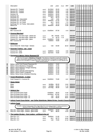 Description size price %u00a3/unit RRP code 123456789Sesame Oil - Toasted organic 6x150ml 20.20 4.49 200521Sesame Oil - Toasted organic 8x250ml 35.90 5.98 200520Sesame Oil - Toasted organic 6x500ml 44.95 9.99 200522Soybean Oil organic 6x500ml 26.95 5.99 200535Sunflower Oil organic 6x500ml 20.20 4.49 200525Sunflower Oil organic 6x1l 33.70 7.49 200527Sunflower Oil - clear plastic organic 1x2l 9.35 12.46 200529Sunflower Oil - for Frying organic 6x500ml 21.55 4.79 200530Sunflower Oil - for Frying organic 6x1l 35.05 7.79 200532Sunflower Oil - for Frying - clear plastic organic 1x2l 10.10 13.49 200534Walnut Oil organic 8x250ml 65.90 10.98 200537%u274a CocofinaMCT Coconut Oil organic 12x250ml 87.50 9.72 200544%u274a Coconut MerchantCoconut Oil - raw extra virgin - plastic tub organic 20l 218.85 10.94 200588Coconut Oil - raw extra virgin - plastic tub organic 4l 45.70 11.43 200590Coconut Oil - raw extra virgin - glass organic 12x500ml 75.50 8.39 200595MCT Coconut Oil 1x500ml 18.90 25.20 200597%u274a EpikourosCan of Olive Oil - Extra Virgin - Greece organic 1x5l 64.80 86.40 200620%u274a Essential Trading - raw - virginCoconut Oil - large organic 6x690ml 44.95 9.99 200630Coconut Oil - small organic 6x210ml 16.85 3.74 200632%u274a Farrington's Mellow Yellow Rapeseed Oil%u25c6 Mellow Yellow Cold Pressed Rapeseed Oil 6x500ml 19.65 4.37 200633%u2748 Mellow Yellow Blackberry Vinaigrette 6x250ml 15.40 3.42 200639%u25c6 Mellow Yellow Balsamic Vinegar Dressing 6x250ml 15.40 3.42 200634%u25c6 Mellow Yellow Chilli Oil 6x250ml 14.70 3.27 200635%u25c6 Mellow Yellow Ultimate Chilli Dressing 6x250ml 15.40 3.42 200636%u25c6 Mellow Yellow Classic Vinaigrette 6x250ml 15.40 3.42 200637%u25c6 Mellow Yellow Honey & Mustard Dressing 6x250ml 15.40 3.42 200638%u274a Forest Wholefoods - in glassCold Pressed E.V. Coconut Oil organic 12x500ml 74.60 8.31 200640%u274a Happy ButterGhee organic 6x580g 85.50 19.00 200649Ghee organic 6x300g 49.35 11.00 200650Ghee organic 12x150g 58.30 6.50 200654%u274a Hellenic SunOlive Oil Greek Extra Virgin 12x500ml 93.55 10.39 210510Olive Oil Greek Extra Virgin 12x750ml 127.60 14.18 210511Olive Oil Greek Extra Virgin - tin 1x3l 40.40 53.87 210520Olive Oil Greek Extra Virgin - tin 1x5l 66.65 88.87 210525%u274a Infinity Foods Cacao Butter - see Coffee Substitutes, Malted Drinks, Carob & Cocoa Products%u274a Infinity FoodsOlive Oil - Extra Virgin - Greece - glass bottle organic 6x500ml 43.50 9.66 201498%u2752 Olive Oil - Extra Virgin - Greece - glass bottle organic 6x1l 68.55 15.23 201500%u274a The Lesbian Donkey - from Lesbos - unfiltered olive oil Olive Oil - E.V organic 6x500ml 51.95 11.54 200570Olive Oil - E.V organic 6x1l 92.70 20.60 200572Olive Oil - E.V organic 1x5l 73.00 97.33 200575 New from Farrington's, Blackberry Vinaigrette. This delicious vinaigrette is made with sustainably grown cold pressed rapeseed oil, Dijon mustard and blackberries. It is packed full of flavour with no additives and is packaged in a glass bottle with a metal screw top. Farrington's is a LEAF Marque and carbon neutral producer. On offer is Infinity Foods organic Extra Virgin Olive Oil 1l, the pricing marked %u2752 below represents a discount of 20%. Please note Best Before Date is - 10/7/25 while stocks last!%u25b2 price rise %u25bc fall%u2748 new product %u2752 on offer Page 54%u272b size or other change%u25c6 offer ended