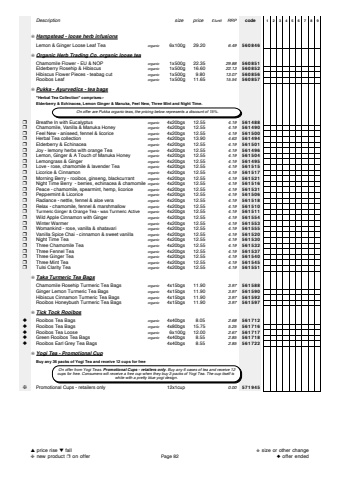 Description size price %u00a3/unit RRP code 123456789%u274a Hampstead - loose herb infusionsLemon & Ginger Loose Leaf Tea organic 6x100g 29.20 6.49 560846%u274a Organic Herb Trading Co. organic loose teaChamomile Flower - EU & NOP organic 1x500g 22.35 29.88 560851Elderberry Rosehip & Hibiscus organic 1x500g 16.60 22.13 560852Hibiscus Flower Pieces - teabag cut organic 1x500g 9.80 13.07 560856Rooibos Leaf organic 1x500g 11.65 15.54 560857%u274a Pukka - Ayurvedics - tea bags\ Tea Collection\Elderberry & Echinacea, Lemon Ginger & Manuka, Feel New, Three Mint and Night Time.%u2752 Breathe In with Eucalyptus organic 4x20bgs 12.55 4.19 561488%u2752 Chamomile, Vanilla & Manuka Honey organic 4x20bgs 12.55 4.19 561490%u2752 Feel New - aniseed, fennel & licorice organic 4x20bgs 12.55 4.19 561500%u2752 Herbal Tea collection organic 4x20bgs 13.90 4.63 561494%u2752 Elderberry & Echinacea organic 4x20bgs 12.55 4.19 561501%u2752 Joy - lemony herbs with orange Tea organic 4x20bgs 12.55 4.19 561496%u2752 Lemon, Ginger & A Touch of Manuka Honey organic 4x20bgs 12.55 4.19 561504%u2752 Lemongrass & Ginger organic 4x20bgs 12.55 4.19 561495%u2752 Love - rose, chamomile & lavender Tea organic 4x20bgs 12.55 4.19 561515%u2752 Licorice & Cinnamon organic 4x20bgs 12.55 4.19 561517%u2752 Morning Berry - rooibos, ginseng, blackcurrant organic 4x20bgs 12.55 4.19 561521%u2752 Night Time Berry - berries, echinacea & chamomile organic 4x20bgs 12.55 4.19 561516%u2752 Peace - chamomile, spearmint, hemp, licorice organic 4x20bgs 12.55 4.19 561531%u2752 Peppermint & Licorice organic 4x20bgs 12.55 4.19 561506%u2752 Radiance - nettle, fennel & aloe vera organic 4x20bgs 12.55 4.19 561518%u2752 Relax - chamomile, fennel & marshmallow organic 4x20bgs 12.55 4.19 561510%u2752 Turmeric Ginger & Orange Tea - was Turmeric Active organic 4x20bgs 12.55 4.19 561511%u2752 Wild Apple Cinnamon with Ginger organic 4x20bgs 12.55 4.19 561554%u2752 Winter Warmer organic 4x20bgs 12.55 4.19 561553%u2752 Womankind - rose, vanilla & shatavari organic 4x20bgs 12.55 4.19 561555%u2752 Vanilla Spice Chai - cinnamon & sweet vanilla organic 4x20bgs 12.55 4.19 561520%u2752 Night Time Tea organic 4x20bgs 12.55 4.19 561530%u2752 Three Chamomile Tea organic 4x20bgs 12.55 4.19 561532%u2752 Three Fennel Tea organic 4x20bgs 12.55 4.19 561537%u2752 Three Ginger Tea organic 4x20bgs 12.55 4.19 561540%u2752 Three Mint Tea organic 4x20bgs 12.55 4.19 561545%u2752 Tulsi Clarity Tea organic 4x20bgs 12.55 4.19 561551%u274a Taka Turmeric Tea BagsChamomile Rosehip Turmeric Tea Bags organic 4x15bgs 11.90 3.97 561588Ginger Lemon Turmeric Tea Bags organic 4x15bgs 11.90 3.97 561590Hibiscus Cinnamon Turmeric Tea Bags organic 4x15bgs 11.90 3.97 561592Rooibos Honeybush Turmeric Tea Bags organic 4x15bgs 11.90 3.97 561597%u274a Tick Tock Rooibos%u25c6 Rooibos Tea Bags organic 4x40bgs 8.05 2.68 561712%u25c6 Rooibos Tea Bags organic 4x80bgs 15.75 5.25 561716%u25c6 Rooibos Tea Loose organic 6x100g 12.00 2.67 561717%u25c6 Green Rooibos Tea Bags organic 4x40bgs 8.55 2.85 561718%u25c6 Rooibos Earl Grey Tea Bags 4x40bgs 8.55 2.85 561722%u274a Yogi Tea - Promotional CupBuy any 36 packs of Yogi Tea and receive 12 cups for free%u2748 Promotional Cups - retailers only 12x1cup 0.00 571945 On offer are Pukka organic teas, the pricing below represents a discount of 15%. On offer from Yogi Teas. Promotional Cups - retailers only. Buy any 6 cases of tea and receive 12 cups for free. Consumers will receive a free cup when they buy 3 packs of Yogi Tea. The cup itself is white with a pretty blue yogi design.%u25b2 price rise %u25bc fall%u2748 new product %u2752 on offer Page 82%u272b size or other change%u25c6 offer ended