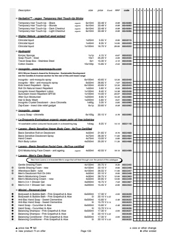 Description size price %u00a3/unit RRP code 123456789%u274a Herbatint%u2122 - vegan Temporary Hair Touch-Up SticksTemporary Hair Touch-Up - Black organic 6x10ml 33.48 V 9.99 854690Temporary Hair Touch-Up - Blonde organic 6x10ml 33.48 V 9.99 854692Temporary Hair Touch-Up - Dark Chestnut organic 6x10ml 33.48 V 9.99 854694Temporary Hair Touch-Up - Light Chestnut organic 6x10ml 33.48 V 9.99 854696%u274a Higher Nature - grapefruit seed extractCitricidal liquid 1x25ml 5.55 V 9.95 855015Citricidal liquid 1x45ml 8.35 V 14.95 855020Citricidal liquid 1x100ml 16.70 V 29.95 855022%u274a HydrophilKonjac Sponge 1x1p 4.15 V 6.67 855033Soap Pouch - Sisal 10x1 25.20 V 4.05 855035Travel Soap Box - Stainless Steel 6x1 15.30 V 4.10 855036Cotton Swabs 10x100p 15.85 V 2.54 855038%u274a incognito - www.lessmosquito.com2015 Winner Queen's Award for Enterprise - Sustainable Development see the Candles & Incense section for the rest of this anti-insect rangeincognito - anti-mosquito spray 6x100ml 43.65 V 12.34 855040incognito - Mini - anti-mosquito spray 6x50ml 26.85 V 7.67 822042Kids Insect Repellent - Spray 6x100ml 43.65 V 12.34 855043Roll On Natural Insect Repellent 1x50ml 5.60 V 9.55 855045Incognito Insect Repellent Lotion 1x100ml 8.40 V 14.38 855048Suncream Insect Repellent SPF30 1x100ml 14.00 V 23.97 855050After-Sun Moisturiser 1x200ml 8.95 V 15.33 855080Hair & Body Wash 1x200ml 5.60 V 9.61 855085incognito Crystal Deodorant - Java Citronella 1x60g 3.35 V 5.84 855090Zap-Ease - insect bite relief gadget 6x1p 33.60 V 9.59 855092%u274a incognito - soapsLuxury Soap - citronella 6x100g 20.15 V 5.76 855095%u274a La Droguerie Ecologique organic vegan palm oil free toiletries10 washable cotton coloured facial pads in a drawstring bag 1xbag 8.25 V 14.14 855118%u274a Lavera - Basis Sensitive Vegan Body Care - NaTrue CertifiedBasis Sensitive Roll-on Deodorant 4x50ml 21.65 V 9.75 855460Basis Sensitive Deodorant Spray 4x75ml 26.30 V 11.84 855462Hand Cream 4x75ml 13.00 V 5.85 855464Rich Body Lotion 4x250ml 25.20 V 11.35 855468%u274a Lavera - Basis Sensitive Facial Care - NaTrue certifiedQ10 Moisturising Face Cream - anti ageing organic 4x50ml 42.55 V 19.15 855499%u274a Lavera - Men's Care RangeGentle Shaving Foam 4x150ml 20.75 V 9.35 855345%u2748 Gentle Shaving Foam - new 4x150ml 22.10 V 9.95 855346%u2748 Aftershave Balm - tube 4x100ml 26.55 V 11.95 855347%u2748 Men's Deodorant Roll On 24hr 4x50ml 22.10 V 9.95 855348Men's Moisturising Cream 4x30ml 28.75 V 12.95 855363%u2748 Men's Moisturising Cream - new 4x50ml 30.95 V 13.95 855349Men's 3 in 1 Shower Gel 4x200ml 16.75 V 7.53 855367%u2748 Men's 3 in 1 Shower Gel - new 4x200ml 15.45 V 6.95 855353%u274a Miniml - Personal Care%u25c6 Bodywash & Bubble Bath - Pink Grapefruit & Aloe 6x500ml 17.30 V 4.94 855620%u25c6 Bodywash & Bubble Bath - Pink Grapefruit & Aloe 5l 22.10 V 4.42 855621%u25c6 Anti-Bac Hand Soap - Sweet Clementine 6x500ml 15.60 V 4.46 855622%u25c6 Anti-Bac Hand Soap - Sweet Clementine 5l 15.70 V 3.14 855623%u25c6 Hand Soap - Cucumber & Aloe 6x500ml 15.60 V 4.46 855624%u25c6 Hand Soap - Cucumber & Aloe 5l 15.70 V 3.14 855626%u25c6 Balancing Shampoo - Pink Grapefruit & Aloe 6x500ml 17.30 V 4.94 855627%u25c6 Balancing Shampoo - Pink Grapefruit & Aloe 5l 22.10 V 4.42 855630%u25c6 Balancing Conditioner - Pink Grapefruit & Aloe 6x500ml 17.30 V 4.94 855631%u25c6 Balancing Conditioner - Pink Grapefruit & Aloe 5l 22.10 V 4.42 855632 New from Lavera a re-branded Men's range that will feed through over the period of this catalogue. %u25b2 price rise %u25bc fall%u2748 new product %u2752 on offer Page 133%u272b size or other change%u25c6 offer ended