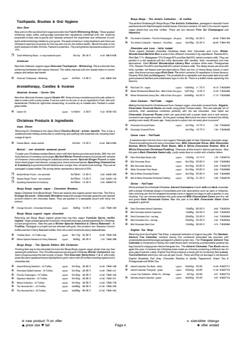 Toothpaste, Brushes & Oral HygieneAloe Dent %u2752Teeth Whitening Strips - 14 day treatment pack6x14p 28.45 V8.49881458Urtekram%u2748Charcoal Toothpaste - Whiteningorganic6x75ml13.95 V3.99862104Aromatherapy, Candles & IncenseAbsolute Aromas - Carrier Oils%u2748Castor Oilorganic1x100ml2.90 V5.22878153Christmas Products & IngredientsAqua Oleum%u2748Festive Blend - winter warmth3x10ml16.50 V10.99881290Belvoir - non alcoholic seasonal punch%u2752Mulled Winter Punch - non-alcoholic6x750ml13.50 V3.60640105%u2752Spiced Ginger Punch - non-alcoholic6x750ml13.50 V3.60640110%u2752Sparkling Clementine & Cranberry6x750ml13.50 V3.60660574Booja Booja organic vegan - Chocolate Wonders%u2748Orange Scrunch - Chocolate Wonders organic8x65g 14.95 V2.99766129Booja Booja organic vegan chocolate%u2748Yuletide Spice - 10 Truffle Logsorganic8x115g 54.95 V10.99766156%u2748Winter Special Hazelnut & Cherry Bakewellorganic8x92g 36.25 V7.25766198Booja Booja - The Special Edition Gift Collection%u2748Award Winning Selection - 16 Trufflesorganic5x184g 46.85 V14.99766148%u2748Chocolate Salted Caramel - 16 Trufflesorganic5x184g 46.85 V14.99766141%u2748Fine De Champagne - 16 Trufflesorganic5x184g 46.85 V14.99766142%u2748Signature Selection - 16 Trufflesorganic5x184g 46.85 V14.99766151%u2748Winter Collection - 16 Trufflesorganic5x184g 46.85 V14.99766178%u2748The Gourmet No.1 - 25 Trufflesorganic4x289g 69.95 V27.99766193%u2748The Gourmet No.2 - 25 Trufflesorganic4x289g 69.95 V27.99766194New fromUrtekram,organicveganCharcoalToothpaste -WhiteningThis is afluoride-freewhitening toothpastewithnatural charcoal. Thewillow charcoalwith zinclactatehelps tocontrolplaque and reduce bad breath. Newandonoffer are Aloe Dentvegan peroxide-freeTeethWhiteningStripsThesegradualwhiteningstrips utilisecutting-edgeperoxide-freeingredients combinedwith thesoothingproperties ofaloevera togently andnaturallyenhance thebrightness and whiteness of yourteethwhileminimisingirritation toyour gums. Thepackcontains a 14 day treatment andthere are28strips ineach box(onestrip for the top and one for thebottom teeth).Mould thestrip to theteeth and peel offafter 30 mins.Packed in acardbox. Thepricingbelow represents adiscount of15%New fromAbsoluteAromas,organicCastor Oil. Ithasahoneyconsistency and ispale yellow toclear incolour with anuttyaroma. It can beused on its own or as aningredient inhair,skin andfacialblends.Perfect fornight-timemoisturising, tosoothe dry orirritatedskin. Packed in adarkglass bottle.HappyChristmasfromBooja Booja!There areseveral neworganicgluten-freelines. Thefirst isOrangeScrunch - Chocolate Wondersmade withorange chocolateganache andcaramelscrunch rolled inrichchocolateflakes.They arepacked in aresealablepouchwithshinyfirecolours.Returning areBooja Boojaorganicgluten-freesoy-free veganYuletideSpicetrufflelogletsfinger shapedganachecovered inchocolateshavings,packedespecially forChristmasinaredandgold box. Newthisyear isWinter SpecialHazelnut &Cherry Bakewell - 8Truffles.Packaged in abright red boxtrimmedwithgold,this containsfourHazelnutCrunchtruffles and four Cherry Bakewell truffles. Dive into a whirl of almond cherry bakewellness.Returning forChristmas is theAqua OleumFestiveBlend -winterwarmthThis is has atraditionalwinter holidayaromathat is comfortingand upliftingwith essentialoilsincluding bitterorange & myrrh.TowarmyourChristmascockles Belvoirreturnwith theirfestivepunches anddrinks.With therichfruityflavours of cranberry andorange,MulledWinterPunchcontains fruit juices withextractsofcinnamon, cloveandnutmeg for adeliciouswinterwarmer.SpicedGingerPunchismadefrom afresh ginger rootinfusion, orangejuice, lemonjuice and spices.SparklingClementine&Cranberryisajuiceblendwithblackcurrant,orange,lime,cinnamon andnutmeg. They are allpackaged in glass bottles.The pricing below represents a discount of 20%.Pushingtheir way to the chocolatefront are theBooja Boojaorganicvegan gluten-freesoy-freespecialgiftcollections. The 16 truffleseasonal red andgoldChristmasWinter Collectionhasbeen ahugesuccess thelastcouple ofyears.TheGourmetSelections 1 & 2withprettyjewel-likepaint-spatteredboxeshighlighted ingold,returnwith 26 trufflesincluding loglets and achocolate star.Booja Booja - The Artist's Collection - 16 truffles%u2748The Artist's Collection - Fine De Champagne - 16organic3x185g 54.35 V28.99766158%u2748The Artist's Collection - Hazelnut - 16 trufflesorganic3x185g 54.35 V28.99766159Chocolate and Love - fairly traded %u2748Rich Dark Tin - veganorganic1x30x5g11.70 V18.72762209%u2748Winter Wonderland Ballotin Box - Milk & Dark Choorganic1x27x5g8.35 V13.36762206%u2748Winter Wonderland Library Box - Milk & Dark Choorganic4x3x80g44.25 V17.70762208Coco Caravan - FairTrade - vegan%u2748Chocolate Covered Datesorganic4x150g 19.75 V7.90762025%u2748Chocolate Covered Plums4x150g 19.75 V7.90762028Cocoa Loco - FairTrade%u2748Dark Chocolate Santa Lollyorganic12x40g 10.10 V1.35762074%u2748Milk Chocolate Elvesorganic6x100g 25.85 V6.90762082%u2748Milk Chocolate Santasorganic6x100g 25.85 V6.90762078%u2748White Chocolate Polar Bearsorganic6x100g 25.85 V6.90762086%u2748Milk & White Chocolate Robinsorganic6x100g 25.85 V6.90762089%u2748Milk & White Chocolate Christmas Puddingorganic6x70g 21.30 V5.68762079Divine - FairTrade%u2748Dark Chocolate Advent Calendars12x85g 60.00 V8.00763554%u2748Milk Chocolate Advent Calendars12x85g 60.00 V8.00763555%u2748Dark Chocolate Coin - net bag 25x65g 53.30 V3.42763560%u2748Milk Chocolate Coin - net bag 25x65g 53.30 V3.42763564%u2748Milk Chocolate Giant Coin12x58g 28.00 V3.74763566English Tea Shop%u2748Advent Calendar Tea Book - whiteorganic6x304g 55.6012.36560771%u2748Advent Calendar Triangular - greenorganic6x304g 49.8511.08560772Luxury Tea Collection - White Tin - 36 bagsorganic6x74g 40.809.07560773%u2748Sachets Advent Calendar - green organic6x200g 25.505.67560774TheperfectChristmasgift:Booja BoojaTheArtist'sCollection,packaged inbeautifulhandpainted colourfulKashmiripapier m%u00e2ch%u00e9boxes.Each box contains 16melt in