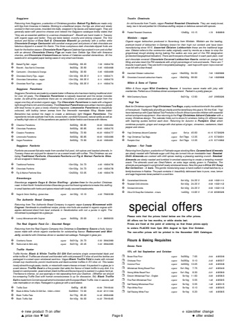Seggiano%u2748Baked Fig Ball - vegan12x200g 68.207.58183470%u2748Biscotti - Sea Salt & Chocolate8x200g 33.905.65183468%u2748Cantuccini - Chocolate & Orange8x200g 33.905.65183469%u2748Chocolate Cherry Figs - vegan12x140g 68.35 V9.11183471%u2748Chocolate Clementines - vegan12x120g 68.35 V9.11183473%u2748Chocolate Rum Figs - vegan12x120g 68.35 V9.11183474Seggiano Panettone%u2748Chestnut Panettone6x500g 83.8518.63183484%u2748Chocolate Panettone6x500g 83.8518.63183475%u2748Classico Panettone6x500g 72.9016.20183477%u2748Limoncello Panettone6x500g 83.8518.63183486%u2748Vegan Panettone6x500g 72.9016.20183481Seggiano Panforte%u2748Traditional Panforte10x100g 34.704.63183476%u2748Chocolate Panforte10x100g 34.704.63183478%u2748Fig & Walnut Panforte Slice12x200g 53.055.89183479Steenbergs%u2748Sage & Onion Stuffing - gluten-freeorganic4x130g 12.104.03792339The Authentic Bread Company%u2748Luxury Mincemeat with Cognacorganic6x300g 23.005.11365653The Real Organic Food Co - Gourmet Range%u2748Cranberry Sauceorganic6x310g 24.705.50394280%u2748Redcurrant & Mint Jellyorganic6x315g 22.455.00394285Truffle Hunter%u2748Truffle Dust6x65g 48.8010.84791644%u2748Black & White Truffle Oil Gift Set - 100ml +100ml6x200ml72.0016.00211104%u2748Black Truffle Pate6x170g 65.2014.49293406%u2748Black Truffle Salt6x140g 64.0014.22791645ReturningfromSeggiano, aselection ofChristmasgoodies.Baked FigBallsaremadeonlywith figsfromCosenza inCalabria.Sticking to atraditionalrecipe, the figs are dried andslowlycooked intheir own juices,moulded intoballs,wrapped in figleaves andbakedagain.They aregenerallyeatenwithpecorinocheese and indeed theSeggianocatalogueboldlystates that\ are anessentialaddition to a seriouscheeseboard\with organiceggs andbutter. They aretwicebaked, crunchy andoblongshaped. The finetexture andflavour ofSeaSalt & ChocolateBiscottigoperfectlywith acoffeewhileChocolateOrangeCantucciniwithcandied orangepeel andpieces ofdarkchocolate arefabulousdipped in asweet Vin Santo.Thethree sumptuousdarkchocolate-dippedfruits areback for thefestive season.Chocolate Rum Figsare Calabrianfigs soaked in rum andstuffedwith an almond.ChocolateCherry Figsaremade fromDottato figs filled with Amerenacherries, andChocolate Clementinesarehalves ofCalabriancandied clementines. All thesweets sit in corrugated paper baking cases in very smart card boxes.SeggianoPanettone aremade by amasterbaker in Bresica who hasbeenbakingtraditionaldolcifor over 40years. TheClassicoPanettoneisnaturallyleavened and the recipe includesbutter. Aswith all thepanettone there are noemulsifiers or preservatives andapartfrom thevegan onethey allcontainorganiceggs. TheChocolatePanettoneismade with afragrantlightdoughthat isrich andchocolatey. TheChestnutPanettoneusesartisanmarronsglac%u00e9swithlocalhoney togive alovelychestnutfragrance.LimoncelloPanettoneisbeautifullycoloured,withbuttery lemonaromasfrom the limoncellomarmaladefilling.MasterbakerBeniamino hasworked hismagic tocreate a deliciouslylightVeganPanettone.Theingredients includesulphate-freefruits, cocoabutter,candiedfruit paste,naturalvanilla aswell asa healthy high oleic oil. All the panettone are packed in Italian festive card boxes with ribbons.Panforte are a sweetflat cakemade fromcandiedfruitpeel,richspices andtoastedalmonds. InTuscanythese are enjoyed fordessert or as a sweetsnackwithcoffee.ThisChristmas we arelistingTraditionalPanforte,ChocolatePanforteandFig&WalnutPanforteSlice.All are wrapped in festive paper.SteenbergsorganicSage &OnionStuffing - gluten-freefortheperfectChristmasroast. Intheir NorthYorkshirekitchenSteenbergs usethefinestingredients tomakethisstuffingin small batches with herbs and spices mixed with locally sourced breadcrumbs. Returningfrom TheAuthenticBread Company is organicveganLuxuryMincemeatwithCognac.Handmade toatraditionalrecipe, plump vinefruits aresoaked inorganiccognac withapplesdelivereddirectfromlocalorchards inHerefordshire with not apur%u00e9e insight. Themincemeat is packaged into a glass jar.Returningfrom theRealOrganic CompanythisChristmas isCranberrySauceafruity luxurysauce madewithwholeorganic cranberries foroutstandingflavour.Redcurrant andMintJelly, wonderful with Christmas dinner or saut%u00e9ed red cabbage. Packaged in glass jarsTruffleHunter,Black &WhiteTruffle OilGift Setcontainssingle concentratedblack andwhite truffleoil. Truffles areshaved andblendedwithcold pressed EVolive oil and thebottles arepackaged in asmartopenwindowedcardbox.VeganBlackTruffleP%u00e2t%u00e9ismade withmincedclosed cupmushrooms, porcini mushrooms andblack summertruffles in EV olive oil.This tasteslovely stirredthroughpasta,risotto, ormixed withcreamcheese ontoast. It is packed in aglass jarinacardsleeve.TruffleDustisafine powderthat adds theflavour ofblacktruffle to any dish. Itisbased oncarobpowder,yeast extract,blacktruffles andflavouringand is packed in aglassherb jar.Theflavour isintense, so usesparingly orriskseparating fromyourDaemon.(Whether weshouldbecomparingTruffleDust with humanconsciousness is upfor discussion, Ed).BlackTruffleSaltismade fromCornish seasaltwhich isblendedwithEuropeanBlackTruffle. Use in sauces, saltrubs marinades or on chips. Packaged in a glass jar with a card sleeve.Trustin Chestnuts%u2748Peeled Roasted Chestnuts12x80g 16.151.7990899Wicklein - vegan%u2748Assorted Oblaten Lebkuchenorganic18x200g 94.507.00182906%u2748Chocolate Covered Lebkuchen Heartsorganic18x240g 99.907.40182908Wilkin & Sons of Tiptree%u2748Wild Cranberry Sauce6x210g 12.902.87295026Yogi Tea%u2748Yogi Christmas Advent Calendar organic6x1p 45.6010.15572029%u2748Yogi Christmas Tea Bags organic6x17bgs12.352.75572031%u2748Pumpkin Chai organic6x17bgs12.352.75571992Zaytoun - Fair Trade%u2748Caramelised Almonds6x140g 24.35 V6.58102111%u2748Roasted Chilli Almonds6x140g 24.35 V6.58102112%u2748Smoked Almonds6x140g 24.35 V6.58102113%u2748Olive Oil Soap Bar Collection - 4 bars1x400g 10.85 V17.35859529special offersPlease note that the prices listed below are the offer prices.All offers run for 