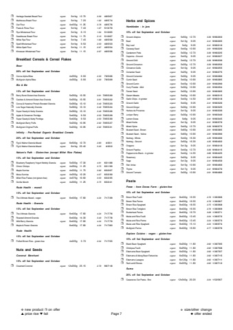 %u2752Heritage Seeded Bread Flourorganic5x1kg12.703.3940567%u2752Malthouse Bread Flourorganic5x1kg7.201.9240574%u2752Oat Flourorganic4x450g 11.353.7840576%u2752Pasta & Pizza Flourorganic5x1kg7.401.9751070%u2752Rye Wholemeal Flourorganic5x1kg6.151.6451065%u2752Seedhouse Bread Flourorganic5x1kg11.753.1351067%u2752White Rye Flourorganic5x1kg7.451.9940550%u2752Spelt Wholemeal Flourorganic5x1kg9.502.5340553%u2752White Spelt Flourorganic5x1kg11.152.9740554%u2752Khorasan Wholemeal Flourorganic5x1kg11.152.9740556Breakfast Cereals & Cereal FlakesBear20% off list September and October%u2752Cocoa Alpha Bites4x350g 6.902.3070506%u2752Multigrain Alpha Bites4x350g 6.902.3070509Bio & Me15% off list September and October%u2752Berry Burst Gluten-free Granola5x350g 13.553.61705520%u2752Cashew & Almond Gluten-free Granola5x350g 13.553.61705522%u2752Cocoa & Hazelnut Protein Boosted Granola5x360g 13.103.49705523%u2752Low Sugar Naturally Granola5x360g 13.103.49705524%u2752Super Seedy & Nutty Granola5x360g 13.103.49705526%u2752Apple & Cinnamon Porridge5x400g 9.502.53705529%u2752Super Seedy & Nutty Porridge5x400g 9.502.53705530%u2752Multigrain Berry Puffs5x200g 10.952.92705527%u2752Multigrain Original Puffs5x200g 10.952.92705531Infinity - Pre-Packed Organic Breakfast Cereals20% off list September and October%u2752Fig & Walnut Granola Muesli organic6x500g 12.702.834031%u2752Fig & Walnut Granola Muesli organic6x1kg23.405.204032Nature's Path - Gluten-free (except Millet Rice Flakes)15% off list September and October%u2752Blueberry Raspberry Yogurt Nobbly Granolaorganic5x300g 17.304.6163188%u2752Choco Chimpsorganic4x284g 11.253.7563199%u2752Maple Sunriseorganic4x332g 11.753.9263207%u2752Mesa Sunriseorganic4x355g 12.204.0763230%u2752Millet Rice Flakes (not gluten-free)organic4x375g 10.603.5363235%u2752Gorilla Munchorganic4x300g 11.253.7563241Rude Health - muesli15% off list September and October%u2752The Ultimate Muesli - veganorganic6x400g 17.804.2471739Rude Health - Granola15% off list September and October%u2752The Ultimate Granolaorganic6x400g 17.804.2471776%u2752Roasted Almond Granola6x400g 14.303.4071778%u2752Wild Berry Granolaorganic6x400g 17.804.2471779%u2752Maple & Pecan Granola6x400g 17.804.2471783Rude Health15% off list September and October%u2752Puffed Brown Rice - gluten-free4x225g 5.702.0471755Nuts and SeedsCoconut Merchant15% off list September and October%u2752Creamed Coconutorganic12x200g 25.152.7990718Herbs and SpicesHambleden - in jars15% off list September and October%u2752Ground Allspiceorganic5x50g 12.703.39990203%u2752Basilorganic5x13g 9.052.41990205%u2752Bay Leaforganic5x2g 9.052.41990210%u2752Caraway Seedorganic5x40g 10.902.91990220%u2752Cardamom Podsorganic5x30g 12.703.39990225%u2752Cayenne - Groundorganic5x45g 9.052.41990227%u2752Ground Chilliorganic5x40g 12.703.39990230%u2752Ground Cinnamonorganic5x35g 12.703.39990250%u2752Cinnamon Quillsorganic5x10g 9.052.41990255%u2752Coriander Seedorganic5x25g 9.052.41990275%u2752Ground Corianderorganic5x30g 9.052.41990280%u2752Cumin Seedorganic5x40g 10.902.91990285%u2752Ground Cuminorganic5x45g 10.902.91990290%u2752Curry Powder - Mildorganic5x30g 10.902.91990294%u2752Fennel Seedorganic5x35g 10.902.91990305%u2752Garam Masalaorganic5x40g 10.902.91990315%u2752Garlic Chips - in grinderorganic5x45g 14.503.87990318%u2752Ground Garlicorganic5x40g 9.052.41990320%u2752Ground Gingerorganic5x30g 10.902.91990325%u2752Herbes de Provenceorganic5x15g 9.052.41990330%u2752Juniper Berryorganic5x30g 10.902.91990340%u2752Lemon Grassorganic5x9g 9.052.41990345%u2752Mixed Herbsorganic5x13g 9.052.41990370%u2752Mixed Spiceorganic5x45g 12.703.39990375%u2752Mustard Seed - Brownorganic5x65g 10.902.91990385%u2752Mustard Seed - Yelloworganic5x65g 10.902.91990390%u2752Nutmeg - Wholeorganic5x40g 16.304.35990400%u2752Nutmeg - Groundorganic5x50g 16.304.35990402%u2752Oreganoorganic5x13g 9.052.41990410%u2752Ground Paprikaorganic5x40g 12.703.39990415%u2752Peppercorns Black - in grinderorganic5x40g 14.553.88990425%u2752Rosemaryorganic5x22g 9.052.41990445%u2752Sageorganic5x12g 9.052.41990450%u2752Star Aniseorganic5x15g 10.902.91990460%u2752Thymeorganic5x17g 9.052.41990470%u2752Ground Turmericorganic5x35g 10.902.91990480PastaFreee - from Doves Farm - gluten-free15% off list September and October%u2752Brown Rice Fusilliorganic8x400g 16.552.76130366%u2752Brown Rice Penneorganic8x400g 16.552.76130367%u2752Brown Rice Spaghettiorganic9x400g 18.552.75130368%u2752Brown Rice Tortiglioni organic8x400g 16.552.76130369%u2752Buckwheat Penneorganic8x400g 19.703.28130371%u2752Maize and Rice Fusilliorganic8x400g 13.452.24130372%u2752Maize and Rice Penneorganic8x400g 13.452.24130373%u2752Maize and Rice Spaghettiorganic9x400g 15.102.24130374%u2752Multigrain Penneorganic8x400g 16.602.77130376Explore Cuisine - vegan - gluten-free15% off list September and October%u2752Black Bean Spaghettiorganic6x200g 11.802.62130705%u2752Chickpea Fusilliorganic6x250g 11.802.62130708%u2752Edamame Bean Spaghettiorganic6x200g 11.802.62130707%u2752Edamame & Mung Bean Fettuccineorganic6x200g 11.802.62130715%u2752Edamame Lasagneorganic6x120g 11.802.62130711%u2752Red Lentil Elbowsorganic6x225g 11.802.62130712Suma25% off list September and October%u2752Casarecce Oat Pasta - Boxorganic12x340g 20.202.24152567%u2748new product %u2752on offer%u25b2price rise %u25bcfallPage 7%u272bsize/other change%u25c6offer ended