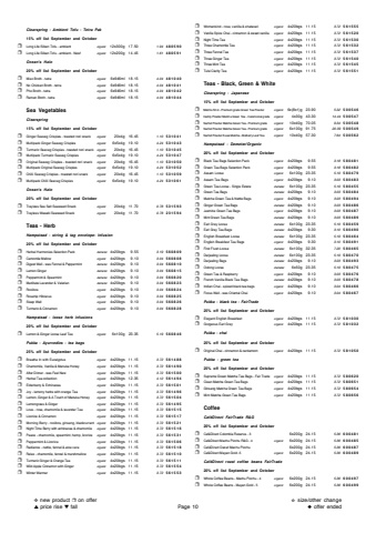 Clearspring - Ambient Tofu - Tetra Pak15% off list September and October%u2752Long Life Silken Tofu - ambientorganic12x300g 17.501.94480590%u2752Long Life Silken Tofu - ambient - New!organic12x200g 14.451.61480591Ocean's Halo20% off list September and October%u2752Miso Broth - tetraorganic6x946ml18.154.04481040%u2752No Chicken Broth - tetraorganic6x946ml18.154.04481041%u2752Pho Broth - tetraorganic6x946ml18.154.04481042%u2752Ramen Broth - tetraorganic6x946ml18.154.04481044Sea Vegetables Clearspring15% off list September and October%u2752Ginger Seaveg Crispies - toasted nori snackorganic20x4g 16.451.10531041%u2752Multipack Ginger Seaveg Crispiesorganic6x5x4g19.104.24531043%u2752Turmeric Seaveg Crispies - toasted nori snackorganic20x4g 16.451.10531045%u2752Multipack Turmeric Seaveg Crispiesorganic6x5x4g19.104.24531047%u2752Original Seaveg Crispies - toasted nori snackorganic20x4g 16.451.10531050%u2752Multipack Original Seaveg Crispiesorganic6x5x4g19.104.24531052%u2752Chilli Seaveg Crispies - toasted nori snackorganic20x4g 16.451.10531059%u2752Multipack Chilli Seaveg Crispiesorganic6x5x4g19.104.24531061Ocean's Halo20% off list September and October%u2752Trayless Sea Salt Seaweed Snack organic20x4g 11.700.78531593%u2752Trayless Wasabi Seaweed Snack organic20x4g 11.700.78231594Teas - Herb Hampstead - string & tag envelope- Infusion20% off list September and October%u2752Herbal Harmonies Selection Packdemeter4x20bgs9.553.19560809%u2752Camomile Melloworganic4x20bgs9.103.04560808%u2752Digest Well - was Fennel & Peppermint demeter4x20bgs9.103.04560810%u2752Lemon Ginger demeter4x20bgs9.103.04560815%u2752Peppermint & Spearmintdemeter4x20bgs9.103.04560820%u2752Meditate Lavender & Valeriandemeter4x20bgs9.103.04560823%u2752Rooibosorganic4x20bgs9.103.04560824%u2752Rosehip Hibiscus organic4x20bgs9.103.04560825%u2752Sleep Wellorganic4x20bgs9.103.04560826%u2752Turmeric & Cinnamonorganic4x20bgs9.103.04560828Hampstead - loose herb infusions20% off list September and October%u2752Lemon & Ginger Loose Leaf Teaorganic6x100g 23.355.19560846Pukka - Ayurvedics - tea bags25% off list September and October%u2752Breathe In with Eucalyptusorganic4x20bgs11.153.72561488%u2752Chamomile, Vanilla & Manuka Honeyorganic4x20bgs11.153.72561490%u2752After Dinner - was Feel Neworganic4x20bgs11.153.72561500%u2752Herbal Tea collectionorganic4x20bgs12.354.12561494%u2752Elderberry & Echinacea organic4x20bgs11.153.72561501%u2752Joy - lemony herbs with orange Teaorganic4x20bgs11.153.72561496%u2752Lemon, Ginger & A Touch of Manuka Honeyorganic4x20bgs11.153.72561504%u2752Lemongrass & Ginger organic4x20bgs11.153.72561495%u2752Love - rose, chamomile & lavender Teaorganic4x20bgs11.153.72561515%u2752Licorice & Cinnamonorganic4x20bgs11.153.72561517%u2752Morning Berry - rooibos, ginseng, blackcurrantorganic4x20bgs11.153.72561521%u2752Night Time Berry with echinacea & chamomileorganic4x20bgs11.153.72561516%u2752Peace - chamomile, spearmint, hemp, licoriceorganic4x20bgs11.153.72561531%u2752Peppermint & Licoriceorganic4x20bgs11.153.72561506%u2752Radiance - nettle, fennel & aloe veraorganic4x20bgs11.153.72561518%u2752Relax - chamomile, fennel & marshmallow organic4x20bgs11.153.72561510%u2752Turmeric Ginger & Orange Teaorganic4x20bgs11.153.72561511%u2752Wild Apple Cinnamon with Gingerorganic4x20bgs11.153.72561554%u2752Winter Warmerorganic4x20bgs11.153.72561553%u2752Womankind - rose, vanilla & shatavariorganic4x20bgs11.153.72561555%u2752Vanilla Spice Chai - cinnamon & sweet vanillaorganic4x20bgs11.153.72561520%u2752Night Time Teaorganic4x20bgs11.153.72561530%u2752Three Chamomile Tea organic4x20bgs11.153.72561532%u2752Three Fennel Tea organic4x20bgs11.153.72561537%u2752Three Ginger Teaorganic4x20bgs11.153.72561540%u2752Three Mint Teaorganic4x20bgs11.153.72561545%u2752Tulsi Clarity Tea organic4x20bgs11.153.72561551Teas - Black, Green & WhiteClearspring - Japanese15% off list September and October%u2752Matcha Shot - Premium grade Green Tea Powderorganic6x(8x1)g23.905.32500546%u2752Caddy Powder Matcha Green Tea - Ceremonial gradeorganic4x30g 43.3014.44500547%u2752Sachet Powder Matcha Green Tea - Premium gradeorganic10x40g 70.059.34500548%u2752Sachet Powder Matcha Green Tea - Premium gradeorganic6x100g 91.7520.39500549%u2752Sachet Powder Kuwa Matcha - Mulberry Leaf Teaorganic10x40g 57.307.64500562Hampstead - Demeter/Organic 20% off list September and October%u2752Black Tea Bags Selection Pack organic4x20bgs9.553.18580481%u2752Green Tea Bags Selection Pack organic4x20bgs9.553.18580482%u2752Assam Looseorganic6x100g 23.355.19580479%u2752Assam Tea Bagsorganic4x20bgs9.103.03580483%u2752Green Tea Loose - Single Estatedemeter6x100g 23.355.19580455%u2752Green Tea Bagsdemeter4x20bgs9.103.03580484%u2752Matcha Green Tea & Nettle Bagsorganic4x20bgs9.103.03580494%u2752Ginger Green Tea Bags demeter4x20bgs9.103.03580486%u2752Jasmine Green Tea Bags organic4x20bgs9.103.03580487%u2752Mint Green Tea Bagsdemeter4x20bgs9.103.03580489%u2752Earl Grey Loosedemeter6x100g 23.355.19580459%u2752Earl Grey Tea Bagsdemeter4x20bgs9.303.10580490%u2752English Breakfast Loosedemeter6x100g 23.355.19580464%u2752English Breakfast Tea Bagsorganic4x20bgs9.303.10580491%u2752First Flush Loosedemeter6x100g 32.357.20580465%u2752Darjeeling Loosedemeter6x100g 23.355.19580470%u2752Darjeeling Bagsdemeter4x20bgs9.103.03580493%u2752Oolong Loose demeter6x50g 23.355.19580475%u2752Green Tea & Raspberryorganic4x20bgs9.103.03580476%u2752French Vanilla Black Tea Bagsdemeter4x20bgs9.103.03580478%u2752Indian Chai - spiced black tea bagsorganic4x20bgs9.103.04580466%u2752Focus Well - was Oriental Chaiorganic4x20bgs9.103.04580467Pukka - black tea - FairTrade 25% off list September and October%u2752Elegant English Breakfastorganic4x20bgs11.153.72581030%u2752Gorgeous Earl Greyorganic4x20bgs11.153.72581032Pukka - chai 25% off list September and October%u2752Original Chai - cinnamon & cardamomorganic4x20bgs11.153.72581050Pukka - green tea25% off list September and October%u2752Supreme Green Matcha Tea Bags - Fair Tr