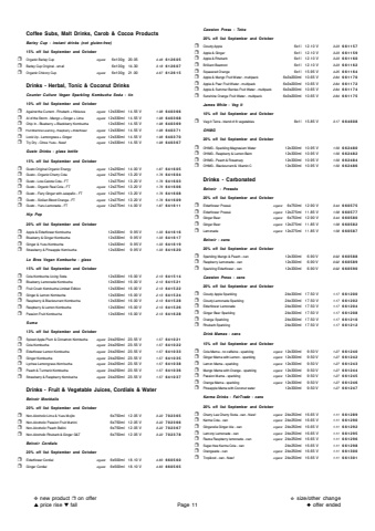Coffee Subs, Malt Drinks, Carob & Cocoa ProductsBarley Cup - instant drinks (not gluten-free)15% off list September and October%u2752Organic Barley Cup organic6x100g 20.054.46612605%u2752Barley Cup Original - small6x100g 14.303.18612607%u2752Organic Chicory Cuporganic6x100g 21.004.67612615Drinks - Herbal, Tonic & Coconut DrinksCounter Culture Vegan Sparkling Kombucha Soda - tin10% off list September and October%u2752Against the Current - Rhubarb + Hibiscusorganic12x330ml14.55 V1.98640366%u2752AI of the Storm - Mango + Ginger + Limeorganic12x330ml14.55 V1.98640368%u2752Chip In - Blueberry + Blackberry Kombucha12x330ml14.55 V1.98640369%u2752Fruit Machine Learning - Raspberry + Elderflowerorganic12x330ml14.55 V1.98640371%u2752Look Up - Lemongrass + Gingerorganic12x330ml14.55 V1.98640370%u2752Try Dry - Citrus Yuzu - New!organic12x330ml14.55 V1.98640367Gusto Drinks - glass bottle15% off list September and October%u2752Gusto Original Organic Energyorganic12x250ml14.00 V1.87641605%u2752Gusto - Organic Cherry Colaorganic12x275ml13.20 V1.76641604%u2752Gusto - Low-Calorie Cola - FT12x275ml13.20 V1.76641603%u2752Gusto - Organic Real Cola - FTorganic12x275ml13.20 V1.76641606%u2752Gusto - Fiery Ginger with Jalape%u00f1o - FTorganic12x275ml13.20 V1.76641608%u2752Gusto - Sicilian Blood Orange - FTorganic12x275ml13.20 V1.76641609%u2752Gusto - Yuzu Lemonade - FTorganic12x275ml14.00 V1.87641611Hip Pop20% off list September and October%u2752Apple & Elderflower Kombucha12x330ml9.95 V1.33641616%u2752Blueberry & Ginger Kombucha12x330ml9.95 V1.33641617%u2752Ginger & Yuzu Kombucha12x330ml9.95 V1.33641619%u2752Strawberry & Pineapple Kombucha12x330ml9.95 V1.33641620Lo Bros Vegan Kombucha - glass15% off list September and October%u2752Cola Kombucha Living Soda12x330ml16.00 V2.13641514%u2752Blueberry Lemonade Kombucha12x330ml16.00 V2.13641521%u2752Fruit Crush Kombucha Limited Edition12x330ml16.00 V2.13641522%u2752Ginger & Lemon Kombucha12x330ml16.00 V2.13641524%u2752Raspberry & Blackcurrant Kombucha12x330ml16.00 V2.13641528%u2752Raspberry & Lemon Kombucha12x330ml16.00 V2.13641526%u2752Passion Fruit Kombucha12x330ml16.00 V2.13641628Suma13% off list September and October%u2752Spiced Apple Plum & Cinnamon Kombuchaorganic24x250ml23.55 V1.57641021%u2752Cola Kombuchaorganic24x250ml23.55 V1.57641022%u2752Elderflower Lemon Kombuchaorganic24x250ml23.55 V1.57641033%u2752Ginger Kombuchaorganic24x250ml23.55 V1.57641035%u2752Lychee Lemongrass Kombuchaorganic24x250ml23.55 V1.57641038%u2752Peach & Turmeric Kombuchaorganic24x250ml23.55 V1.57641036%u2752Strawberry & Raspberry Kombuchaorganic24x250ml23.55 V1.57641037Drinks - Fruit & Vegetable Juices, Cordials & WaterBelvoir Mocktails 20% off list September and October%u2752Non-Alcoholic Lime & Yuzu Mojito6x750ml12.05 V3.22702365%u2752Non-Alcoholic Passion Fruit Martini6x750ml12.05 V3.22702366%u2752Non-Alcoholic Peach Bellini6x750ml12.05 V3.22702367%u2752Non-Alcoholic Rhubarb & Ginger G&T6x750ml12.05 V3.22702378Belvoir Cordials20% off list September and October%u2752Elderflower Cordialorganic6x500ml18.10 V4.83660560%u2752Ginger Cordialorganic6x500ml18.10 V4.83660565Cawston Press - Tetra20% off list September and October%u2752Cloudy Apple6x1l12.10 V3.23661157%u2752Apple & Ginger6x1l12.10 V3.23661159%u2752Apple & Rhubarb6x1l12.10 V3.23661160%u2752Brilliant Beetroot6x1l12.10 V3.23661162%u2752Squeezed Orange6x1l15.95 V4.25661164%u2752Apple & Mango Fruit Water - multipack6x3x200ml10.65 V2.84661170%u2752Apple & Pear Fruit Water - multipack6x3x200ml10.65 V2.84661172%u2752Apple & Summer Berries Fruit Water - multipack6x3x200ml10.65 V2.84661174%u2752Sunshine Orange Fruit Water - multipack6x3x200ml10.65 V2.84661175James White - Veg It 10% off list September and October%u2752Veg-It Tetra - blend of 8 vegetables8x1l15.85 V3.17664608OHMG20% off list September and October%u2752OHMG - Sparkling Magnesium Water12x330ml10.95 V1.59662480%u2752OHMG - Raspberry & Lemon Balm12x330ml10.95 V1.59662482%u2752OHMG - Peach & Rosemary12x330ml10.95 V1.59662484%u2752OHMG - Blackcurrant & Vitamin C12x330ml10.95 V1.59662486Drinks - CarbonatedBelvoir - Press%u00e9s20% off list September and October%u2752Elderflower Press%u00e9organic6x750ml12.90 V3.44660575%u2752Elderflower Press%u00e9organic12x275ml11.85 V1.58660577%u2752Ginger Beerorganic6x750ml12.90 V3.44660580%u2752Ginger Beerorganic12x275ml11.85 V1.58660582%u2752Lemonade organic12x275ml11.85 V1.58660587Belvoir - cans20% off list September and October%u2752Sparkling Mango & Peach - can12x330ml6.90 V0.92660588%u2752Raspberry Lemonade - can12x330ml6.90 V0.92660589%u2752Sparkling Elderflower - can12x330ml6.90 V0.92660590Cawston Press - cans20% off list September and October%u2752Cloudy Apple Sparkling24x330ml17.50 V1.17661200%u2752Cloudy Lemonade Sparkling24x330ml17.50 V1.17661202%u2752Elderflower Lemonade24x330ml17.50 V1.17661204%u2752Ginger Beer Sparkling24x330ml17.50 V1.17661208%u2752Orange Sparkling24x330ml17.50 V1.17661210%u2752Rhubarb Sparkling24x330ml17.50 V1.17661212Drink Mamas - cans15% off list September and October%u2752Cola Mama - no caffeine - sparklingorganic12x330ml9.50 V1.27661240%u2752Ginger Mama with Lemon - sparklingorganic12x330ml9.50 V1.27661242%u2752Lemon Mama - sparklingorganic12x330ml9.50 V1.27661243%u2752Mango Mama with Orange - sparklingorganic12x330ml9.50 V1.27661244%u2752Passion Mama - sparklingorganic12x330ml9.50 V1.27661245%u2752Orange Mama - sparklingorganic12x330ml9.50 V1.27661246%u2752Pineapple Mama with Coconut water12x330ml9.50 V1.27661247Karma Drinks - FairTrade - cans20% off list September and October%u2752Cherry Lee Cherry Soda - can - New!organic24x250ml16.65 V1.11661289%u2752Karma Cola - canorganic24x250ml16.65 V1.11661290%u2752Gingerella Ginger Ale - canorganic24x250ml16.65 V1.11661292%u2752Lemony Lemonade - canorganic24x250ml16.65 V1.11661295%u2752Razza Raspberry lemonade - canorganic24x250ml16.65 V1.11661296%u2752Sugar-free Karma Cola - can24x250ml16.65 V1.11661298%u2752Orangeade - canorganic24x250ml16.65 V1.11661300%u2752