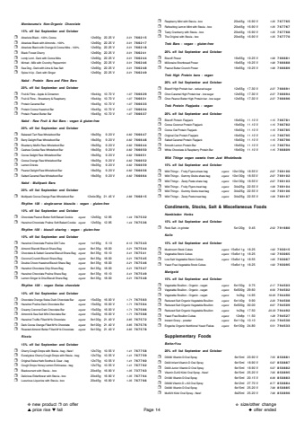 Montezuma's Non-Organic Chocolate15% off list September and October%u2752Absolute Black - 100% Cocoa12x90g 22.25 V3.01766215%u2752Absolute Black with Almonds - 100%12x90g 22.25 V3.01766217%u2752Absolute Black with Orange & Cocoa Nibs - 100%12x90g 22.25 V3.01766218%u2752Black Forest Cherry12x90g 22.25 V3.01766241%u2752Lordy Lord - Dark with Cocoa Nibs 12x90g 22.25 V3.01766244%u2752Minted - Milk with Crunchy Peppermint 12x90g 22.25 V3.01766246%u2752Sea Dog - Dark with Lime & Sea Salt 12x90g 22.25 V3.01766248%u2752Spice It Up - Dark with Ginger 12x90g 22.25 V3.01766249Nakd - Protein Bars and Fibre Bars20% off list September and October%u2752Fruit & Fibre - Apple & Cinnamon16x44g 10.70 V1.07766629%u2752Fruit & Fibre - Strawberry & Raspberry16x44g 10.70 V1.07766631%u2752Protein Caramel Bar16x45g 10.70 V1.07766633%u2752Protein Cocoa Hazelnut Bar16x45g 10.70 V1.07766634%u2752Protein Peanut Butter Bar16x45g 10.70 V1.07766637Nakd - Raw Fruit & Nut Bars - vegan & gluten-free20% off list September and October%u2752Bakewell Tart Raw Wholefood Bar 18x35g 9.20 V0.82766647%u2752Berry Delight Raw Wholefood Bar 18x35g 9.20 V0.82766648%u2752Blueberry Muffin Raw Wholefood Bar18x35g 9.20 V0.82766644%u2752Cashew Cookie Raw Wholefood Bar18x35g 9.20 V0.82766650%u2752Cocoa Delight Raw Wholefood Bar18x35g 9.20 V0.82766651%u2752Cocoa Orange Raw Wholefood Bar 18x35g 9.20 V0.82766652%u2752Lemon Drizzle18x35g 9.20 V0.82766659%u2752Peanut Delight Raw Wholefood Bar18x35g 9.20 V0.82766656%u2752Salted Caramel Raw Wholefood Bar18x35g 9.20 V0.82766664Nakd - Multipack Bars20% off list September and October%u2752Multipack Cocoa Orange Raw Wholefood Bar 12x4x35g21.45 V2.86766815Rhythm 108 - single-serve biscuits - vegan - gluten-free 10% off list September and October%u2752Chocolate Peanut Butter Soft Baked Cookie organic12x50g 12.951.44767532%u2752Hazelnut Chocolate Praline Soft Baked Cookieorganic12x50g 12.951.44767536Rhythm 108 - biscuit sharing - vegan - gluten-free 10% off list September and October%u2752Hazelnut Chocolate Praline Gift Tubeorganic1x195g 6.108.13767543%u2752Almond Biscotti Biscuit Share Bagorganic8x135g 18.003.21767544%u2752Chocolate & Salted Caramel Biscuit Share Bagorganic8x135g 19.103.41767541%u2752Coconut Crunch Biscuit Share Bagorganic8x135g 18.003.21767545%u2752Double Choco Hazelnut Biscuit Share Bagorganic8x135g 18.003.21767546%u2752Hazelnut Chocolate Chip Share Bagorganic8x135g 18.003.21767547%u2752Hazelnut Chocolate Praline Share Bagorganic8x135g 19.103.41767549%u2752Lemon Ginger & Chia Biscuit Share Bagorganic8x135g 18.003.21767548Rhythm 108 - vegan Swiss chocolate10% off list September and October%u2752Chocolate Orange Swiss Dark Chocolate Barorganic15x33g 16.00 V1.71767563%u2752Hazelnut Praline Dark Chocolate Barorganic15x33g 16.00 V1.71767564%u2752Creamy Coconut Dark Chocolate Barorganic15x33g 16.00 V1.71767566%u2752Almond & Sea Salt M'lk Chocolate Barorganic15x33g 16.00 V1.71767568%u2752Hazelnut Truffle Filled M*lk Chocolateorganic9x100g 21.40 V3.85767572%u2752Dark Cocoa Orange Filled M*lk Chocolateorganic9x100g 21.40 V3.85767576%u2752Roasted Almond Butter Filled M*lk Chocolateorganic9x100g 21.40 V3.85767578Ricola15% off list September and October%u2752Cherry Cough Drops with Stevia - bag - New!12x70g 10.55 V1.41767758%u2752Eucalyptus Cherry Cough Drops with Stevia - bag12x70g 10.55 V1.41767759%u2752Original Swiss Herb Soothe & Clear - bag12x75g 10.55 V1.41767760%u2752Cough Drops Honey Lemon Echinacea - bag12x75g 10.55 V1.41767762%u2752Blackcurrant with Stevia - box20x45g 16.90 V1.35737763%u2752Delicious Elderflower with Stevia - box20x45g 16.90 V1.35767764%u2752Luxurious Liquorice with Stevia - box20x45g 16.90 V1.35767766%u2752Raspberry Mint with Stevia - box20x45g 16.90 V1.35767765%u2752Refreshing Lemon Mint with Stevia - box20x45g 16.90 V1.35767767%u2752Tasty Cranberry with Stevia - box20x45g 16.90 V1.35767768%u2752The Original with Stevia - box20x45g 16.90 V1.35767770Trek Bars - vegan - gluten-free20% off list September and October%u2752Biscoff Power16x55g 19.25 V1.96766681%u2752Millionaire Shortbread Power16x55g 19.25 V1.96766688%u2752Peanut Butter Crunch Power16x55g 19.25 V1.96766689Trek High Protein bars - vegan20% off list September and October%u2752Biscoff High Protein bar - reduced sugar12x55g 17.30 V2.37766691%u2752Choc Caramel High Protein bar - low sugar12x55g 17.30 V2.37766694%u2752Choc Peanut Butter High Protein bar - low sugar12x55g 17.30 V2.37766696Trek Protein Flapjacks - vegan20% off list September and October%u2752Biscoff Protein Flapjack16x50g 11.10 V1.15766781%u2752Cocoa Coconut Protein Flapjack 16x50g 11.10 V1.15766782%u2752Cocoa Oat Protein Flapjack 16x50g 11.10 V1.15766785%u2752Original Oat Protein Flapjack 16x50g 11.10 V1.15766795%u2752Salted Caramel Protein Flapjack 16x50g 11.10 V1.15766796%u2752Smooth Lemon Protein Bar16x50g 11.10 V1.15766794%u2752White Chocolate & Raspberry Protein Bar16x50g 11.10 V1.15766809Wild Thingz vegan sweets from Just Wholefoods15% off list September and October%u2752Wild Thingz - Fruity Flyers share bagorganic10x130g 18.55 V2.97769100%u2752Wild Thingz - Gummy Grubs share bagorganic10x130g 18.55 V2.97769102%u2752Wild Thingz - Zesty Pests share bagorganic10x130g 18.55 V2.97769103%u2752Wild Thingz - Fruity Flyers treat bagorganic34x25g 22.55 V1.06769104%u2752Wild Thingz - Gummy Grubs treat bagorganic34x25g 22.55 V1.06769106%u2752Wild Thingz - Zesty Pests treat bagorganic34x25g 22.55 V1.06769107Condiments, Stocks, Salt & Miscellaneous Foods Hambleden Herbs15% off list September and October%u2752Rock Salt - in grinder5x120g 9.452.52791680Kallo15% off list September and October%u2752Mushroom Stock Cubes organic15x6x11g18.251.62793015%u2752Vegetable Stock Cubes organic15x6x11g18.251.62793065%u2752Low Salt Vegetable Stock Cubes organic15x6x11g18.551.65793067%u2752Yeast Free Vegetable Stock Cubes 15x6x11g18.251.62793095Marigold15% off list September and October%u2752Vegetable Bouillon - Organic - veganorganic6x150g 9.752.17794503%u2752Vegetable 