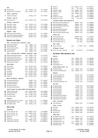 IBIS%u25c6Bean & Rice Cakeorganic12x130g 17.901.99173339%u25c6Bean & Rice Cake - with Kep sea saltorganic12x130g 17.901.99173341Orgran - gluten-free%u272bToasted Corn Crispibread6x125g 13.452.99172007Profusion - long life%u25c6Hemp Sorghum Thinsorganic12x120g 24.202.69175555Profusion - gluten-free%u25c6Cracker Bites - chickpeaorganic8x150g 19.753.29175886%u25c6Cracker Bites - red lentilorganic8x150g 19.753.29175558%u25c6Protein Cakes - chickpeaorganic12x100g 22.402.49175560%u25c6Protein Cakes - red lentilorganic12x100g 22.402.49175562Seggiano - vegan%u25c6Classic Lingue Handmade Flatbreads12x120g 39.154.35176240%u25c6Tropea Onion Lingue Handmade Flatbreads12x120g 44.054.89176241%u25c6Rosemary Lingue Handmade Flatbreads12x120g 39.154.35176242Biscuits and CakesFreee - from Doves Farm - gluten-free - vegan%u25c6Apple Oat Bar with Sultanasorganic18x35g 11.500.85181452%u25c6Apricot Oat Bar with Chiaorganic18x35g 11.500.85181455%u25c6Banana & Chocolate Oat Barsorganic18x35g 11.500.85181453%u25c6Chocolate Chip Oat Barorganic18x35g 11.500.85181460%u25c6Cranberry Oat Barsorganic18x35g 11.500.85181461Freee - from Doves Farm - multipacks - gluten-free - vegan%u25c6Multipack Apple Oat Bar with Sultanasorganic7x4x35g14.652.79181470%u25c6Multipack Apricot Oat Bar with Chiaorganic7x4x35g14.652.79181472%u25c6Multipack Banana & Chocolate Oat Barsorganic7x4x35g14.652.79181473%u25c6Multipack Chocolate Chip Oat Barorganic7x4x35g14.652.79181477%u25c6Multipack Cranberry Oat Barsorganic7x4x35g14.652.79181478Island Bakery%u25c6Apple Crumblesorganic12x125g 35.353.93182940%u25c6Chocolate Gingersorganic12x133g 37.05 V4.94182946%u25c6Lime Meltsorganic12x133g 37.05 V4.94182950%u25c6Lemon Meltsorganic12x133g 37.05 V4.94182952%u25c6Oat Crumblesorganic12x125g 29.803.31182954%u25c6Orange Meltsorganic12x133g 37.05 V4.94182956%u25c6Shortbreadorganic12x125g 29.803.31182957Nairn's Oat Biscuits - wheat-free%u25c6Chocolate Orange Oat Biscuits6x200g 9.002.01182391%u25c6Coconut & Chia Oat Biscuits10x200g 15.002.01182393%u25c6Mixed Berries Oat Biscuits10x200g 15.002.01182387%u25c6Stem Ginger Oat Biscuits10x200g 15.002.01182390%u25c6Dark Chocolate Chip Oat Biscuits8x200g 12.002.01182392Sweet FA gluten free vegan cookies from Island Bakery%u25c6Cranberry & Orange Cookiesorganic12x125g 32.903.66182480%u25c6Double Choc Chip Cookiesorganic12x125g 32.903.66182482%u25c6Oat & Raisin Cookiesorganic12x125g 32.903.66182484%u25c6Peanut Butter Cookiesorganic12x125g 32.903.66182486Seggiano%u25b2Buckwheat Digestive Biscuits - gluten-freeorganic6x150g 21.204.71182490%u25b2Kamut Digestive Biscuits - veganorganic6x170g 21.204.71182492%u25b2Spelt Digestive Biscuitsorganic6x150g 21.204.71182494Oils & FatsClearspring%u25c6Olive Oil - Extra Virgin - Italyorganic8x250ml44.907.49200500%u25c6Olive Oil - Extra Virgin - Italyorganic6x500ml58.4512.99200502%u25c6Olive Oil - Extra Virgin - Italyorganic6x1l103.4522.99200503%u25c6Rapeseed Oilorganic6x500ml22.004.89200511%u25c6Rapeseed Oilorganic6x1l35.957.99200509%u25c6Tunisian Olive Oil - Extra Virginorganic6x500ml44.959.99200515%u25c6Tunisian Olive Oil - Extra Virginorganic6x1l76.4516.99200516%u25c6Sesame Oilorganic6x500ml37.758.39200517%u25c6Sesame Oilorganic6x1l69.7015.49200518%u25c6Sesame Oil - Toastedorganic8x250ml35.905.98200520%u25c6Sesame Oil - Toastedorganic6x500ml44.959.99200522%u25c6Sunflower Oilorganic6x500ml20.204.49200525%u25c6Sunflower Oilorganic6x1l33.707.49200527%u25c6Sunflower Oil - for Fryingorganic6x500ml21.554.79200530%u25c6Sunflower Oil - for Fryingorganic6x1l35.057.79200532Farrington's Mellow Yellow Rapeseed Oil%u25c6Mellow Yellow Cold Pressed Rapeseed Oil6x500ml19.654.37200633%u25c6Mellow Yellow Blackberry Vinaigrette6x250ml15.403.42200639%u25c6Mellow Yellow Balsamic Vinegar Dressing6x250ml15.403.42200634%u25c6Mellow Yellow Chilli Oil6x250ml14.703.27200635%u25c6Mellow Yellow Ultimate Chilli Dressing6x250ml15.403.42200636%u25c6Mellow Yellow Classic Vinaigrette6x250ml15.403.42200637%u25c6Mellow Yellow Honey & Mustard Dressing6x250ml15.403.42200638Hellenic Sun%u25bcOlive Oil Greek Extra Virgin12x500ml65.457.27210510%u25bcOlive Oil Greek Extra Virgin12x750ml89.309.92210511%u25bcOlive Oil Greek Extra Virgin - tin1x3l28.3537.80210520%u25bcOlive Oil Greek Extra Virgin - tin1x5l46.6562.20210525Mani - Greek%u25c6Olive Oil - Extra Virginorganic3l38.60 12.87200583Mr Organic - in glass%u25b2Olive Oil - Extra Virgin - cold pressedorganic12x1l200.7022.30200954Nut Butter, P%u00e2t%u00e9, Spreads & JamBionova%u25b2Apricot Jamorganic6x340g 18.554.12290705%u25b2Bilberry Jamorganic6x340g 24.355.42290720%u25b2Raspberry Jamorganic6x340g 26.555.91290727%u25b2Strawberry Jamorganic6x340g 24.355.42290735%u25b2Orange Marmalade - mildorganic6x340g 18.554.13290750Carley's Organic Foods - raw%u25b2Raw Mixed Seed Butterorganic6x250g 19.354.45250243%u25b2Raw Premium Pumpkinseed Butterorganic6x250g 31.557.26250247Meridian%u25c6Crunchy Almond Butter 100%6x170g 14.803.29251502%u25c6Smooth Almond Butter 100%6x170g 14.803.29251503%u25c6Smooth Cashew Butter6x170g 17.303.84251515%u25c6Crunchy Cashew Butter6x170g 17.303.84251516%u25c6Protein Smooth Peanut Butter 100%3x700g 16.407.30251611Pip & Nut%u25b2Smooth Almond Butter3x1kg42.5018.89251640%u25b2Smooth Almond Butter6x170g 17.453.88251642%u25b2Crunchy Peanut Butter3x1kg19.658.73251644%u25b2Crunchy Peanut Butter6x300g 17.303.84251646%u25b2Smooth Peanut Butter3x1kg19.658.73251648%u25b2Smooth Peanut Butter6x300g 17.303.84251650%u25b2Sweet Salty Crunchy Peanut Butter6x300g 17.303.84251652%u25b2Sweet Salty Smooth Peanut Butter3x1kg19.658.73251654%u25b2Sweet Salty Smooth Peanut Butter6x300g 17.303.84251656Suma - fruit spread%u25b2Pear & Apple Spread12x300g 33.003.67292505Tartex - in tubes%u25c6Classic P%u00e2t%u00e9organic12x200g 34.903.88262105%u25c6Herb P%u00e2t%u00e9organic12x200g 34.903.88262120%u25c6Herb & Garlic P%u00e2t%u00e9organic12x200g 34.903.88262125%u25c6Mushroom P%u00e2t%u00e9organic12x200g 34.903.88262130Whole Earth%u25c6Peanut Butter Crunchy - smallorganic6x227g
