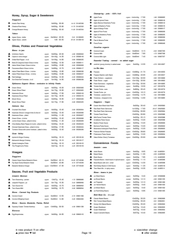 Honey, Syrup, Sugar & Sweeteners Seggiano%u25c6Acacia Raw Honey6x500g 63.6014.13314530%u25c6Chestnut Raw Honey6x500g 52.8011.73314532%u25c6Orange Blossom Honey6x500g 50.4011.20314534Yakso%u25b2Agave Syrup - bottleorganic6x240ml26.555.91313605%u25b2Agave Syrup - plasticorganic1x5l65.5587.45313610Olives, Pickles and Preserved VegetablesBiona - in jars%u25b2Artichoke Heartsorganic6x200g 22.004.89350602%u25c6Capers in wine vinegarorganic6x140g 14.353.19350616%u25c6Grilled Red Pepper - in oilorganic5x190g 14.603.89350635%u25c6Bella Di Cerignola Green Olives in brineorganic5x280g 12.303.28350611%u25c6Italian Sliced Green Olives in brineorganic5x280g 13.853.69350609%u25c6Peranzana Black Olives in brineorganic5x280g 12.703.39350617%u25c6Italian Pitted Black Olives - in brineorganic5x280g 13.853.69350636%u25c6Italian Pitted Green Olives - in brineorganic5x280g 13.853.69350637%u25b2Red Cabbagedemeter6x350g 10.302.29350624%u25c6Sun Dried Soft Tomatoes - in oilorganic5x190g 14.953.99350638Epikouros Organic Olives - exclusive to Infinity Foods%u25c6Green Olivesorganic6x200g 16.003.56350300%u25c6Green Olives Pittedorganic6x170g 16.953.77350305%u25c6Kalamata Olivesorganic6x200g 17.603.91350310%u25c6Kalamata Olives Pittedorganic6x170g 18.554.12350315%u25c6Mixed Olivesorganic6x200g 16.953.77350320%u25c6Mixed Olives Pittedorganic6x170g 17.903.98350325Hellenic Sun%u25c6Crushed Olive Saladorganic6x330g 13.452.99352004%u25c6Kalamata Olives in vinegar brine & olive oilorganic6x330g 13.452.99352006%u25c6Kalamata Olives - pitted6x330g 11.202.49352007%u25c6Green Olives - in brineorganic6x330g 13.452.99352008%u25c6Jumbo Green Olives - pitted in brine6x330g 11.202.49352009%u25c6Olive Medley Black Pepper & Cumin - pitted in brine6x330g 13.452.99352023%u25c6Smoked Kalamata Olives - pitted in brine 6x330g 17.953.99352024%u25c6Turmeric Olives with Lemon Verbena - pitted in brine 6x330g 13.452.99352026Ouse Valley%u25bcApricot & Ginger Chutney6x220g 19.104.25351916%u25bcMaharani's Mango Chutney6x215g 19.104.25351917%u25bcSpiced Aubergine Pickle6x190g 19.104.25351915%u25bcThe Ploughman's Pickle6x215g 19.104.25351919Vinegars Seggiano%u25c6Classic Super Dense Balsamic Glazeorganic6x250ml46.1510.26371638%u25c6Fig Super Dense Balsamic Glaze6x250ml43.809.73371639%u25c6Balsamic Modena Vinegarorganic12x250ml47.355.26371640Sauces, Fruit and Vegetable ProductsAmaizin Mexican%u25b2Taco Seasoning - packetorganic12x27g 15.451.72389886%u25b2Jalape%u00f1o Peppers - jarorganic6x170g 15.353.42389890%u25b2Taco Sauce Hotorganic6x220g 13.753.06389892%u25b2Taco Sauce Mildorganic6x220g 13.753.06389894Biona - Canned Veg Products %u25b2Coconut Creamorganic6x400ml12.552.79390198%u25b2Coconut Whipping Creamorganic6x400ml14.803.29390200Biona - Sauces. Mustards, Pastes, Relish %u25b2Squeezy Classic Tomato Ketchuporganic12x560g 39.504.39390138Bionova%u25b2Egg Mayonnaiseorganic6x300g 24.655.48390215Clearspring - pots - 100% fruit%u25c6Apple Pur%u00e9eorganic12x2x100g17.901.99390605%u25c6Apple & Apricot Pur%u00e9eorganic12x2x100g17.901.99390610%u25c6Apple Banana Strawberry Pur%u00e9eorganic12x2x100g17.901.99390612%u25c6Apple & Blueberry Pur%u00e9eorganic12x2x100g17.901.99390615%u25c6Apple & Mango Pur%u00e9eorganic12x2x100g17.901.99390617%u25c6Apple & Plum Pur%u00e9eorganic12x2x100g17.901.99390620%u25c6Apple & Strawberry Pur%u00e9eorganic12x2x100g17.901.99390625%u25c6Pear Pur%u00e9eorganic12x2x100g17.901.99390630%u25c6Pear & Banana Pur%u00e9eorganic12x2x100g17.901.99390635%u25c6Prune Pur%u00e9eorganic12x2x100g17.901.99390640Cocofina organic%u25c6Coconut Creamorganic6x400ml9.152.03390735%u25c6Coconut Milkorganic6x400ml7.801.73390736%u25c6Coconut Milk Lightorganic6x400ml7.401.64390737Essential Trading - canned - no added sugar%u25c6Jackfruit (young chunks) in salted waterorganic6x400g 12.552.79391207La Bio Idea %u25b2Passataorganic12x680g 21.702.41391655%u25b2Passata Basilico (with Basil)organic12x680g 22.952.55391657%u25b2Pesto Siciliano - vegetarianorganic12x130g 32.903.66391660%u25b2Pesto Rosso - veganorganic12x130g 32.903.66391662%u25b2Pesto Genovese - vegetarianorganic12x130g 32.903.66391665%u25b2Tomato Ketchuporganic6x480g 18.304.07391670%u25b2Tomato Pur%u00e9e - cans organic6x890g 26.455.88391672%u25b2Tomato Pur%u00e9e - jarorganic12x200g 18.152.02391673%u25b2Tomatoes - peeled in tinsorganic12x400g 14.751.64391680%u25b2Tomatoes - chopped in tinsorganic12x400g 14.601.62391685Seggiano - Vegan%u25c6Cavalo Nero Black Kale Pesto6x200g 30.406.76392582%u25c6Raw Basil Pesto Genovese1x1000g 17.6023.47392583%u25c6Raw Basil Pesto Genovese12x200g 60.806.76392584%u25c6Tomato Pesto Rosso12x200g 60.806.76392586%u25b2Wild Fennel Tomato Pesto6x220g 25.155.59392588%u25c6Arrabbiata Pasta Sauceorganic6x350g 15.203.38392598%u25c6Basilico Pasta Sauceorganic6x350g 15.203.38392600%u25c6Marinara Pasta Sauceorganic6x350g 15.203.38392602%u25c6Melanzane Aubergine Pasta Sauceorganic6x350g 15.203.38392603%u25c6Premium Sicilian Passataorganic12x500g 28.803.20392605%u25c6Puttanesca Pasta Sauceorganic6x350g 15.203.38392604%u25c6Salsa Sicilian Cherry Tomatoesorganic12x330g 25.602.84392606Convenience FoodsAmaizin - cans%u25b2Aduki Beansorganic6x400g 8.651.92440501%u25b2Baked Beansorganic6x400g 11.652.59440503%u25b2Black Beans organic6x400g 7.851.74440505%u25b2Feijoada Beans - black beans in spiced sauceorganic6x400g 11.102.47440506%u25b2Mixed Beans with corn - smallorganic12x200g 14.301.59440508%u25b2Red Kidney Beans in Chilli Sauce organic6x400g 11.202.49440510%u25b2Taco Bean Mix - in spicy sauceorganic6x400g 10.352.30440511Biona - beans in jars%u25b2Jar Black Beansorganic6x350g 9.402.09350608%u25b2Jar Broad Beansdemeter6x350g 12.10 2.69390155%u25b2Jar Flageoletorganic6x350g 12.102.69390160%u25b2Jar Haricot Beansorganic6x350g 9.402.09390163%u25b2Jar Mixed Beansorganic6x350g 9.402.09390162%u25b2Jar Red Kidney Beansorganic6x350g 9.852.19390165Bold Bean Co. - in a jar%u25c6Classic Baked Beans12x325g 35.203.91390260%u25c6Rich Tomato Baked Beans12x325g 35.203.91390261%u25c6Smoky Chili