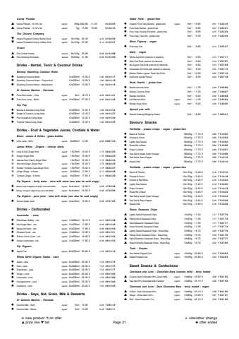 Cocoa Powder%u25b2Cocoa Powder - 10-12% fatorganic25kg280.80 11.23612005%u25b2Cocoa Powder - 10-12% fatorganic1kg15.90 15.90612010The Chicory Company%u25bcInstant Roasted Chicory Barley Drinkorganic6x100g 20.454.54612856%u25bcInstant Roasted Chicory Coffee Drinkorganic6x100g 27.656.14612857Vivani%u25b2Fine Cocoa Powderdemeter8x100g 23.853.98613498%u25b2Fine Drinking Chocolatedemeter8x300g 41.906.98613499Drinks - Herbal, Tonic & Coconut DrinksBonsoy Sparkling Coconut Water%u25c6Sparkling Coconut Water12x250ml13.50 V1.80641017%u25c6Sparkling Coconut Water - Passionfruit12x250ml13.50 V1.80641018%u25c6Sparkling Coconut Water - Watermelon12x250ml13.50 V1.80641019Dr Antonio Martins - Fairtrade%u25c6Pure Coco Juice - 1 litreorganic6x1l18.70 V4.99641441%u25c6Pure Coco Juice - 330mlorganic15x330ml27.05 V2.89641442Hip Pop%u25c6Berries & Cherries Living Soda12x330ml12.45 V1.66641634%u25c6Ginger & Turmeric Living Soda12x330ml12.45 V1.66641627%u25c6Pink Grapefruit Living Soda12x330ml12.45 V1.66641624%u25c6Tropical Peach Living Soda12x330ml12.45 V1.66641625Drinks - Fruit & Vegetable Juices, Cordials & WaterBiona Juices & Drinks - glass bottles%u25c6Lime Juice -100%organic6x200ml13.452.99660724James White - Zingers - intense shots%u272bLime & Chilli Zinger Shot organic15x70ml16.40 V1.75664620%u272bGinger Zinger Shotorganic15x70ml16.40 V1.75664622%u272bIntense Sour Cherry Zinger Shot 15x70ml16.40 V1.75664624%u272bXtra Hot Ginger Zinger Shotorganic15x70ml16.40 V1.75664625%u272bGolden Turmeric Juice Zinger Shot organic15x70ml16.40 V1.75664627%u272bGinger Zinger - 5 Shotsorganic6x330ml17.65 V4.71664628%u272bTurmeric Zinger - 5 Shotsorganic6x330ml17.65 V4.71664630Pip Organic - fruity water - tetra with straw (can also be sold singly)%u25c6Blackcurrant, Raspberry & Apple Juice with Waterorganic6x4x180ml19.05 V5.08472698%u25c6Mango, Orange & Apple Fruity Juice with Waterorganic6x4x180ml19.05 V5.08472699Pip Organic - pure juice - tetra with straw (can also be sold singly)%u25c6Cloudy Apple Juice organic6x4x180ml19.05 V5.08472705Drinks - CarbonatedLuscombe - cans%u25c6Elderflower Bubbly - canorganic12x320ml18.10 V2.41661548%u25c6Hot Ginger Beer - canorganic12x320ml17.85 V2.38661549%u25c6Mango & Peach - canorganic12x320ml17.85 V2.38661550%u25c6Rhubarb Crush - canorganic12x320ml19.95 V2.66661551%u25c6Sicilian Citrus Crush - canorganic12x320ml18.60 V2.48661552%u25c6Sicilian Lemonade - canorganic12x320ml17.85 V2.38661553Pip Organic%u25c6Apple Fizzorganic24x250ml23.00 V1.53661619Whole Earth Organic Sodas - cans %u25c6Apple - cansorganic24x330ml23.00 V1.53691570%u25c6Cola - cansorganic24x330ml23.00 V1.53691575%u25c6Elderflower - cansorganic24x330ml23.00 V1.53691577%u25c6Ginger - cansorganic24x330ml23.00 V1.53691582%u25c6Lemonade - cansorganic24x330ml23.00 V1.53691580%u25c6Orange/Lemon - cansorganic24x330ml23.00 V1.53691585%u25c6Cranberry - cansorganic24x330ml23.00 V1.53691595Drinks - Soya, Nut, Grain, Milk & DessertsDr Antonio Martins - Fairtrade%u25c6Coconut Milk - Semiorganic6x1l15.653.49726510%u25c6Coconut Milk - Wholeorganic6x1l15.653.49726511Glebe Farm - gluten-free%u25c6Organic Pure Oaty Barista - gluten-freeorganic6x1l10.902.41722219%u25c6Pure Oaty Barista - gluten-free6x1l9.952.21722221%u25c6Pure Oaty Creamy Enriched - gluten-free6x1l9.952.21722222%u25c6Pure Oaty Tea-rrific - gluten-free6x1l9.452.10722223Minor Figures - vegan%u25c6Everyday Oat6x1l9.652.14723547Oatly - vegan%u25c6Whole Oat Drink (calcium & vitamins)6x1l9.602.13725711%u25c6Semi Oat Drink (calcium & vitamins)6x1l9.602.13725707%u25c6No Sugars Oat Drink (calcium & vitamins)6x1l9.602.13725709%u25c6Chocolate Oat Drink with calcium & vitamins6x1l9.202.04725713%u25c6Barista Edition Lighter Taste Oat Drink6x1l10.002.22725719%u25c6Oat Drink Vanilla Flavour6x1l9.202.04725718Rude Health - gluten-free%u25c6Barista Almond Drink6x1l11.202.49724606%u25c6Barista Coconut Drink6x1l11.202.49724607%u25c6Barista Oat Drink6x1l9.002.00724608%u25c6Oat Barista Drinkorganic6x1l11.202.49724584%u25c6Barista Soya Drinkorganic6x1l9.002.00724005Sproud pea milk%u25c6Sproud Cooking/Whipping Cream6x1l19.804.40726541Savoury SnacksFairfields - potato crisps - vegan - gluten-free%u25c6Bacon & Tomato36x40g 17.75 V0.80751000%u25c6Cheese & Onion36x40g 17.75 V0.80751002%u25c6Lightly Sea Salted36x40g 17.75 V0.80751004%u25c6Roast Rib of Beef36x40g 17.75 V0.80751006%u25c6Prawn Cocktail36x40g 17.75 V0.80751007%u25c6Sea Salt & Aspall Cyder Vinegar36x40g 17.75 V0.80751008%u25c6Sea Salt & Black Pepper36x40g 17.75 V0.80751010%u25c6Sweet Chilli36x40g 17.75 V0.80751012Fairfields - potato crisps - vegan - gluten-free%u25c6Bacon & Tomato10x150g 13.45 V2.18751016%u25c6Cheese & Onion10x150g 13.45 V2.18751018%u25c6Chorizo & Red Wine10x150g 13.45 V2.18751023%u25c6Lightly Sea Salted10x150g 13.45 V2.18751020%u25c6Prawn Cocktail10x150g 13.45 V2.18751019%u25c6Roast Rib of Beef10x150g 13.45 V2.18751022%u25c6Sea Salt & Aspall Cyder Vinegar10x150g 13.45 V2.18751024%u25c6Sea Salt & Black Pepper10x150g 13.45 V2.18751026%u25c6Sweet Chilli10x150g 13.45 V2.18751028Shore Seaweed Chips%u25b2Lightly Salted Seaweed Chips14x25g 11.501.17752770%u25b2Peking Duck Seaweed Chips14x25g 11.501.17752772%u25b2Salt & Balsamic Seaweed Chips14x25g 11.501.17752771%u25b2Sweet Sriracha Seaweed Chips14x25g 11.501.17752774%u25b2Lightly Salted Seaweed Chips - Share Bag12x80g 19.702.33752776%u25b2Peking Duck Seaweed Chips - Share Bag12x80g 19.702.33752778%u25b2Salt & Balsamic Seaweed Chips - Share Bag12x80g 19.702.33752777%u25b2Sweet Sriracha Seaweed Chips - Share Bag12x80g 19.702.33752780Trafo - Snacks%u25b2Sea Salted Popped Cornorganic12x50g 25.80 V3.44753263%u25b2Sweet Popped Cornorganic12x50g 25.80 V3.44753264Sweet Snacks & ConfectionsChocolate and Love - Chocolate Bars (contain milk) - fairly traded%u25b2Creamy Dark Chocolate 55% Cacao Nibsorganic14x80g 43.60 V4.98762192%u25b2Sea Salt 55% Chocolate with Caramelorganic14x80g 40.10 V4.58762194Chocolate and Love - Dark Chocolate Bars - fairly traded - vegan%u25b2Coffee - Dark Chocola