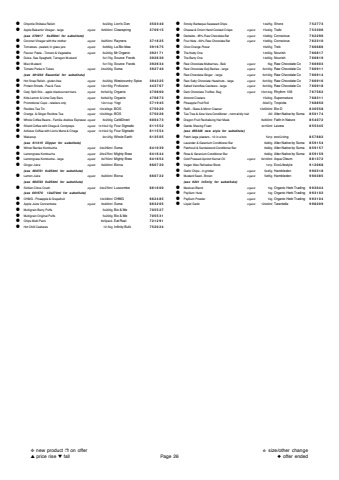 %u25cfChipotle Shiitake Relish6x220gLion's Den350340%u25cfApple Balsamic Vinegar - largeorganic6x500mlClearspring370915(see 370917 6x250ml for substitute)%u25cfCoconut Vinegar with the motherorganic6x250mlRayners371625%u25cfTomatoes - peeled, in glass jarsorganic6x660gLa Bio-Idea391675%u25cfFlavour Paste - Tomato & Vegetableorganic6x200gMr Organic392171%u25cfDulse, Sea Spaghetti, Tarragon Mustard5x170gSource Foods392630%u25cfMiso Mustard5x170gSource Foods392634%u25cfTomato Pur%u00e9e in Tubes organic24x200gSuma392740(see 391230 Essential for substitute)%u25cfHot Snap Relish - gluten-freeorganic6x200gWestcountry Spice394325%u25cfProtein Shreds - Pea & Favaorganic12x150gProfusion443767%u25cfOaty Split Stix - apple blackcurrant barsorganic6x5x23gOrganix470860%u25cfKids Lemon & Lime Oaty Barsorganic6x6x23gOrganix470873%u25cfPromotional Cups - retailers only12x1cupYogi571945%u25cfRooibos Tea Tinorganic12x40bgsBOS575020%u25cfOrange & Ginger Rooibos Teaorganic12x20bgsBOS575026%u25cfWhole Coffee Beans - Familia Arabica Espresso organic6x200gCaf%u00e9Direct600473%u25cfShield Coffee with Chaga & Cordycepsorganic1x10x2.5gFour Sigmatic611552%u25cfAchieve Coffee with Lion's Mane & Chagaorganic1x10x2.5gFour Sigmatic611554%u25cfWakecup 9x125gWhole Earth613505(see 611315 Clipper for substitute)%u25cfWinter Berries Kombuchaorganic24x250mlSuma641039%u25cfLemongrass Kombuchaorganic20x275mlMighty Brew641644%u25cfLemongrass Kombucha - largeorganic6x750mlMighty Brew641654%u25cfGinger Juice organic6x200mlBiona660720(see 660721 6x250ml for substitute)%u25cfLemon Juice organic6x200mlBiona660722(see 660723 6x250ml for substitute)%u25cfSicilian Citrus Crush organic24x270mlLuscombe661600(see 661576 12x270ml for substitute)%u25cfOHMG - Pineapple & Grapefruit12x330mlOHMG662485%u25cfApple Juice Concentrateorganic6x400mlSuma663205%u25cfMultigrain Berry Puffs5x200gBio & Me705527%u25cfMultigrain Original Puffs5x200gBio & Me705531%u25cfChips Multi Pack8x5packEat Real721291%u25cfHot Chilli Cashews12.5kgInfinity Bulk752024%u25cfSmoky Barbeque Seaweed Chips14x25gShore752773%u25cfCheese & Onion Hand Cooked Crispsorganic15x40gTrafo753306%u25cfDarkside - 85% Raw Chocolate Barorganic10x60gConscious762296%u25cfFour Nuts - 60% Raw Chocolate Barorganic10x60gConscious762310%u25cfChoc Orange Power16x55gTrek766686%u25cfThe Nutty One14x50gNourish766817%u25cfThe Berry One14x50gNourish766819%u25cfRaw Chocolate Mulberries - Bulkorganic5kgRaw Chocolate Co766903%u25cfRaw Chocolate Goji Berries - largeorganic6x100gRaw Chocolate Co766911%u25cfRaw Chocolate Ginger - largeorganic6x100gRaw Chocolate Co766914%u25cfRaw Salty Chocolate Hazelnuts - largeorganic6x100gRaw Chocolate Co766916%u25cfSalted Vanoffee Cashews - largeorganic6x100gRaw Chocolate Co766918%u25cfDark Chocolate Truffles Bagorganic10x144gRhythm 108767562%u25cfAlmond Clusters15x34gSupernature768311%u25cfPineapple Fruit Roll30x27gTropicks768850%u25cfRefill - Glass & Mirror Cleaner12x500mlBio-D830558%u25cfTea Tree & Aloe Vera Conditioner - normal/oily hair20lAlter-Native by Suma850174%u25cfDragon Fruit Revitalising Hair Mask6x300mlFaith in Nature854072%u25cfGentle Shaving Foam 4x150mlLavera855345(see 855346 new style for substitute)%u25cfPatch large plasters - 10 in a box5x1pecoLiving857682%u25cfLavender & Geranium Conditioner Bar6x90gAlter-Native by Suma859154%u25cfPatchouli & Sandalwood Conditioner Bar6x90gAlter-Native by Suma859157%u25cfRose & Geranium Conditioner Bar6x90gAlter-Native by Suma859159%u25cfCold Pressed Apricot Kernel Oilorganic6x100mlAqua Oleum881372%u25cfVegan Wax Refresher Block1x1pEcoLifestyle912068%u25cfGarlic Chips - in grinderorganic5x45gHambleden990318%u25cfMustard Seed - Brown organic5x65gHambleden990385(see 9231 Infinity for substitute)%u25cfMexican Blendorganic1kgOrganic Herb Trading993044%u25cfPsyllium Huskorganic1kgOrganic Herb Trading993102%u25cfPsyllium Powderorganic1kgOrganic Herb Trading993104%u25cfLiquid Garlicorganic12x40mlTarantella998209%u2748new product %u2752on offer%u25b2price rise %u25bcfallPage 26%u272bsize/other change%u25c6offer ended