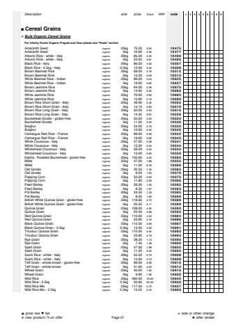 Descriptionsize price%u00a3/unitRRPcode123456789%u25a0Cereal Grains%u274aBulk Organic Cereal GrainsFor Infinity Foods Organic Fregola and Orzo please see \Amaranth Seedorganic 25kg 75.003.0010475Amaranth Seedorganic 5kg 16.803.3610477Arborio Rice - white - Italyorganic 20kg 85.004.2510490Arborio Rice - white - Italyorganic 5kg 23.054.6110495Black Rice - Italyorganic 20kg 86.004.3010507Black Rice - 2.5kg - Italyorganic 2.5kg 12.605.0410508Brown Basmati Rice organic 25kg 69.002.7610512Brown Basmati Rice organic 5kg 15.303.0610513White Basmati Rice - Indianorganic 25kg 86.003.4410625White Basmati Rice - Indianorganic 5kg 19.003.8010627Brown Jasmine Riceorganic 25kg 64.002.5610675Brown Jasmine Riceorganic 5kg 14.602.9210680White Jasmine Riceorganic 25kg 70.002.8010685White Jasmine Riceorganic 5kg 15.803.1610690Brown Rice Short Grain - Italyorganic 20kg 49.002.4510505Brown Rice Short Grain - Italyorganic 5kg 14.102.8210510Brown Rice Long Grain - Italyorganic 20kg 50.002.5010515Brown Rice Long Grain - Italyorganic 5kg 14.352.8710520Buckwheat Groats - gluten-freeorganic 25kg 55.002.2010525Buckwheat Groatsorganic 5kg 11.002.2010530Bulghurorganic 25kg 54.002.1610535Bulghurorganic 5kg 12.602.5210540Camargue Red Rice - Franceorganic 25kg 89.003.5610542Camargue Red Rice - Franceorganic 5kg 19.603.9210543White Couscous - Italyorganic 25kg 57.002.2810541White Couscous - Italyorganic 5kg 13.202.6410544Wholemeal Couscous - Italyorganic 25kg 56.002.2410545Wholemeal Couscous - Italyorganic 5kg 13.002.6010550Kasha - Roasted Buckwheat - gluten-freeorganic 25kg 105.604.2210562Milletorganic 25kg 47.001.8810555Milletorganic 5kg 11.202.2410560Oat Groatsorganic 25kg 32.501.3010565Oat Groatsorganic 5kg 8.001.6010570Popping Cornorganic 25kg 50.002.0010575Popping Cornorganic 5kg 11.802.3610580Pearl Barleyorganic 20kg 26.001.3010582Pearl Barleyorganic 5kg 8.351.6710583Pot Barleyorganic 20kg 24.501.2310585Pot Barleyorganic 5kg 8.001.6010590British White Quinoa Grain - gluten-freeorganic 25kg 118.854.7510588British White Quinoa Grain - gluten-freeorganic 5kg 25.555.1110589Quinoa Grainorganic 25kg 108.004.3210592Quinoa Grain organic 5kg 23.404.6810593Red Quinoa Grainorganic 25kg 110.004.4010684Red Quinoa Grain organic 5kg 23.804.7610686Black Quinoa Grainorganic 25kg 115.004.6010687Black Quinoa Grain - 2.5kgorganic 2.5kg 13.305.3210691Tricolour Quinoa Grain organic 25kg 110.004.4010692Tricolour Quinoa Grain organic 5kg 23.804.7610693Rye Grainorganic 25kg 28.201.1310595Rye Grainorganic 5kg 7.451.4910600Spelt Grainorganic 25kg 47.001.8810602Spelt Grainorganic 5kg 11.202.2410603Sushi Rice - white - Italyorganic 20kg 55.002.7510608Sushi Rice - white - Italyorganic 5kg 15.603.1210609Teff Grain - whole brown - gluten-freeorganic 25kg 99.003.9610610Teff Grain - whole brownorganic 5kg 21.604.3210612Wheat Grainorganic 25kg 40.001.6010615Wheat Grainorganic 5kg 9.801.9610620Wild Riceorganic 25kg 490.0019.6010645Wild Rice - 2.5kgorganic 2.5kg 50.8020.3210650Wild Rice Mixorganic 25kg 117.504.7010657Wild Rice Mix - 2.5kgorganic 2.5kg 13.555.4210660%u25b2price rise %u25bcfall%u2748new product %u2752on offerPage 27%u272bsize or other change%u25c6offer ended