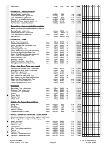 Descriptionsize price%u00a3/unitRRPcode123456789%u274aDoves Farm - baking requisitesBaking Powder - gluten-free5x130g 6.951.8541203Bicarbonate of Soda - gluten-free5x200g 6.351.6941208Corn Starch Flour - gluten-freeorganic5x110g 8.252.2041212Vitamin C - for bread improvement5x120g 17.50 V5.6041216Quick Dried Yeast - packet - gluten-free8x125g 11.101.8551085Xanthan Gum - gluten-free binder5x100g 13.10 V4.1941218%u274aDoves Farm - food service baking requisitesNB The four Doves products below are not for retail saleBaking Powder - gluten-free 3x1kg 18.506.1741305Bicarbonate of Soda - gluten-free 3x1kg 9.80 V3.2741310Corn Starch Flour - gluten-freeorganic 3x1kg 19.406.4741312Xanthan Gum 3x1kg 48.00 V16.0041315%u274aDoves Farm - sacksBarley Flour Stonegroundorganic 25kg 34.701.3940508Fine Plain Wholemeal Flourorganic 25kg 27.801.1140510Strong Stoneground Wholemeal Flourorganic 25kg 26.501.0640530Plain White Flourorganic 25kg 29.201.1740570Self Raising White Flourorganic 25kg 32.451.3040572Strong White Bread Flour (with Vitamin C)organic 25kg 30.301.2140555Traditional Strong White Bread Flourorganic 25kg 30.301.2140557Strong White Bread Flour (with Vitamin C)organic 16kg 19.401.2140558Sack Gluten-free Plain White Flourorganic 16kg 42.502.6640559Malthouse Bread Flourorganic 25kg 39.301.5740575Rye Flour - wholeorganic 25kg 29.501.1841030Maize Flour (yellow) - gluten-freeorganic 25kg 53.002.1240525Stoneground Wholemeal Spelt Flourorganic 25kg 50.852.0340527%u274aFreee - from Doves Farm - non-organicWholegrain Buckwheat Flour - gluten-free5x1kg 18.755.0051044Rice Flour (brown & white) - gluten-free5x1kg 9.202.4551037Gram Flour - gluten-free5x1kg 11.253.0051047Gluten-free Plain White Flour5x1kg 11.253.0051075Sack Gluten-free Plain White Flour 16kg 30.301.8951076Sack Gluten-free Self-Raising White Flour 16kg 30.301.8951074Gluten-free Self-Raising White Flour5x1kg 11.253.0051077Gluten-free Brown Bread Flour5x1kg 11.853.1651080Gluten-free White Bread Flour5x1kg 11.253.0051082%u274aBulk FlourBuckwheat Flour - gluten-freeorganic 25kg 64.002.5641015Chickpea Flour - gluten-freeorganic 25kg 68.002.7241016Coconut Flour - gluten-freeorganic 10kg 19.001.9041018Polentaorganic 25kg 54.002.1641026%u25b2Potato Starchorganic 25kg 95.003.8041027Tapioca Flourorganic 25kg 55.002.2041050Wheat Branorganic 15kg 18.001.2040520%u274aInfinity - Pre-Packed Organic FloursWheat Branorganic6x250g 4.250.953010Oat Branorganic6x500g 7.701.713038Fine Oatmealorganic6x500g 6.951.543040Medium Oatmealorganic6x500g 6.951.543045Coarse Oatmeal (Pinhead)organic6x500g 6.951.543050%u274aInfinity - Pre-Packed Gluten-free Organic FloursGuaranteed less than 20 parts per million of gluten. Batch tested.Packed in a gluten-free facility. Coeliac Society approved.%u25b2Brown Rice Flourorganic6x500g 13.503.003015Buckwheat Flourorganic6x500g 15.003.343020Chickpea Flourorganic6x500g 16.003.563022%u25b2Coconut Flourorganic6x500g 12.502.783023Corn Flour (yellow maize flour)organic6x500g 11.002.453025Polentaorganic6x500g 12.002.673052%u25b2Tapioca Flourorganic6x500g 12.502.793080Teff Flour - wholegrain brownorganic6x500g 20.004.443090%u25b2Teff Flour - wholegrain whiteorganic6x500g 21.004.673095%u25b2price rise %u25bcfall%u2748new product %u2752on offerPage 30%u272bsize or other change%u25c6offer ended