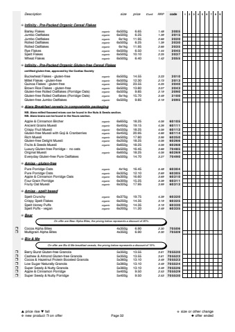 Descriptionsize price%u00a3/unitRRPcode123456789%u274aInfinity - Pre-Packed Organic Cereal FlakesBarley Flakesorganic6x500g 6.651.482005Jumbo Oatflakesorganic6x500g 6.251.392015Jumbo Oatflakesorganic6x1kg 11.952.662020Rolled Oatflakesorganic6x500g 6.251.392030Rolled Oatflakesorganic6x1kg 11.952.662035Rye Flakesorganic6x500g 6.501.442045Spelt Flakesorganic6x500g 10.102.252037Wheat Flakesorganic6x500g 6.401.422055%u274aInfinity - Pre-Packed Organic Gluten-free Cereal Flakescertified gluten-free, approved by the Coeliac SocietyBuckwheat Flakes - gluten-freeorganic6x500g 14.553.232010Millet Flakes - gluten-freeorganic6x500g 12.302.732013Quinoa Flakes - gluten-freeorganic6x500g 23.555.252040Brown Rice Flakes - gluten-freeorganic6x500g 13.803.072043Gluten-free Rolled Oatflakes (Porridge Oats)organic6x500g 9.852.192090Gluten-free Rolled Oatflakes (Porridge Oats)organic6x1kg 15.703.492100Gluten-free Jumbo Oatflakesorganic6x500g 9.852.192095%u274aAlara Breakfast cereals in compostable packagingNB. Alara milled flaxseed mixes can be found in the Nuts & Seeds section.NB. Alara brans can be found in the flours section.Apple & Cinnamon Bircherorganic6x650g 18.254.0660105Ancient Grains Muesliorganic6x450g 19.154.2660111Crispy Fruit Muesliorganic6x550g 18.254.0660112Gluten-free Muesli with Goji & Cranberriesorganic6x450g 20.954.6660114Rich Muesliorganic6x500g 17.803.9660250Gluten-free Delight Muesliorganic6x250g 18.254.0660266Fruits & Seeds Muesliorganic6x650g 18.254.0660268Luxury Gluten-free Porridge - no oats6x500g 16.453.6670485Original Muesliorganic6x650g 18.254.0660269Everyday Gluten-free Pure Oatflakes6x500g 14.703.2770490%u274aAmisa - gluten-freePure Porridge Oatsorganic4x1kg 16.455.4860304Pure Porridge Oatsorganic6x325g 12.102.6960305Apple & Cinnamon Porridge Oatsorganic6x300g 16.603.6960310Four Grain Porridgeorganic6x300g 15.253.3960311Fruity Oat Muesliorganic6x325g 17.953.9960312%u274aAmisa - spelt basedSpelt Crunchyorganic6x375g 19.754.3960320Crispy Spelt Flakesorganic6x250g 14.353.1960325Spelt Honey Puffsorganic6x200g 14.353.1960330Spelt Puffs - veganorganic6x200g 11.202.4960335%u274aBear%u2752Cocoa Alpha Bites4x350g 6.902.3070506%u2752Multigrain Alpha Bites4x350g 6.902.3070509%u274aBio & Me%u2752Berry Burst Gluten-free Granola5x350g 13.553.61705520%u2752Cashew & Almond Gluten-free Granola5x350g 13.553.61705522%u2752Cocoa & Hazelnut Protein Boosted Granola5x360g 13.103.49705523%u2752Low Sugar Naturally Granola5x360g 13.103.49705524%u2752Super Seedy & Nutty Granola5x360g 13.103.49705526%u2752Apple & Cinnamon Porridge5x400g 9.502.53705529%u2752Super Seedy & Nutty Porridge5x400g 9.502.53705530 On offer are Bio & Me breakfast cereals, the pricing below represents a discount of 15%. On offer are Bear Alpha Bites, the pricing below represents a discount of 20%.%u25b2price rise %u25bcfall%u2748new product %u2752on offerPage 32%u272bsize or other change%u25c6offer ended
