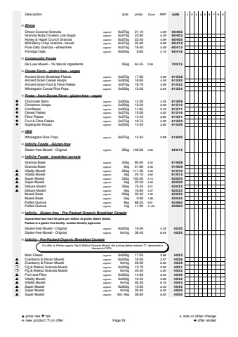 Descriptionsize price%u00a3/unitRRPcode123456789%u274aBionaChoco-Coconut Granolaorganic6x375g 21.104.6960402Granola Nutty Clusters Low Sugarorganic6x375g 23.805.2960403Honey & Hazel Crunch Granolaorganic6x375g 22.454.9960405Wild Berry Crisp Granola - boxedorganic6x375g 25.605.6960412Pure Oaty Granola - wheat-freeorganic6x375g 18.404.0960413Porridge Oatsorganic6x500g 9.852.1960416%u274aCommunity FoodsDe Luxe Muesli - 16 natural ingredients 25kg 64.452.5870515%u274aDoves Farm - gluten free - veganAncient Grain Breakfast Flakesorganic5x375g 17.604.6961528Ancient Grain Cereal Hoopsorganic5x300g 16.854.4961530Ancient Grain Fruit & Fibre Flakesorganic5x375g 18.704.9961532Wholegrain Cocoa Rice Popsorganic5x300g 13.303.5561534%u274aFreee - from Doves Farm - gluten-free - vegan%u25c6Chocolate Starsorganic5x300g 12.203.2561509%u25c6Cinnamon Hoopsorganic5x300g 12.203.2561512%u25c6Cornflakesorganic5x325g 11.853.1661511%u25c6Cereal Flakesorganic5x375g 15.004.0061516%u25c6Fibre Flakesorganic5x375g 14.453.8561521%u25c6Fruit & Fibre Flakesorganic5x375g 18.755.0061523%u25c6Supergrain Hoopsorganic5x300g 14.453.8561526%u274aIBISWholegrain Rice Popsorganic6x275g 13.452.9961620%u274aInfinity Foods - Gluten-freeGluten-free Muesli - Originalorganic 25kg 146.005.8462015%u274aInfinity Foods - breakfast cerealsGranola Baseorganic 20kg 80.004.0061908Granola Baseorganic 5kg 21.804.3661909%u25b2Vitality Muesliorganic 25kg 111.504.4661910%u25b2Vitality Muesliorganic 5kg 24.104.8261915%u25b2Super Muesliorganic 25kg 103.504.1462025%u25b2Super Muesliorganic 5kg 22.504.5062030%u25b2Deluxe Muesliorganic 25kg 75.253.0162032%u25b2Deluxe Muesliorganic 5kg 16.853.3762033Muesli Baseorganic 20kg 32.401.6262035Muesli Baseorganic 5kg 9.901.9862040Puffed Quinoaorganic 9kg 88.259.8162060Puffed Quinoaorganic 1kg 11.6011.6062062%u274aInfinity - Gluten-free - Pre-Packed Organic Breakfast CerealsGuaranteed less than 20 parts per million of gluten. Batch tested.Packed in a gluten-free facility. Coeliac Society approved.Gluten-free Muesli - Originalorganic6x500g 19.504.334030Gluten-free Muesli - Originalorganic6x1kg 38.408.544035%u274aInfinity - Pre-Packed Organic Breakfast CerealsBran Flakesorganic6x500g 17.353.864033%u25b2Cranberry & Pecan Muesliorganic6x500g 16.053.574036%u25b2Cranberry & Pecan Muesliorganic6x1kg 29.506.564039%u2752Fig & Walnut Granola Muesli organic6x500g 12.702.834031%u2752Fig & Walnut Granola Muesli organic6x1kg 23.405.204032%u25b2Fruit and Fibreorganic6x325g 14.603.254040%u25b2Vitality Muesliorganic6x500g 16.453.664042%u25b2Vitality Muesliorganic6x1kg 30.356.754043%u25b2Super Muesliorganic6x500g 15.503.454045%u25b2Super Muesliorganic6x1kg 28.406.324050%u25b2Super Muesliorganic6x1.4kg 38.858.634055 On offer is Infinity organic Fig & Walnut Granola Muesli, the pricing below marked%u2752 represents a discount of 20%.%u25b2price rise %u25bcfall%u2748new product %u2752on offerPage 33%u272bsize or other change%u25c6offer ended