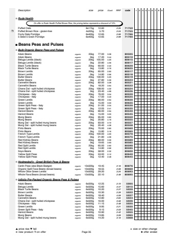 Descriptionsize price%u00a3/unitRRPcode123456789%u274aRude HealthPuffed Oats8x175g 12.602.2571750%u2752Puffed Brown Rice - gluten-free4x225g 5.702.0471755Fruity Date Porridge6x400g 12.652.99717865 Seed 5 Grain Porridge6x400g 12.652.9971790%u25a0Beans Peas and Pulses%u274aBulk Organic Beans Peas and PulsesAduki Beansorganic 25kg 77.003.0880505Aduki Beansorganic 5kg 17.203.4480510Beluga Lentils (black)organic 25kg 105.004.2080615Beluga Lentils (black)organic 5kg 22.804.5680617Black Turtle Beansorganic 25kg 60.002.4080620Black Turtle Beansorganic 5kg 13.802.7680625Brown Lentilsorganic 25kg 65.002.6080517Brown Lentilsorganic 5kg 14.802.9680518Butter Beansorganic 25kg 130.005.2080519Butter Beansorganic 5kg 27.805.5680523Cannellini Beansorganic 25kg 82.003.2880521Cannellini Beansorganic 5kg 18.203.6480522Chana Dal - split hulled chickpeasorganic 25kg 108.004.3280524Chana Dal - split hulled chickpeasorganic 5kg 23.404.6880526Chickpeas - Italyorganic 25kg 76.003.0480520Chickpeas - Italyorganic 5kg 17.003.4080525Green Lentilsorganic 25kg 66.002.6480630Green Lentilsorganic 5kg 15.003.0080635Green Split Peas - Italyorganic 25kg 51.002.0480530Green Split Peas - Italyorganic 5kg 12.052.4180535Haricot Beansorganic 25kg 66.002.6480540Haricot Beansorganic 5kg 15.003.0080545Mung Beansorganic 25kg 95.003.8080550Mung Beansorganic 5kg 20.804.1680555Mung Dal - split hulled mung beansorganic 25kg 93.003.7280557Mung Dal - split hulled mung beansorganic 5kg 20.404.0880558Pinto Beansorganic 25kg 70.002.8080560Pinto Beansorganic 5kg 15.803.1680565French Type Lentilsorganic 25kg 100.004.0080570French Type Lentilsorganic 5kg 21.804.3680575Red Kidney Beansorganic 25kg 89.003.5680580Red Kidney Beansorganic 5kg 19.653.9380585Red Split Lentilsorganic 25kg 65.002.6080590Red Split Lentilsorganic 5kg 14.802.9680595Soya Beansorganic 25kg 58.002.3280600Yellow Split Peasorganic 25kg 53.002.1280640Yellow Split Peasorganic 5kg 12.402.4880645%u274aHodmedod's - Great British Peas & BeansCarlin Peas (aka Black Badger)organic12x500g 19.452.1680876Organic Split Fava Beans (broad beans)organic12x500g 18.552.0680660Whole Olive Green Lentils12x500g 29.203.2480893Whole Fava Beans (broad beans)organic12x500g 22.102.4680895%u274aInfinity Pre-Packed Organic Beans Peas & PulsesAduki Beansorganic6x500g 12.252.725005Beluga Lentilsorganic6x500g 15.603.475015Black Turtle Beansorganic6x500g 10.202.275020Brown Lentilsorganic6x500g 10.302.295022Butter Beansorganic6x500g 18.404.095027Cannellini Beansorganic6x500g 12.802.845023Chana Dal - split hulled chickpeasorganic6x500g 16.003.565026Chickpeas - Italyorganic6x500g 11.152.485025Green Lentilsorganic6x500g 9.952.215035Green Split Peas - Italyorganic6x500g 9.152.035045Haricot Beansorganic6x500g 10.902.425055Mung Beansorganic6x500g 13.853.095065Mung Dal - split hulled mung beansorganic6x500g 14.203.165068 On offer is Rude Health Puffed Brown Rice, the pricing below represents a discount of 15%.%u25b2price rise %u25bcfall%u2748new product %u2752on offerPage 35%u272bsize or other change%u25c6offer ended