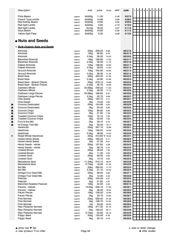 Descriptionsize price%u00a3/unitRRPcode123456789Pinto Beansorganic6x500g 11.202.495075French Type Lentilsorganic6x500g 14.803.295085Red Kidney Beansorganic6x500g 13.653.055095Red Split Lentilsorganic6x500g 9.852.195105Red Split Lentilsorganic6x1kg 18.254.075110Soya Beansorganic6x500g 10.002.235115Yellow Split Peasorganic6x500g 9.352.085130%u25a0Nuts and Seeds%u274aBulk Organic Nuts and SeedsAlmondsorganic 25kg 239.509.5890516Almondsorganic 10kg 96.959.7090515Almondsorganic 2.5kg 26.0510.4290520Blanched Almondsorganic 10kg 109.9511.0090517Blanched Almondsorganic 2.5kg 29.3011.7290518Flaked Almondsorganic 10kg 108.9510.9090511Flaked Almondsorganic 2.5kg 29.0511.6290512Ground Almondsorganic 10kg 105.9510.6090513Ground Almondsorganic 2.5kg 28.3011.3290514Brazil Nutsorganic 20kg 425.0021.2590522Brazil Nutsorganic 2.5kg 54.9021.9690523Brazil Nuts - Broken Piecesorganic 20kg 279.1513.9690525Brazil Nuts - Broken Piecesorganic 2.5kg 36.7014.6890546Cashews Wholeorganic 22.68kg 249.5511.0090524Cashews Wholeorganic 2.5kg 29.3011.7290526Cashews Large Piecesorganic 22.68kg 189.858.3790536Cashews Large Piecesorganic 2.5kg 22.709.0890537Chia Seedsorganic 25kg 102.754.1190527Chia Seedsorganic 2kg 10.005.0090528%u25b2Coconut Desiccatedorganic 25kg 154.906.2090529%u25b2Coconut Desiccatedorganic 3kg 20.456.8290530%u25b2Coconut Chipsorganic 10kg 66.906.6990532%u25b2Coconut Chipsorganic 3kg 21.957.3290533%u25b2Toasted Coconut Chipsorganic 10kg 70.157.0290531%u25b2Toasted Coconut Chipsorganic 3kg 22.957.6590544%u25b2Fruit & Nut Mixorganic 3kg 29.109.7090557%u25b2Hi Energy Trail Mixorganic 3kg 30.5010.1790569Hazelnutsorganic 25kg 347.1513.8990551Hazelnutsorganic 10kg 139.2513.9390535Hazelnutsorganic 2.5kg 36.6014.6490540%u272bRoast Whole Hazelnutsorganic 25kg 410.60 V16.4290541Hulled Hemp Seedsorganic 20kg 182.259.1190502Hulled Hemp Seedsorganic 5kg 47.359.4790503Hemp Seeds - wholeorganic 20kg 107.655.3890542Hemp Seeds - wholeorganic 5kg 28.705.7490543Linseed Brownorganic 25kg 48.501.9490545Linseed Brownorganic 5kg 11.502.3090550Linseed Goldorganic 25kg 56.502.2690552Linseed Goldorganic 5kg 13.102.6290553Macadamia Nutsorganic 11.34kg 215.1518.9790538Macadamia Nutsorganic 0.75kg 16.0021.3390539Nut Mixorganic 25kg 293.2511.7390534Nut Mixorganic 2.5kg 31.1012.4490554Omega Four Seed Mixorganic 25kg 96.003.8490571Omega Four Seed Mixorganic 3kg 13.304.4390556Peanutsorganic 25kg 100.354.0190555Peanutsorganic 5kg 21.854.3790560Blanched Roasted Peanutsorganic 10kg 54.005.4090615Pecans - Halvesorganic 13.6kg 236.1017.3690561Pecans - Halvesorganic 2kg 36.5018.2590563Pecan Piecesorganic 10kg 159.5015.9590566Pecan Piecesorganic 2kg 33.7016.8590567Pine Kernelsorganic 25kg 539.4521.5890562Pine Kernelsorganic 5kg 109.7021.9490568Pine Kernelsorganic 1kg 23.3523.3590565Raw Pistachio Kernelsorganic 10kg 317.5031.7590547Raw Pistachio Kernelsorganic 5kg 160.5532.1190548Raw Pistachio Kernelsorganic 0.75kg 25.6034.1390549Poppy Seedorganic 25kg 155.006.2090559Poppy Seedorganic 3kg 20.106.7090558%u25b2price rise %u25bcfall%u2748new product %u2752on offerPage 36%u272bsize or other change%u25c6offer ended