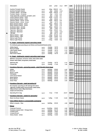 Descriptionsize price%u00a3/unitRRPcode123456789Austrian Pumpkin Seedsorganic 25kg 239.259.5790572Austrian Pumpkin Seedsorganic 2kg 20.9510.4890573Pumpkin Seeds - AA gradeorganic 25kg 128.355.1390564Pumpkin Seeds - AA gradeorganic 2kg 12.056.0390570Three Seed Mix -sunflower, pumpkin, pineorganic 3kg 17.605.8790574Hulled Sesame Seeds - whiteorganic 25kg 110.254.4190575Hulled Sesame Seeds - whiteorganic 5kg 23.554.7190580Sesame Seeds - whole - brownorganic 25kg 89.553.5890582Sesame Seeds - whole - brownorganic 5kg 19.703.9490583Black Sesame Seeds - wholeorganic 25kg 89.553.5890587Black Sesame Seeds - wholeorganic 3kg 12.554.1890588Sunflower Seed - kernelsorganic 25kg 60.352.4190585Sunflower Seed - kernelsorganic 5kg 13.852.7790590Tigernuts - Blanchedorganic 10kg 85.008.5090604Tigernuts - Blanchedorganic 1kg 10.3010.3090606%u25b2Trail Mixorganic 3kg 20.756.9290607Walnut Halves - Lightorganic 10kg 87.258.7390591Walnut Halves - Lightorganic 2.5kg 23.609.4490594Walnut Light Piecesorganic 10kg 72.507.2590595Walnut Light Piecesorganic 2.5kg 19.907.9690600%u274aA. Vogel - bioSnacky organic sprouting seedsFor bioSnacky glass sprouting jar see Kitchen and Household Goods sectionAlfalfa Seedsorganic12x40g 19.702.1990905Broccoli Seedsorganic12x30g 19.702.1990906Little Radish Seedsorganic12x40g 19.702.1990907Mung Beansorganic12x40g 17.401.9390910Red Clover Seedsorganic12x30g 19.702.1990912%u274aA. Vogel - bioSnacky organic sprouting seed mixesWellness: mung beans, red clover, lentils, white radish seedsFitness: white radish, mung beans, wheat seedsWellness Mixorganic12x40g 19.702.1990916Fitness Mixorganic12x40g 17.401.9390917%u274aAconbury Sprouts - sprouting seeds - retail friendly block bagsAlfalfaorganic8x250g 32.605.4390637Broccoliorganic8x250g 54.059.0190640Brown Lentilsorganic8x500g 24.304.0590642Chickpeasorganic8x500g 24.604.1090645China Rose Radishorganic8x250g 26.354.3990647Mixed Beansorganic8x500g 26.204.3790652Mung Beansorganic8x500g 34.455.7490657Snow Peasorganic8x500g 25.904.3290658%u274aAconbury Sprouts - seed sprouting kitKit comprises: sprouting jar with drainage lid & stand,100g each of alfalfa seeds, broccoli seeds, radish seeds,200g sunflower seeds, 300g mixed beans,recipes and instructions.Sprouting Kit in bagorganic1x1p 17.0022.6790665%u274aAconbury Sprouts - seeds for sproutingBlack Sunflower Seedsorganic1x2kg 11.2014.9390613%u274aAlara Milled Seeds in compostable packagingMilled Linseeds - Raworganic6x500g 22.304.9690672%u274aBionaCreamed Coconutorganic12x200g 29.603.2890702Cracked Linseed Gold - Omega Extraorganic6x500g 24.705.4990705Linseed Goldorganic6x500g 16.603.6990710Linseed Brownorganic6x500g 14.803.2990712Hemp Seeds - wholeorganic8x250g 14.902.4990715%u25b2price rise %u25bcfall%u2748new product %u2752on offerPage 37%u272bsize or other change%u25c6offer ended