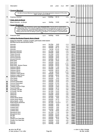 Descriptionsize price%u00a3/unitRRPcode123456789%u274aCoconut Merchant%u2752Creamed Coconutorganic12x200g 25.152.7990718%u274aCrazy Jack on-the-goMixed Almonds - on-the-goorganic18x30g 12.800.9590722%u274aForest Wholefoods%u2748Amaranth Seedorganic6x500g 16.603.6990730%u274aInfinity Pre-Packed Organic Nuts & SeedsOmega Four Seed Mix - sunflower, pumpkin, gold linseed, hulled sesameNB Alfalfa must be sprouted before eatingAlmondsorganic6x125g 9.602.136015Almondsorganic6x250g 16.853.746020Almondsorganic6x500g 32.157.156025Almondsorganic6x1kg 61.2513.626026Blanched Almondsorganic6x125g 10.552.346017Blanched Almondsorganic6x250g 18.804.196018Flaked Almondsorganic6x125g 10.602.366011Flaked Almondsorganic6x250g 19.354.316012Ground Almondsorganic6x250g 18.904.216014Ground Almondsorganic6x500g 35.107.806016Brazil Nutsorganic6x125g 19.004.226031Brazil Nutsorganic6x250g 34.957.776032Brazil Nutsorganic6x500g 66.8014.846033Brazil Nuts - Broken Piecesorganic6x250g 24.005.336036Cashews Wholeorganic6x125g 11.302.516041Cashews Wholeorganic6x250g 19.554.356042Cashews Wholeorganic6x500g 36.058.016043Cashews Wholeorganic6x1kg 69.0515.346051Cashews Large Piecesorganic6x250g 15.653.486063Cashews Large Piecesorganic6x500g 28.206.276064%u25b2Cashews & Raisinsorganic6x125g 9.702.166044Chia Seedsorganic6x250g 9.252.066052Chia Seedsorganic6x500g 15.403.426053%u25b2Coconut Desiccatedorganic6x250g 12.352.746035%u25b2Coconut Desiccatedorganic6x500g 21.654.816040%u25b2Coconut Chipsorganic6x250g 13.102.916037%u25b2Toasted Coconut Chipsorganic6x250g 13.603.026039%u25b2Fruit & Nut Mixorganic6x250g 16.753.726047%u25b2Hi Energy Trail Mixorganic6x250g 17.453.956048%u25b2Hi Energy Trail Mixorganic6x125g 10.252.316049Hazelnutsorganic6x125g 13.503.006045Hazelnutsorganic6x250g 23.955.326050Hazelnutsorganic6x500g 44.859.976055Hulled Hemp Seedsorganic6x125g 9.852.196054Hulled Hemp Seedsorganic6x250g 16.703.726057Hemp Seeds - wholeorganic6x250g 11.102.476058Roast Whole Hazelnutsorganic6x125g 15.40 V4.116056Linseed Brownorganic6x250g 6.001.336070Linseed Brownorganic6x450g 8.301.846075Linseed Goldorganic6x250g 5.851.306077Linseed Goldorganic6x450g 8.851.976078Linseed Goldorganic6x1kg 16.653.706079Macadamia Nutsorganic6x125g 17.303.846073Macadamia Nutsorganic6x250g 31.557.016074Nut Mixorganic6x250g 20.654.606080Nut Mixorganic6x500g 38.258.516082Omega Four Seed Mixorganic6x250g 8.401.896084Omega Four Seed Mixorganic6x500g 14.503.226087Peanutsorganic6x250g 8.301.856085Peanutsorganic6x500g 14.903.316090 On offer is Coconut Merchant Creamed Coconut, the pricing represents a discount of 15% on the higher 'off-offer' price of %u00a329.60.New from Forest Wholefoods, organic vegan Amaranth Seed. This fine seed is nutrient dense containing protein fibre, rich in calcium, magnesium, phosphorus and potassium, and with all nine aminoacids including lysine. The amaranth plant can grow up to six foot high and has bright red or gold flowers; it was first cultivated by the Aztecs 8000 years ago. Amaranth can be cooked like a grain by boiling, ground into a flour for baking or grown as a microgreen. It is packaged in a recyclable plastic bag.%u25b2price rise %u25bcfall%u2748new product %u2752on offerPage 38%u272bsize or other change%u25c6offer ended