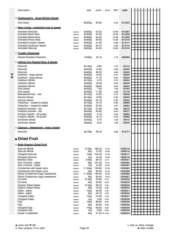 Descriptionsize price%u00a3/unitRRPcode123456789%u274aHodmedod's - Great British SeedsChia Seed8x300g 20.653.4591305%u274aRaw Living - activated nuts & seedsActivated Almondsorganic6x200g 54.5512.9991307Activated Brazil Nutsorganic6x200g 54.5512.9991308Activated Mixed Nutsorganic6x200g 54.5512.9991309Activated Pecan Nutsorganic6x200g 62.9514.9991310Activated Pumpkin Seedsorganic6x200g 41.909.9891311Activated Sunflower Seedsorganic6x200g 25.105.9891312Activated Walnutsorganic6x200g 54.5512.9991315%u274aTrustin ChestnutsPeeled Roasted Chestnuts12x80g 16.151.7990899%u274aInfinity Pre-Packed Nuts & SeedsAlmonds6x125g 8.851.976515Almonds6x250g 14.653.266520Almonds6x500g 26.255.836525%u25bcCashews - large pieces6x250g 10.402.316620%u25bcCashews - large pieces6x500g 17.703.946625Cashews Whole6x125g 9.702.166635Cashews Whole6x250g 16.353.636640Cashews Whole6x500g 29.656.606643Chia Seeds6x250g 7.351.636705Chia Seeds6x500g 11.602.586710Macadamia Nuts - raw6x125g 12.252.726828Pecans Halves6x125g 13.603.026830Pecans Halves6x250g 24.105.366835Pistachios - roasted & salted6x125g 12.702.826860Pistachios - roasted & salted6x250g 22.354.976865Pistachio Kernels - raw6x125g 21.854.866875Pistachio Kernels - raw6x250g 40.659.056877Pumpkin Seeds - AA grade6x250g 9.102.026885Pumpkin Seeds - AA grade6x500g 15.103.366890Sunflower Seeds6x250g 5.751.286915Sunflower Seeds6x500g 8.451.886920%u274aZaytoun - Palestinian - fairly tradedAlmonds6x150g 26.455.8891577%u25a0Dried Fruit%u274aBulk Organic Dried FruitApricots Wholeorganic 12.5kg 180.4514.44100510Apricots Wholeorganic 5kg 74.0014.80100515Chopped Apricotsorganic 10kg 105.2010.52100517Chopped Apricotsorganic 1kg 12.3012.30100518Banana Chipsorganic 6.8kg 28.104.13100521Sour Cherries - pittedorganic 8kg 107.3013.41100495Sour Cherries - pittedorganic 1kg 15.2015.20100497Cranberries with Apple Juiceorganic 11.34kg 150.8513.30100485Cranberries with Apple Juiceorganic 2kg 28.4014.20100490Sliced Cranberries sugar sweetenedorganic 11.34kg 140.0012.35100486Sliced Cranberries sugar sweetenedorganic 2kg 26.5013.25100487Currantsorganic 12.5kg 76.956.16100520Currantsorganic 5kg 32.606.52100525Organic Select Datesorganic 12.5kg 28.752.30100532Organic Select Datesorganic 5kg 13.302.66100533Dates - pittedorganic 10kg 42.604.26100531Dates - pittedorganic 5kg 23.104.62100535Chopped Datesorganic 10kg 31.803.18100537Chopped Datesorganic 1kg 5.005.00100528Figsorganic 10kg 89.959.00100539Figsorganic 5kg 46.809.36100540Chopped Figsorganic 10kg 68.506.85100549Chopped Figsorganic 1kg 8.658.65100530Ginger Crystallisedorganic 5kg 31.25 V6.25100552%u25b2price rise %u25bcfall%u2748new product %u2752on offerPage 40%u272bsize or other change%u25c6offer ended