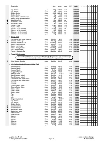 Descriptionsize price%u00a3/unitRRPcode123456789Goji Berriesorganic 10kg 118.0011.80100543Goji Berriesorganic 1kg 13.6013.60100545Golden Berriesorganic 25kg 320.4012.82100541Golden Berriesorganic 1kg 14.6014.60100542Mango Strips - Burkina Fasoorganic 2kg 22.6011.30100569Mango Strips (Brooks Variety)organic 1kg 13.5013.50100556%u25b2Mixed Vine Fruitorganic 5kg 32.656.53100548%u25b2Mulberries - whiteorganic 10kg 139.9013.99100538%u25b2Mulberries - whiteorganic 1kg 15.8515.85100544Prunes - Pittedorganic 12.5kg 145.2511.62100555Prunes - Pittedorganic 5kg 59.9011.98100557Raisins - s/f oil dressedorganic 12.5kg 72.505.80100560Raisins - s/f oil dressedorganic 5kg 30.806.16100565Sultanas - s/f oil dressedorganic 12.5kg 62.505.00100570Sultanas - s/f oil dressedorganic 5kg 26.805.36100575%u274aCrazy JackCranberries with sugar & veg.oilorganic7x100g 8.301.58100775%u25b2Apricots - on-the-goorganic18x40g 21.001.56100773%u25b2Apricots - Ready-to-Eatorganic12x200g 52.505.83100782Mango - Ready-to-Eatorganic6x100g 11.202.49100779Mango - on-the-goorganic16x30g 11.400.95100781Dates - Ready-to-Eatorganic12x200g 21.602.40100784Figs - Ready-to-Eatorganic12x200g 39.604.40100788Prunes - Ready-to-Eatorganic12x200g 23.402.60100790%u274aForest Wholefoods%u2748Dried Mango - Brooksorganic6x250g 24.405.42100800%u274aInfinity Pre-Packed Organic Dried FruitApricots Wholeorganic6x350g 34.407.647010Apricots Wholeorganic6x500g 47.4010.537015Apricots Wholeorganic6x1kg 90.7020.167020Chopped Apricotsorganic6x250g 19.854.417022Banana Chipsorganic6x125g 7.15 V1.917024Sour Cherries - pittedorganic6x125g 14.103.137016Sour Cherries - pittedorganic6x250g 24.155.377019Cranberries with Apple Juiceorganic6x125g 14.053.127017Cranberries with Apple Juiceorganic6x250g 24.005.347018Currantsorganic6x250g 13.302.967025Currantsorganic6x500g 22.555.017030Organic Select Datesorganic6x250g 6.051.357032Organic Select Datesorganic6x500g 9.652.147033Dates - pittedorganic6x250g 10.402.327035Dates - pittedorganic6x500g 16.803.737040Dates - pittedorganic6x1kg 29.606.597045Figsorganic6x350g 22.955.107050Figsorganic6x500g 31.056.907055Figsorganic6x1kg 58.0512.907060Ginger Crystallisedorganic6x125g 8.75 V2.337077Goji Berriesorganic6x125g 12.902.877064Goji Berriesorganic6x250g 21.754.837065Golden Berriesorganic6x250g 26.205.837069%u25b2Mixed Vine Fruitorganic6x250g 13.352.977062%u25b2Mixed Vine Fruitorganic6x500g 22.605.027063%u25b2Mulberries - whiteorganic6x125g 14.553.257072%u25b2Mulberries - whiteorganic6x250g 25.055.577073Pitted Prunesorganic6x250g 21.454.777080Pitted Prunesorganic6x500g 38.908.647085Raisinsorganic6x250g 12.752.837095Raisinsorganic6x500g 21.454.777100Raisinsorganic6x1kg 38.858.637105Sultanasorganic6x250g 11.552.577110Sultanasorganic6x500g 19.054.237115Sultanasorganic6x1kg 34.057.577120 New from Forest Wholefoods, organic vegan Dried Brooks Mango is a true taste sensation straight from nature's pantry, a chewy sweet treat. Packed in a recyclable bag.%u25b2price rise %u25bcfall%u2748new product %u2752on offerPage 41%u272bsize or other change%u25c6offer ended
