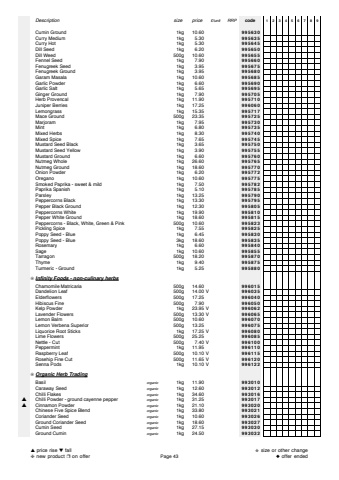 Descriptionsize price%u00a3/unitRRPcode123456789Cumin Ground 1kg 10.60995630Curry Medium 1kg 5.30995635Curry Hot 1kg 5.30995645Dill Seed 1kg 6.20995650Dill Weed 500g 10.60995655Fennel Seed 1kg 7.90995660Fenugreek Seed 1kg 3.95995675Fenugreek Ground 1kg 3.95995680Garam Masala 1kg 10.60995685Garlic Powder 1kg 6.60995690Garlic Salt 1kg 5.65995695Ginger Ground 1kg 7.90995705Herb Provencal 1kg 11.90995710Juniper Berries 1kg 17.25996060Lemongrass 1kg 15.35995717Mace Ground 500g 23.35995725Marjoram 1kg 7.95995730Mint 1kg 6.80995735Mixed Herbs 1kg 8.30995740Mixed Spice 1kg 7.65995745Mustard Seed Black 1kg 3.65995750Mustard Seed Yellow 1kg 3.90995755Mustard Ground 1kg 6.60995760Nutmeg Whole 1kg 26.60995765Nutmeg Ground 1kg 18.60995770Onion Powder 1kg 6.20995772Oregano 1kg 10.60995775Smoked Paprika - sweet & mild 1kg 7.50995782Paprika Spanish 1kg 5.10995785Parsley 1kg 13.25995790Peppercorns Black 1kg 13.30995795Pepper Black Ground 1kg 12.30995805Peppercorns White 1kg 19.90995810Pepper White Ground 1kg 18.60995815Peppercorns - Black, White, Green & Pink 500g 10.60995823Pickling Spice 1kg 7.55995825Poppy Seed - Blue 1kg 6.45995830Poppy Seed - Blue 3kg 18.60995835Rosemary 1kg 6.60995840Sage 1kg 10.60995855Tarragon 500g 18.20995870Thyme 1kg 9.40995875Turmeric - Ground 1kg 5.25995880%u274aInfinity Foods - non-culinary herbsChamomile Matricaria 500g 14.60996015Dandelion Leaf 500g 14.00 V996035Elderflowers 500g 17.25996040Hibiscus Fine 500g 7.90996050Kelp Powder 1kg 23.95 V996062Lavender Flowers 500g 13.30 V996065Lemon Balm 500g 10.60996070Lemon Verbena Superior 500g 13.25996075Liquorice Root Sticks 1kg 17.25 V996080Lime Flowers 500g 25.25996085Nettle - Cut 500g 7.40 V996100Peppermint 1kg 11.95996110Raspberry Leaf 500g 10.10 V996115Rosehip Fine Cut 500g 11.65 V996120Senna Pods 1kg 10.10 V996122%u274aOrganic Herb TradingBasilorganic 1kg 11.90993010Caraway Seedorganic 1kg 12.60993012Chilli Flakes organic 1kg 34.60993016%u25b2Chilli Powder - ground cayenne pepperorganic 1kg 31.25993017%u25b2Cinnamon Powderorganic 1kg 21.10993020Chinese Five Spice Blendorganic 1kg 33.80993021Coriander Seedorganic 1kg 10.60993026Ground Coriander Seedorganic 1kg 18.60993027Cumin Seedorganic 1kg 27.15993030Ground Cuminorganic 1kg 24.50993032%u25b2price rise %u25bcfall%u2748new product %u2752on offerPage 43%u272bsize or other change%u25c6offer ended