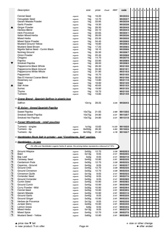 Descriptionsize price%u00a3/unitRRPcode123456789Fennel Seedorganic 1kg 19.20993035Fenugreek Seedorganic 1kg 12.70993037Garam Masala Powderorganic 1kg 33.95993039Garlic Powderorganic 1kg 19.30993038%u25b2Ginger Powderorganic 1kg 29.30993040Harissa Blendorganic 1kg 33.10993043Herb Provencalorganic 1kg 22.65993041Italian Mixed Herbsorganic 1kg 26.00993036Mixed Herbsorganic 1kg 23.35993050Mixed Spice Powderorganic 1kg 34.45993060Mustard Ground Yelloworganic 1kg 16.80993063Mustard Seed Brownorganic 1kg 17.25993065Nigella Sativa Seed - Cumin Blackorganic 1kg 18.10993066Nutmeg Groundorganic 1kg 35.30993067Onion Powderorganic 1kg 22.45993068Oreganoorganic 1kg 14.70993070Paprikaorganic 1kg 23.90993080%u25bcSmoked Paprikaorganic 1kg 28.00993082Peppercorns Black Wholeorganic 1kg 26.30993100Peppercorns Black Groundorganic 1kg 33.30993101Peppercorns White Wholeorganic 1kg 31.90993103Peppermintorganic 1kg 16.70993105Ras El Hanout Coarse Blendorganic 1kg 30.00993106Rosemary cutorganic 1kg 13.80993110Sageorganic 1kg 19.90993120%u25b2Star Aniseorganic 1kg 40.65993122Sumacorganic 1kg 19.90993125Thymeorganic 1kg 19.70993130Turmericorganic 1kg 13.85993140%u274aCrane Brand - Spanish Saffron in plastic boxSaffron12x1g 29.253.25995845%u274aEl Avion - tinned Spanish PaprikaSweet Paprika10x75g 21.652.89991505Smoked Sweet Paprika10x75g 24.803.31991507Smoked Hot Paprika10x75g 24.803.31991510%u274aForest Wholefoods - retail pouchesTurmeric - singlesorganic1x1kg 10.6514.20991650Turmeric - 6porganic6x250g 26.305.84991655Turmeric - 6porganic6x125g 21.504.78991657%u274aHambleden Rock Salt in grinder - see \%u274aHambleden - in jars%u2752Ground Allspiceorganic5x50g 12.703.39990203%u2752Basilorganic5x13g 9.052.41990205%u2752Bay Leaforganic5x2g 9.052.41990210%u2752Caraway Seedorganic5x40g 10.902.91990220%u2752Cardamom Podsorganic5x30g 12.703.39990225%u2752Cayenne - Groundorganic5x45g 9.052.41990227%u2752Ground Chilliorganic5x40g 12.703.39990230%u2752Ground Cinnamonorganic5x35g 12.703.39990250%u2752Cinnamon Quillsorganic5x10g 9.052.41990255%u2752Coriander Seedorganic5x25g 9.052.41990275%u2752Ground Corianderorganic5x30g 9.052.41990280%u2752Cumin Seedorganic5x40g 10.902.91990285%u2752Ground Cuminorganic5x45g 10.902.91990290%u2752Curry Powder - Mildorganic5x30g 10.902.91990294%u2752Fennel Seedorganic5x35g 10.902.91990305%u2752Garam Masalaorganic5x40g 10.902.91990315%u2752Ground Garlicorganic5x40g 9.052.41990320%u2752Ground Gingerorganic5x30g 10.902.91990325%u2752Herbes de Provenceorganic5x15g 9.052.41990330%u2752Juniper Berryorganic5x30g 10.902.91990340%u2752Lemon Grassorganic5x9g 9.052.41990345%u2752Mixed Herbsorganic5x13g 9.052.41990370%u2752Mixed Spiceorganic5x45g 12.703.39990375%u2752Mustard Seed - Yelloworganic5x65g 10.902.91990390 On offer are Hambleden organic herbs & spices, the pricing below represents a discount of 15%.%u25b2price rise %u25bcfall%u2748new product %u2752on offerPage 44%u272bsize or other change%u25c6offer ended