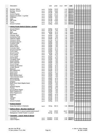 Descriptionsize price%u00a3/unitRRPcode123456789%u2752Nutmeg - Wholeorganic5x40g 16.304.35990400%u2752Nutmeg - Groundorganic5x50g 16.304.35990402%u2752Oreganoorganic5x13g 9.052.41990410%u2752Ground Paprikaorganic5x40g 12.703.39990415%u2752Peppercorns Black - in grinderorganic5x40g 14.553.88990425%u2752Rosemaryorganic5x22g 9.052.41990445%u2752Sageorganic5x12g 9.052.41990450%u2752Star Aniseorganic5x15g 10.902.91990460%u2752Thymeorganic5x17g 9.052.41990470%u2752Ground Turmericorganic5x35g 10.902.91990480%u274aInfinity Foods Herbs & Spices - packetsGround Allspiceorganic6x20g 8.101.809200Star Aniseorganic6x15g 7.001.569201Basilorganic6x20g 6.101.369202Bay Leavesorganic6x4g 6.101.369203Caraway Seedorganic6x30g 7.001.569204Cardamom Podsorganic6x10g 7.001.569205Cayenne Pepperorganic6x35g 8.101.809206Cinnamon Sticksorganic6x15g 8.101.809208Cinnamon Groundorganic6x30g 7.001.569209Crushed Chillisorganic6x25g 7.001.569214Chilli Powderorganic6x25g 7.001.569210Whole Clovesorganic6x20g 7.001.569211Coriander Seedorganic6x40g 6.101.369212Ground Corianderorganic6x40g 6.101.369213Cumin Seedorganic6x25g 7.001.569215Ground Cuminorganic6x25g 7.001.569216Curry Leavesorganic6x5g 6.101.369217Curry Powderorganic6x30g 7.001.569218Fennel Seedorganic6x40g 6.101.369220Fenugreek Seedorganic6x40g 7.001.569221Garam Masalaorganic6x25g 7.001.569222Garlic Granulesorganic6x25g 7.001.569223Ground Gingerorganic6x30g 7.001.569224Herbes de Provenceorganic6x20g 6.101.369225Juniper Berriesorganic6x30g 8.101.809226Marjoramorganic6x10g 6.101.369227Mint (Spearmint)organic6x20g 6.101.369228Mixed Herbsorganic6x20g 6.101.369229Mixed Spiceorganic6x25g 7.001.569230Black Mustard Seedorganic6x50g 7.001.569231Yellow Mustard Seedorganic6x50g 7.001.569232Whole Nutmegorganic6x20g 8.101.809233Ground Nutmegorganic6x20g 8.101.809234Oreganoorganic6x20g 6.101.369235Black Onion Seed (Nigella Seed)organic6x25g 7.001.569236Paprikaorganic6x25g 7.001.569237Smoked Paprikaorganic6x25g 7.001.569249Parsleyorganic6x15g 6.101.369238Ground Black Pepperorganic6x25g 7.001.569239Black Peppercornsorganic6x25g 7.001.569240White Peppercornsorganic6x25g 7.001.569241Rosemaryorganic6x20g 6.101.369243Sageorganic6x25g 6.101.369244Tarragonorganic6x10g 8.101.809245Thymeorganic6x25g 6.101.369246Ground Turmericorganic6x30g 6.101.369247%u274aKrokos KozanisGreek Red Saffron in filamentsorganic12x1g 66.157.35992405%u274aSaffron Direct - Bourbon Vanilla Ltd12 Vanilla Pods in vacuum packed plastic pouch1x1p 20.0026.67992408Madagascan Vanilla Powder in a pouch6x13g 31.607.02992409%u274aTarantella - Liquid Herbs & SpicesLiquid Basilorganic12x40ml 21.502.39996204Liquid Oreganoorganic12x40ml 21.502.39998211%u25b2price rise %u25bcfall%u2748new product %u2752on offerPage 45%u272bsize or other change%u25c6offer ended
