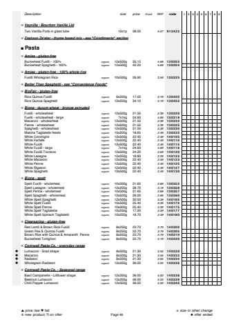 Descriptionsize price%u00a3/unitRRPcode123456789%u274aVaynilla - Bourbon Vanilla LtdTwo Vanilla Pods in glass tube10x1p 38.005.07912422%u274aZaytoun Za'atar - thyme based mix - see \%u25a0Pasta%u274aAmisa - gluten-freeBuckwheat Fusilli - 100%organic10x500g 35.154.69130203Buckwheat Spaghetti - 100%organic12x500g 42.204.69130204%u274aAmisa - gluten-free - 100% whole riceFusilli Wholegrain Riceorganic10x500g 26.903.59130225%u274aBetter Than Spaghetti - see \%u274aBioFair - gluten-freeRice Quinoa Fusilliorganic6x250g 17.053.79130450Rice Quinoa Spaghettiorganic12x250g 34.103.79130452%u274aBiona - durum wheat - bronze extrudedFusilli - wholewheatorganic12x500g 21.502.39130320Fusilli - wholewheat - largeorganic7x1kg 24.604.69130319Macaroni - wholewheatorganic12x500g 21.502.39130322Penne - wholewheatorganic12x500g 21.502.39130325Spaghetti - wholewheatorganic12x500g 21.502.39130330Matcha Tagliatelle Nestsorganic10x250g 18.652.49130332White Conchiglieorganic12x500g 22.402.49140105White Farfalleorganic12x500g 22.402.49140110White Fusilliorganic12x500g 22.402.49140115White Fusilli - largeorganic7x1kg 24.604.69140116White Fusilli Tricoloreorganic12x500g 24.202.69140120White Lasagneorganic12x250g 18.802.09140122White Macaroniorganic12x500g 22.402.49140123White Penneorganic12x500g 22.402.49140125White Rigatoniorganic12x500g 22.402.49140127White Spaghettiorganic12x500g 22.402.49140130%u274aBiona - speltSpelt Fusilli - wholemealorganic10x500g 21.652.89130352Spelt Lasagne - wholemealorganic12x250g 28.703.19130358Spelt Penne - wholemealorganic10x500g 21.652.89130357Spelt Spaghetti - wholemealorganic12x500g 26.002.89130360White Spelt Spaghettiorganic12x500g 30.503.39140165White Spelt Fusilliorganic10x500g 25.403.39140170White Spelt Penneorganic10x500g 25.403.39140175White Spelt Tagliatelleorganic10x250g 17.202.29140177White Spelt Spinach Tagliatelliorganic10x250g 18.702.49140180%u274aClearspring - gluten-freeRed Lentil & Brown Rice Fusilliorganic8x250g 22.703.79140300Green Pea & Quinoa Fusilliorganic8x250g 22.703.79140305Brown Rice with Quinoa & Amaranth Penneorganic8x250g 22.703.79140310Buckwheat Tortiglioniorganic8x250g 22.703.79140320%u274aCornwall Pasta Co. - everyday range%u25c6Lumaconi - Snail shapeorganic8x500g 21.303.55140330%u25c6Macaroniorganic8x500g 21.303.55140332%u25c6Radiatoriorganic8x500g 21.303.55140334%u25c6Wholegrain Radiatoriorganic12x350g 36.004.00140336%u274aCornwall Pasta Co. - Seasonal rangeBasil Campanelle - Liliflower shapeorganic12x350g 36.004.00140338Beetroot Lumaconiorganic12x350g 48.005.33140339Chilli Pepper Lumaconiorganic12x350g 36.004.00140340%u25b2price rise %u25bcfall%u2748new product %u2752on offerPage 46%u272bsize or other change%u25c6offer ended