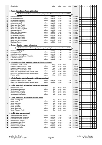Descriptionsize price%u00a3/unitRRPcode123456789%u274aFreee - from Doves Farm - gluten-free%u2752Brown Rice Fusilliorganic8x400g 16.552.76130366%u2752Brown Rice Penneorganic8x400g 16.552.76130367%u2752Brown Rice Spaghettiorganic9x400g 18.552.75130368%u2752Brown Rice Tortiglioni organic8x400g 16.552.76130369%u2752Buckwheat Penneorganic8x400g 19.703.28130371%u2752Maize and Rice Fusilliorganic8x400g 13.452.24130372%u2752Maize and Rice Penneorganic8x400g 13.452.24130373%u2752Maize and Rice Spaghettiorganic9x400g 15.102.24130374%u2752Multigrain Penneorganic8x400g 16.602.77130376Maize and Rice Lasagneorganic6x250g 14.803.29130381Brown Rice Fusilliorganic8x500g 24.304.05130365Brown Rice Spaghettiorganic12x500g 36.454.05130375Maize and Rice Fusilliorganic8x500g 19.753.29130380Maize and Rice Penneorganic8x500g 19.753.29130385Maize and Rice Spaghettiorganic12x500g 29.653.29130395Multigrain Penneorganic8x500g 24.304.05130397%u274aExplore Cuisine - vegan - gluten-free%u2752Black Bean Spaghettiorganic6x200g 11.802.62130705%u2752Chickpea Fusilliorganic6x250g 11.802.62130708%u2752Edamame Bean Spaghettiorganic6x200g 11.802.62130707%u2752Edamame & Mung Bean Fettuccineorganic6x200g 11.802.62130715%u2752Edamame Lasagneorganic6x120g 11.802.62130711%u2752Red Lentil Elbowsorganic6x225g 11.802.62130712%u274aInfinity Foods - bulk speciality pasta -white durum wheatCaserecce - twists - whiteorganic 13kg 40.353.10130924Fregola - giant couscous - whiteorganic 18kg 55.653.0910538Fregola - giant couscous - whiteorganic 5kg 17.003.4010539Malloreddos - small shell - whiteorganic 14kg 42.753.05130928Orzo - rice shape from durum wheat - whiteorganic 25kg 70.002.8010572Orzo - rice shape from durum wheat - whiteorganic 5kg 15.803.1610573Penne - whiteorganic 11kg 37.153.38130930%u274aInfinity Foods - speciality pasta - white durum wheatFregola - giant couscous - whiteorganic6x400g 10.202.281051Orzo - rice shape from durum wheat - whiteorganic6x450g 10.352.301092%u274aLa Bio Idea - bulk wholewheat pasta - durum wheatWholewheat Fusilliorganic 6kg 20.503.42130980%u272bWholewheat Macaroniorganic 6kg 20.503.42130984Wholewheat Pennetteorganic 6kg 20.503.42130986Wholewheat Spaghettiorganic 6kg 20.503.42130988Wholewheat Tagliatelleorganic 6kg 20.503.42130989%u274aLa Bio Idea - bulk white pasta - durum wheatWhite Conchiglietteorganic 6kg 20.503.42130991White Fusilliorganic 6kg 20.503.42130990%u272bWhite Macaroniorganic 6kg 20.503.42130992White Lasagneorganic 5kg 18.753.75130994White Pennetteorganic 6kg 20.503.42130996White Spaghettiorganic 6kg 20.503.42130998White Tricolore Fusilliorganic 6kg 22.503.75130999%u274aLa Bio Idea - durum wheat%u25c6Semi Wholewheat Busiateorganic6x375g 15.803.51131003%u25c6Semi Wholewheat Lumaconiorganic6x375g 13.452.99131004%u25c6Semi Wholewheat Paccheriorganic6x375g 13.452.99131006%u25b2Wholewheat Lasagneorganic12x250g 16.801.87131001%u25b2Wholewheat Macaroniorganic12x500g 20.702.30131005%u25b2Wholewheat Penneorganic6x500g 10.302.29131010%u25b2Wholewheat Spaghettiorganic12x500g 20.702.30131020%u25b2Wholewheat Fusilliorganic6x500g 10.352.30131025 On offer is selected Freee organic pasta, the pricing marked%u2752 below represents a discount of 15%. On offer is the Explore Cuisine organic pasta range, the pricing below represents a discount of 15%. %u25b2price rise %u25bcfall%u2748new product %u2752on offerPage 47%u272bsize or other change%u25c6offer ended