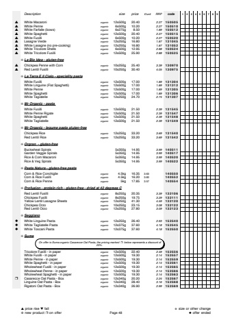 Descriptionsize price%u00a3/unitRRPcode123456789%u25b2White Macaroniorganic12x500g 20.402.27150505%u25b2White Penneorganic6x500g 10.202.27150510%u25b2White Farfalle (bows)organic6x275g 8.501.89150512%u25b2White Spaghettiorganic12x500g 20.402.27150515%u25b2White Fusilliorganic6x500g 10.202.27150520%u25b2Lasagne Verdeorganic12x250g 16.801.87131045%u25b2White Lasagne (no pre-cooking)organic12x250g 16.801.87131052%u25b2White Tricolore Shellsorganic6x500g 12.952.88150524%u25b2White Tricolore Fusilliorganic12x500g 25.902.88150525%u274aLa Bio Idea - gluten-free%u25b2Chickpea Penne with Cornorganic10x250g 25.403.39130970%u25b2Red Lentil Fusilliorganic10x250g 30.404.05130975%u274aLa Terra E Il Cielo - speciality pastaWhite Fusilliorganic12x500g 17.001.89131304White Linguine (Flat Spaghetti)organic12x500g 17.001.89131312White Penneorganic12x500g 17.001.89131305White Spaghettiorganic12x500g 17.001.89131306White Tagiatelleorganic12x250g 24.702.74131307%u274aMr Organic - pasta White Fusilliorganic12x500g 21.502.39131545White Penne Rigateorganic12x500g 21.502.39131547White Spaghettiorganic12x500g 21.502.39131548White Tagliatelleorganic12x500g 21.502.39131549%u274aMr Organic - legume pasta gluten-freeChickpea Riceorganic12x250g 33.203.69131540Red Lentil Riceorganic12x250g 33.203.69131542%u274aOrgran - gluten-freeBuckwheat Spirals5x350g 14.953.99140511Garden Veggie Spirals5x350g 14.953.99140517Rice & Corn Macaroni5x350g 14.953.99140520Rice & Veg Spirals5x350g 14.953.99140522%u274aPasta Natura - gluten-free pastaCorn & Rice Conchiglieorganic 4.5kg 16.353.63140550Corn & Rice Fusilliorganic 4.5kg 16.203.60140552Corn & Rice Penneorganic 5kg 17.853.57140554%u274aProfusion - protein rich - gluten-free - dried at 42 degrees CRed Lentil Fusilliorganic8x250g 20.353.39132106Chickpea Fusilliorganic8x250g 19.753.29132111Yellow Lentil Lasagne Sheetsorganic12x250g 41.304.59132120Chickpea Orzoorganic10x250g 23.153.08132122Red Lentil Orzoorganic12x250g 27.803.09132123%u274aSeggiano%u25c6White Linguine Pastaorganic12x250g 26.402.93152540%u25c6White Tagliatelle Pastaorganic12x375g 37.604.18152545%u25c6White Toscani Pastaorganic12x375g 37.604.18152550%u274aSumaTricolore Fusilli - in paperorganic12x500g 22.402.49152556White Fusilli - in paperorganic12x500g 19.302.14152557White Penne - in paperorganic12x500g 19.302.14152559White Spaghetti - in paperorganic12x500g 19.302.14152561Wholewheat Fusilli - in paperorganic12x500g 19.302.14152565Wholewheat Penne - in paperorganic12x500g 19.302.14152566Wholewheat Spaghetti - in paperorganic12x500g 19.302.14152563%u2752Casarecce Oat Pasta - Boxorganic12x340g 20.202.24152567Linguine Oat Pasta - Boxorganic12x340g 28.403.16152568Rigatoni Oat Pasta - Boxorganic12x340g 26.902.99152569 On offer is Suma organic Casarecce Oat Pasta, the pricing marked%u2752 below represents a discount of25%.%u25b2price rise %u25bcfall%u2748new product %u2752on offerPage 48%u272bsize or other change%u25c6offer ended