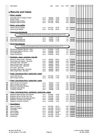 Descriptionsize price%u00a3/unitRRPcode123456789%u25a0Biscuits and Cakes%u274aBiona - cookiesChocolate Chip & Orange Cookiesorganic6x240g 13.903.08180404Muesli Cookieorganic6x240g 13.903.09180410Blueberry-filled Cookiesorganic12x175g 29.603.29180432Raspberry-filled Cookiesorganic12x175g 29.603.29180434%u274aBiona - syrup wafflesHazelnut Syrup Wafflesorganic12x175g 33.203.69180445Honey Syrup Wafflesorganic12x175g 29.603.29180447%u274aClearspring Oat biscuits%u2752Matcha Oat Biscuitsorganic12x40g 11.401.27180480%u2752Miso Maple Oat Biscuitsorganic12x40g 11.401.27180481%u2752Sweet Date Oat Biscuitsorganic12x40g 11.401.27180482%u274aDoves Farm Biscuits%u2752Wholemeal Digestive Biscuits - largeorganic12x400g 21.852.43181516%u2752Wholemeal Digestive Biscuits - smallorganic12x200g 13.201.47181515%u2752Fruity Oat Biscuitsorganic12x200g 16.151.81181517%u2752Ginger Oat Biscuitsorganic12x200g 18.902.11181519%u274aEverfresh - vegan - sprouted - long-lifeBanana & Walnut Cake - Sproutedorganic8x350g 26.454.41183503Carrot Cake with Raisins - Sproutedorganic8x350g 23.853.98183504Chocolate Cake - Sproutedorganic8x350g 24.604.10183506Date & Pecan Cake - Sproutedorganic8x350g 28.554.76183508Fig & Orange Cake - Sproutedorganic8x350g 24.604.10183511Fruit Cake - Sproutedorganic8x350g 23.903.98183514Rye Stem Ginger Cake - Sproutedorganic8x350g 28.554.76183518Stem Ginger Cake - Sproutedorganic8x350g 28.554.76183519%u274aFreee - from Doves Farm - gluten-free - veganLemon Zest Cookieorganic12x150g 17.801.98181525Stem Ginger Cookiesorganic12x150g 17.801.98181542%u274aFreee - from Doves Farm - gluten-free - vegan%u25c6Apple Oat Bar with Sultanasorganic18x35g 11.500.85181452%u25c6Apricot Oat Bar with Chiaorganic18x35g 11.500.85181455%u25c6Banana & Chocolate Oat Barsorganic18x35g 11.500.85181453%u25c6Chocolate Chip Oat Barorganic18x35g 11.500.85181460%u25c6Cranberry Oat Barsorganic18x35g 11.500.85181461%u274aFreee - from Doves Farm - multipacks - gluten-free - vegan%u25c6Multipack Apple Oat Bar with Sultanasorganic7x4x35g 14.652.79181470%u25c6Multipack Apricot Oat Bar with Chiaorganic7x4x35g 14.652.79181472%u25c6Multipack Banana & Chocolate Oat Barsorganic7x4x35g 14.652.79181473%u25c6Multipack Chocolate Chip Oat Barorganic7x4x35g 14.652.79181477%u25c6Multipack Cranberry Oat Barsorganic7x4x35g 14.652.79181478%u274aIsland Bakery%u25c6Apple Crumblesorganic12x125g 35.353.93182940%u25c6Chocolate Gingersorganic12x133g 37.05 V4.94182946%u25c6Lime Meltsorganic12x133g 37.05 V4.94182950%u25c6Lemon Meltsorganic12x133g 37.05 V4.94182952%u25c6Oat Crumblesorganic12x125g 29.803.31182954%u25c6Orange Meltsorganic12x133g 37.05 V4.94182956%u25c6Shortbreadorganic12x125g 29.803.31182957 On offer are Clearspring organic oat biscuits, the pricing below represents a discount of 15%. On offer are Doves organic biscuits, the pricing below represents a discount of 10%.%u25b2price rise %u25bcfall%u2748new product %u2752on offerPage 53%u272bsize or other change%u25c6offer ended