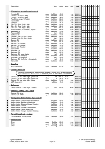 Descriptionsize price%u00a3/unitRRPcode123456789%u274aClearspring - www.clearspring.co.ukAvocado Oilorganic8x250ml 45.507.59200491Coconut Oil - virgin - 200gorganic6x220ml 20.654.59200492Coconut Oil - virgin - 400gorganic6x440ml 38.658.59200493Flax Oil (no longer VATable)organic8x250ml 32.305.38200496Hazelnut Oilorganic8x250ml 95.9015.98200501Hemp Oilorganic8x250ml 41.406.90200497%u25c6Olive Oil - Extra Virgin - Italyorganic8x250ml 44.907.49200500%u25c6Olive Oil - Extra Virgin - Italyorganic6x500ml 58.4512.99200502%u25c6Olive Oil - Extra Virgin - Italyorganic6x1l 103.4522.99200503Pumpkin Seed Oil - Toasted - Styrianorganic8x250ml 86.9014.49200512%u25c6Rapeseed Oilorganic6x500ml 22.004.89200511%u25c6Rapeseed Oilorganic6x1l 35.957.99200509Safflower Oilorganic6x500ml 44.959.99200513%u25c6Tunisian Olive Oil - Extra Virginorganic6x500ml 44.959.99200515%u25c6Tunisian Olive Oil - Extra Virginorganic6x1l 76.4516.99200516%u25c6Sesame Oilorganic6x500ml 37.758.39200517%u25c6Sesame Oilorganic6x1l 69.7015.49200518Sesame Oil - Toastedorganic6x150ml 20.204.49200521%u25c6Sesame Oil - Toastedorganic8x250ml 35.905.98200520%u25c6Sesame Oil - Toastedorganic6x500ml 44.959.99200522Soybean Oilorganic6x500ml 26.955.99200535%u25c6Sunflower Oilorganic6x500ml 20.204.49200525%u25c6Sunflower Oilorganic6x1l 33.707.49200527Sunflower Oil - clear plasticorganic1x2l 9.3512.46200529%u25c6Sunflower Oil - for Fryingorganic6x500ml 21.554.79200530%u25c6Sunflower Oil - for Fryingorganic6x1l 35.057.79200532Sunflower Oil - for Frying - clear plasticorganic1x2l 10.1013.49200534Walnut Oilorganic8x250ml 65.9010.98200537%u274aCocofinaMCT Coconut Oilorganic12x250ml 87.509.72200544%u274aCoconut Merchant%u2752Coconut Oil - raw extra virgin - plastic tuborganic 20l 216.4510.82200588%u2752Coconut Oil - raw extra virgin - plastic tuborganic 4l 46.3511.59200590%u2752Coconut Oil - raw extra virgin - glassorganic12x500ml 74.508.28200595%u2752MCT Coconut Oil1x500ml 17.9523.93200597%u274aEpikourosCan of Olive Oil - Extra Virgin - Greeceorganic1x5l 64.8086.40200620%u274aEssential Trading - raw - virginCoconut Oil - largeorganic6x690ml 56.2012.49200630Coconut Oil - smallorganic6x210ml 22.505.00200632%u274aFarrington's Mellow Yellow Rapeseed Oil%u25c6Mellow Yellow Cold Pressed Rapeseed Oil6x500ml 19.654.37200633%u25c6Mellow Yellow Blackberry Vinaigrette6x250ml 15.403.42200639%u25c6Mellow Yellow Balsamic Vinegar Dressing6x250ml 15.403.42200634%u25c6Mellow Yellow Chilli Oil6x250ml 14.703.27200635%u25c6Mellow Yellow Ultimate Chilli Dressing6x250ml 15.403.42200636%u25c6Mellow Yellow Classic Vinaigrette6x250ml 15.403.42200637%u25c6Mellow Yellow Honey & Mustard Dressing6x250ml 15.403.42200638%u274aForest Wholefoods - in glassCold Pressed E.V. Coconut Oilorganic12x500ml 74.608.31200640%u274aHappy ButterGheeorganic6x580g 85.5019.00200649Gheeorganic6x300g 49.3511.00200650Gheeorganic12x150g 58.306.50200654 On offer is Coconut Merchant, the pricing below represents a discount of 15% on new (significantly) higher 'off offer' prices. The new prices are: 20l %u00a3254.65, 4l %u00a354.55, 500ml %u00a387.65 and MCT %u00a321.10.%u25b2price rise %u25bcfall%u2748new product %u2752on offerPage 55%u272bsize or other change%u25c6offer ended