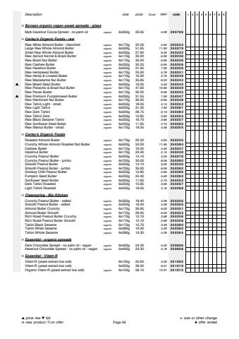 Descriptionsize price%u00a3/unitRRPcode123456789%u274aBonsan organic vegan sweet spreads - glassMylk Hazelnut Cocoa Spread - no palm oilorganic6x350g 26.955.99290786%u274aCarley's Organic Foods - rawRaw White Almond Butter - blanchedorganic6x170g 20.204.65250234Large Raw Whole Almond Butterorganic6x500g 51.9511.95250279Small Raw Whole Almond Butterorganic6x250g 27.606.35250232Raw Apricot Kernel & Brazil Butterorganic6x170g 30.206.95250236Raw Brazil Nut Butterorganic6x170g 30.206.95250238Raw Cashew Butterorganic6x250g 30.256.95250256Raw Hazelnut Butterorganic6x250g 31.957.35250258Raw Hempseed Butterorganic6x170g 25.005.76250241Raw Hemp & Linseed Butterorganic6x170g 16.303.75250239Raw Macadamia Nut Butterorganic6x170g 35.858.24250244%u25b2Raw Mixed Seed Butterorganic6x250g 19.354.45250243Raw Pistachio & Brazil Nut Butterorganic6x170g 47.6010.95250259Raw Pecan Butterorganic6x170g 30.206.95250245%u25b2Raw Premium Pumpkinseed Butterorganic6x250g 31.557.26250247Raw Rainforest Nut Butterorganic6x170g 30.206.95250248Raw Tahini Light - smallorganic6x250g 18.054.15250253Raw Light Tahini organic6x500g 31.307.20250281Raw Dark Tahini organic6x500g 26.756.15250283Raw Tahini Darkorganic6x250g 15.853.64250254Raw Black Sesame Tahiniorganic6x250g 16.703.84250257Raw Sunflower Seed Butterorganic6x250g 11.952.75250262Raw Walnut Butter - smallorganic6x170g 19.354.46250255%u274aCarley's Organic FoodsRoasted Almond Butterorganic6x170g 20.204.64250235Crunchy Whole Almond Roasted Nut Butterorganic6x500g 52.0011.95250284Cashew Butterorganic6x170g 19.354.45250237Hazelnut Butterorganic6x170g 22.405.15250240Crunchy Peanut Butterorganic6x250g 14.103.25250278Crunchy Peanut Butter - jumboorganic6x700g 35.008.06250280Smooth Peanut Butterorganic6x250g 14.103.25250230Smooth Peanut Butter - jumboorganic6x700g 35.008.06250282Smokey Chilli Peanut Butterorganic6x250g 15.853.65250286Pumpkin Seed Butterorganic6x250g 24.405.62250263Sunflower Seed Butterorganic6x250g 11.952.75250252Dark Tahini Roastedorganic6x250g 15.853.65250267Light Tahini Roastedorganic6x250g 18.054.16250268%u274aClearspring - Bio KitchenCrunchy Peanut Butter - saltedorganic6x350g 18.404.09250350Smooth Peanut Butter - saltedorganic6x350g 18.404.09250355Almond Butter Crunchyorganic6x170g 26.956.00250351Almond Butter Smoothorganic6x170g 26.956.00250353Rich Roast Peanut Butter Crunchyorganic6x170g 12.102.69250356Rich Roast Peanut Butter Smoothorganic6x170g 12.102.69250358Tahini Black Sesameorganic6x170g 15.703.49250360Tahini White Sesameorganic6x280g 19.304.29250362Tahini Whole Sesameorganic6x280g 19.304.29250364%u274aEssential - organic spreadsDark Chocolate Spread - no palm oil - veganorganic6x400g 24.305.40250606Hazelnut Chocolate Spread - no palm oil - veganorganic6x400g 23.305.18250608%u274aEssential - Vitam-RVitam-R (yeast extract low salt)6x125g 22.605.02251005Vitam-R (yeast extract low salt)6x250g 38.308.51251010Organic Vitam-R (yeast extract low salt)organic6x150g 58.1012.91251015%u25b2price rise %u25bcfall%u2748new product %u2752on offerPage 58%u272bsize or other change%u25c6offer ended