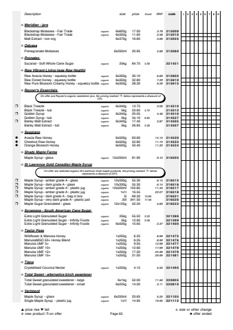 Descriptionsize price%u00a3/unitRRPcode123456789%u274aMeridian - jarsBlackstrap Molasses - Fair Trade organic6x600g 17.003.78315008Blackstrap Molasses - Fair Trade organic6x350g 11.602.58315010Malt Extract - non org6x370g 16.603.69315025%u274aOdyseaPomegranate Molasses6x250ml 20.954.66315060%u274aPronatecSucanat - Soft Whole Cane Sugar organic 25kg 84.703.39321451%u274aRaw Vibrant Living (was Raw Health)Raw Acacia Honey - squeezy bottleorganic6x350g 30.106.69315605Raw Forest Honey - squeezy bottleorganic6x350g 32.807.29315610Raw Pure Blossom Creamy Honey - squeezy bottleorganic6x350g 28.306.29315615%u274aRayner's Essentials %u2752Black Treacleorganic6x340g 13.753.06314510Black Treacle - tuborganic 5kg 23.604.72314512%u2752Golden Syruporganic6x340g 20.054.46314516Golden Syrup - tuborganic 5kg 34.106.82314527%u2752Barley Malt Extractorganic6x340g 17.403.87314505Barley Malt Extract - tuborganic 5kg 26.955.39314507%u274aSeggiano%u25c6Acacia Raw Honey6x500g 63.6014.13314530%u25c6Chestnut Raw Honey6x500g 52.8011.73314532%u25c6Orange Blossom Honey6x500g 50.4011.20314534%u274aShady Maple FarmsMaple Syrup - glassorganic12x250ml 81.909.10316505%u274aSt Lawrence Gold Canadian Maple Syrup%u2752Maple Syrup - amber grade A - glassorganic12x330g 55.306.14316515%u2752Maple Syrup - dark grade A - glassorganic12x330g 55.306.14316516%u2752Maple Syrup - amber grade A - plastic jugorganic12x500ml 102.8511.43316517%u2752Maple Syrup - amber grade A - plastic jugorganic1x1l 16.5522.07316518%u2752Maple Syrup - dark grade A - bag in boxorganic 5l 69.3013.86316521Maple Syrup - very dark grade A - plastic pailorganic 20l 341.5017.08316520%u2752Maple Sugar Granulated - glassorganic12x125g 52.505.83316522%u274aSyramena - South American Cane Sugar Extra Light Granulated Sugarorganic 25kg 55.502.22321386Extra Light Granulated Sugar - Infinity Foodsorganic 5kg 12.902.58321399Extra Light Granulated Sugar - Infinity Foodsorganic6x500g 10.652.37321400%u274aTaylor PassWildflower & Manuka Honey1x250g 6.258.99321475ManukaMGO 50+ Honey Blend1x250g 6.258.99321476Manuka UMF 5+1x250g 9.0512.99321477Manuka UMF 10+1x250g 12.6017.99321478Manuka UMF 12+1x250g 17.5024.99321479Manuka UMF 15+1x250g 21.0029.99321481%u274aTianaCrystallised Coconut Nectarorganic1x250g 4.155.55321495%u274aTotal Sweet - alternative birch sweetenerTotal Sweet granulated sweetener - large 6x1kg 52.0011.56320805Total Sweet granulated sweetener - small 6x225g 14.003.11320810%u274aVertmontMaple Syrup - glassorganic6x250ml 23.655.25321105Single Maple Syrup - plastic jugorganic1x1l 14.9519.95321115 On offer are selected organic St Lawrence Gold maple products, the pricing marked%u2752 belowrepresents a discount of 20%. On offer are Rayner's organic sweetener jars, the pricing marked%u2752 below represents a discount of 15%.%u25b2price rise %u25bcfall%u2748new product %u2752on offerPage 63%u272bsize or other change%u25c6offer ended