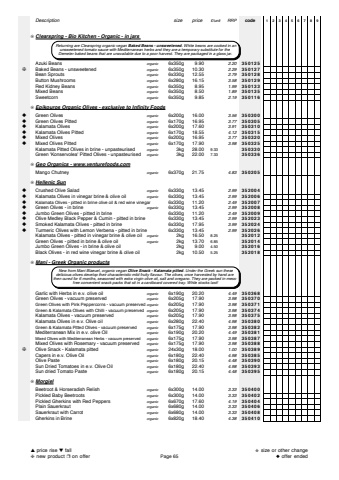 Descriptionsize price%u00a3/unitRRPcode123456789%u274aClearspring - Bio Kitchen - Organic - in jars Azuki Beansorganic6x350g 9.902.20350125%u2748Baked Beans - unsweetened organic6x350g 10.302.29350127Bean Sproutsorganic6x330g 12.552.79350128Button Mushroomsorganic6x280g 16.153.58350129Red Kidney Beansorganic6x350g 8.951.99350133Mixed Beansorganic6x350g 8.501.89350135Sweetcorn organic6x350g 9.852.19350116%u274aEpikouros Organic Olives - exclusive to Infinity Foods%u25c6Green Olivesorganic6x200g 16.003.56350300%u25c6Green Olives Pittedorganic6x170g 16.953.77350305%u25c6Kalamata Olivesorganic6x200g 17.603.91350310%u25c6Kalamata Olives Pittedorganic6x170g 18.554.12350315%u25c6Mixed Olivesorganic6x200g 16.953.77350320%u25c6Mixed Olives Pittedorganic6x170g 17.903.98350325Kalamata Pitted Olives in brine - unpasteurisedorganic 3kg 28.009.33350330Green 'Konservolea' Pitted Olives - unpasteurisedorganic 3kg 22.007.33350336%u274aGeo Organics - www.venturefoods.comMango Chutneyorganic6x370g 21.754.83350205%u274aHellenic Sun%u25c6Crushed Olive Saladorganic6x330g 13.452.99352004%u25c6Kalamata Olives in vinegar brine & olive oilorganic6x330g 13.452.99352006%u25c6Kalamata Olives - pitted in brine olive oil & red wine vinegar6x330g 11.202.49352007%u25c6Green Olives - in brineorganic6x330g 13.452.99352008%u25c6Jumbo Green Olives - pitted in brine6x330g 11.202.49352009%u25c6Olive Medley Black Pepper & Cumin - pitted in brine 6x330g 13.452.99352023%u25c6Smoked Kalamata Olives - pitted in brine 6x330g 17.953.99352024%u25c6Turmeric Olives with Lemon Verbena - pitted in brine 6x330g 13.452.99352026Kalamata Olives - pitted in vinegar brine & olive oilorganic 2kg 16.508.25352012Green Olives - pitted in brine & olive oilorganic 2kg 13.706.85352014Jumbo Green Olives - in brine & olive oil 2kg 9.004.50352016Black Olives - in red wine vinegar brine & olive oil 2kg 10.505.25352018%u274aMani - Greek Organic productsGarlic with Herbs in e.v. olive oilorganic6x190g 20.204.49350368Green Olives - vacuum preservedorganic6x205g 17.903.98350370Green Olives with Pink Peppercorns - vacuum preservedorganic6x205g 17.903.98350371Green & Kalamata Olives with Chilli - vacuum preservedorganic6x205g 17.903.98350374Kalamata Olives - vacuum preservedorganic6x205g 17.903.98350375Kalamata Olives in e.v. Olive oilorganic6x280g 22.404.98350380Green & Kalamata Pitted Olives - vacuum preservedorganic6x175g 17.903.98350382Mediterranean Mix in e.v. olive Oilorganic6x190g 20.204.49350381Mixed Olives with Mediterranean Herbs - vacuum preservedorganic6x175g 17.903.98350387Mixed Olives with Rosemary - vacuum preservedorganic6x175g 17.903.98350388%u2748Olive Snack - Kalamata pittedorganic24x30g 18.001.00350389Capers in e.v. Olive Oilorganic6x180g 22.404.98350385Olive Pasteorganic6x180g 20.154.48350390Sun Dried Tomatoes in e.v. Olive Oilorganic6x180g 22.404.98350393Sun dried Tomato Pasteorganic6x180g 20.154.48350395%u274aMorgielBeetroot & Horseradish Relishorganic6x300g 14.003.33350400Pickled Baby Beetrootsorganic6x300g 14.003.33350402Pickled Gherkins with Red Peppersorganic6x670g 17.604.19350404Plain Sauerkrautorganic6x680g 14.003.33350406Sauerkraut with Carrotorganic6x680g 14.003.33350408Gherkins in Brineorganic6x820g 18.404.38350410 Returning are Clearspring organic vegan Baked Beans - unsweetened. White beans are cooked in anunsweetened tomato sauce with Mediterranean herbs and they are a temporary substitute for the Demeter baked beans that are unavailable due to a poor harvest. They are packaged in a glass jar. New from Mani Blaeuel, organic vegan Olive Snack - Kalamata pitted. Under the Greek sun these delicious olives develop their characteristic mild fruity flavour. The olives, once harvested by hand are then cured for 6 months, seasoned with extra virgin olive oil, salt and oregano. They are packed in messfree convenient snack packs that sit in a cardboard covered tray. While stocks last!%u25b2price rise %u25bcfall%u2748new product %u2752on offerPage 65%u272bsize or other change%u25c6offer ended