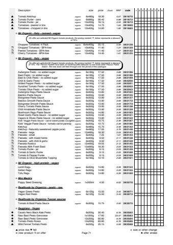 Descriptionsize price%u00a3/unitRRPcode123456789%u25b2Tomato Ketchuporganic6x480g 18.304.07391670%u25b2Tomato Pur%u00e9e - cans organic6x890g 26.455.88391672%u25b2Tomato Pur%u00e9e - jarorganic12x200g 18.152.02391673%u25b2Tomatoes - peeled in tinsorganic12x400g 14.751.64391680%u25b2Tomatoes - chopped in tinsorganic12x400g 14.601.62391685%u274aMr Organic - Italy - canned - veganChopped Tomatoes -4 Packorganic6x4x400g 25.155.59392128%u2752Chopped Tomatoes - BPA-freeorganic12x400g 11.401.27392130%u2752Peeled Tomatoes - BPA-freeorganic12x400g 11.401.27392132%u2752Cherry Tomatoes - BPA-freeorganic12x400g 14.451.61392125%u274aMr Organic - Italy - veganAubergine Pesto - no added sugarorganic6x190g 17.503.89392196Basil Pesto - no added sugarorganic6x190g 17.503.89392198Basil & Chilli Pesto - no added sugarorganic6x190g 17.503.89392199Chilli & Garlic Pestoorganic6x190g 17.503.89392200Grilled Pepper Pesto - no added sugarorganic6x190g 17.503.89392201Sundried Tomato Pesto - no added sugarorganic6x190g 17.503.89392202Tomato Olive Pesto - no added sugarorganic6x190g 17.503.89392203Aubergine Ragu Pasta Sauceorganic6x350g 14.803.29392162Basilico Pasta Sauceorganic6x350g 13.903.09392135Bolognese Pasta Sauceorganic6x350g 13.903.09392137Basilico Smooth Pasta Sauceorganic6x350g 13.903.09392172Bolognese Smooth Pasta Sauceorganic6x350g 13.903.09392173Cherry Tomato Pasta Sauceorganic6x350g 13.903.09392138Chilli Arrabbiata Pasta Sauceorganic6x350g 13.903.09392139Mushroom Ragu Pasta Sauceorganic6x350g 14.803.29392183Roast Garlic Pasta Sauce - no added sugarorganic6x350g 13.903.09392151Capers & Olives Pasta Sauce - no added sugarorganic6x350g 13.903.09392152Kids' Veggie Pasta Sauce - carrot sweet potato courgetteorganic6x200g 10.752.39392187Kids' Veggie Pasta Sauce - tomato carrot parsniporganic6x200g 10.752.39392188Ketchuporganic6x480g 15.703.49392142Ketchup - Naturally sweetened (apple juice)organic6x480g 17.053.79392148%u2752Passata - largeorganic12x690g 18.302.03392143%u2752Passata - smallorganic6x400g 7.251.61392144%u2752Passata - with mixed herbsorganic6x400g 9.502.11392158%u2752Passata - with chilli & garlicorganic6x400g 9.502.11392159%u2752Passata Rusticaorganic12x690g 19.052.12392145%u2752Passata With Fresh Basilorganic12x690g 18.302.03392153%u2752Tomato Pur%u00e9e - jarorganic6x200g 9.152.03392149%u2752Tomato & Garlic Pur%u00e9e organic6x200g 9.152.03392168%u2752Tomato & Pepper Pur%u00e9eorganic6x200g 9.152.03392169Tomato & Olive Bruschetta Toppingorganic6x190g 12.102.69392161%u274aMr Organic - high protein - veganLentil Ragu organic6x350g 14.803.29392154Seitan Ragu organic6x350g 14.803.29392155Tofu Raguorganic6x350g 14.803.29392160%u274aMrs Mack'sPoppy Seed Dressingorganic1x200ml 4.506.02392270%u274aRealfoods by Organico - pesto - raw Vegan Green Pestoorganic6x120g 15.503.44393071Vegan Red Pestoorganic6x120g 15.503.44393073%u274aRealfoods by Organico Tuscan saucesTomato & Basil Pasta Sauce organic6x300g 15.753.50393075%u274aSeggiano - Vegan%u25c6Cavalo Nero Black Kale Pesto6x200g 30.406.76392582%u25c6Raw Basil Pesto Genovese1x1000g 17.6023.47392583%u25c6Raw Basil Pesto Genovese12x200g 60.806.76392584%u25c6Tomato Pesto Rosso12x200g 60.806.76392586%u25b2Wild Fennel Tomato Pesto6x220g 25.155.59392588 On offer are selected Mr Organic tomato products, the pricing marked%u2752 below represents a discountof 15%. On offer are selected Mr Organic tomato products, the pricing marked%u2752 below represents a discountof 15%. The 'Flavour Pastes' have been re-named pur%u00e9es because no one knew what 'Flavour Paste' meant. The new stock will feed through over the period of this catalogue.%u25b2price rise %u25bcfall%u2748new product %u2752on offerPage 71%u272bsize or other change%u25c6offer ended