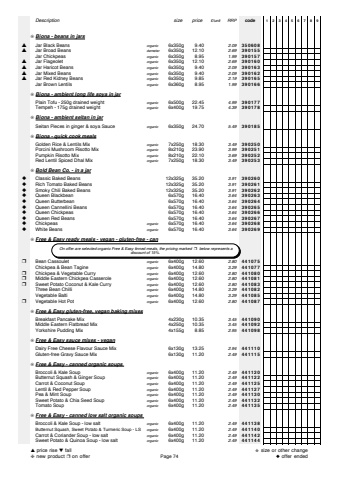 Descriptionsize price%u00a3/unitRRPcode123456789%u274aBiona - beans in jars%u25b2Jar Black Beansorganic6x350g 9.402.09350608%u25b2Jar Broad Beansdemeter6x350g 12.102.69390155Jar Chickpeasorganic6x350g 8.951.99390157%u25b2Jar Flageoletorganic6x350g 12.102.69390160%u25b2Jar Haricot Beansorganic6x350g 9.402.09390163%u25b2Jar Mixed Beansorganic6x350g 9.402.09390162%u25b2Jar Red Kidney Beansorganic6x350g 9.852.19390165Jar Brown Lentilsorganic6x360g 8.951.99390166%u274aBiona - ambient long life soya in jarPlain Tofu - 250g drained weightorganic6x500g 22.454.99390177Tempeh - 175g drained weightorganic6x400g 19.754.39390178%u274aBiona - ambient seitan in jarSeitan Pieces in ginger & soya Sauceorganic6x350g 24.705.49390185%u274aBiona - quick cook mealsGolden Rice & Lentils Mixorganic7x250g 18.303.49390250Porcini Mushroom Risotto Mixorganic8x210g 23.903.99390251Pumpkin Risotto Mixorganic8x210g 22.103.69390252Red Lentil Spiced Dhal Mixorganic7x250g 18.303.49390253%u274aBold Bean Co. - in a jar%u25c6Classic Baked Beans12x325g 35.203.91390260%u25c6Rich Tomato Baked Beans12x325g 35.203.91390261%u25c6Smoky Chili Baked Beans12x325g 35.203.91390262%u25c6Queen Blackbean 6x570g 16.403.64390263%u25c6Queen Butterbean 6x570g 16.403.64390264%u25c6Queen Cannellini Beans 6x570g 16.403.64390265%u25c6Queen Chickpeas 6x570g 16.403.64390266%u25c6Queen Red Beans 6x570g 16.403.64390267%u25c6Chickpeas organic6x570g 16.403.64390268%u25c6White Beans organic6x570g 16.403.64390269%u274aFree & Easy ready meals - vegan - gluten-free - can%u2752Bean Cassouletorganic6x400g 12.602.80441075Chickpea & Bean Tagineorganic6x400g 14.803.29441077%u2752Chickpea & Vegetable Curryorganic6x400g 12.602.80441080%u2752Middle Eastern Chickpea Casseroleorganic6x400g 12.602.80441081%u2752Sweet Potato Coconut & Kale Curryorganic6x400g 12.602.80441083Three Bean Chilliorganic6x400g 14.803.29441082Vegetable Baltiorganic6x400g 14.803.29441085%u2752Vegetable Hot Potorganic6x400g 12.602.80441087%u274aFree & Easy gluten-free, vegan baking mixesBreakfast Pancake Mix4x230g 10.353.45441090Middle Eastern Flatbread Mix4x250g 10.353.45441092Yorkshire Pudding Mix4x155g 8.852.95441098%u274aFree & Easy sauce mixes - veganDairy Free Cheese Flavour Sauce Mix6x130g 13.252.94441110Gluten-free Gravy Sauce Mix6x130g 11.202.49441115%u274aFree & Easy - canned organic soups Broccoli & Kale Souporganic6x400g 11.202.49441120Butternut Squash & Ginger Souporganic6x400g 11.202.49441122Carrot & Coconut Souporganic6x400g 11.202.49441125Lentil & Red Pepper Souporganic6x400g 11.202.49441127Pea & Mint Souporganic6x400g 11.202.49441130Sweet Potato & Chia Seed Souporganic6x400g 11.202.49441132Tomato Souporganic6x400g 11.202.49441135%u274aFree & Easy - canned low salt organic soups Broccoli & Kale Soup - low saltorganic6x400g 11.202.49441138Butternut Squash, Sweet Potato & Turmeric Soup - LSorganic6x400g 11.202.49441140Carrot & Coriander Soup - low saltorganic6x400g 11.202.49441142Sweet Potato & Quinoa Soup - low saltorganic6x400g 11.202.49441144 On offer are selected organic Free & Easy tinned meals, the pricing marked%u2752 below represents a discount of 15%.%u25b2price rise %u25bcfall%u2748new product %u2752on offerPage 74%u272bsize or other change%u25c6offer ended