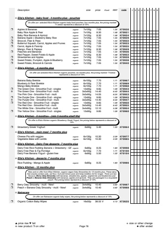 Descriptionsize price%u00a3/unitRRPcode123456789%u274aElla's Kitchen - baby food - 4 months plus - pouches%u2752Apples & Bananasorganic7x120g 7.051.34470930Baby Rice Apple & Pear organic7x120g 8.301.58470931Baby Rice Banana & Apricot organic7x120g 8.301.58470934%u2752Banana Apple + Blueberry Baby Riceorganic7x120g 7.051.34470929%u2752Broccoli, Pear & Peasorganic7x120g 7.051.34470932%u2752Butternut Squash, Carrot, Apples and Prunesorganic7x120g 7.051.34470933%u2752Carrot, Apple & Parsniporganic7x120g 7.051.34470935Mango, Pear & Papayaorganic7x120g 8.301.58470949%u2752Peaches and Bananasorganic7x120g 7.051.34470936Red Pepper, Sweet Potato & Appleorganic7x120g 8.301.58470952%u2752Strawberries and Applesorganic7x120g 7.051.34470939%u2752Sweet Potato, Pumpkin, Apple & Blueberryorganic7x120g 7.051.34470938%u2752Sweet Potato, Broccoli & Carrotsorganic7x120g 7.051.34470940%u274aElla's Kitchen - 6 months plusBanana Baby Brekkieorganic6x100g 7.701.71470967Blueberry & Pear Brekkieorganic6x100g 7.701.71470969Mango Baby Brekkieorganic6x100g 7.701.71470968%u2752The Green One - Smoothie Fruit - singlesorganic12x90g 9.851.09470943%u272bThe Green One - Smoothie Fruit - multiorganic3x5x90g 14.406.40470944The Pink One - Smoothie Fruit - multiorganic3x5x90g 14.056.24470953%u2752The Purple One - Smoothie Fruit - singlesorganic12x90g 9.851.09470945%u272bThe Purple One - Smoothie Fruit - multiorganic3x5x90g 14.406.40470947%u2752The Red One - Smoothie Fruit - singlesorganic12x90g 9.851.09470950The Red One - Smoothie Fruit - multiorganic3x5x90g 14.406.40470955The White One - Smoothie Fruit - multiorganic3x4x90g 12.105.38470954%u2752The Yellow One - Smoothie Fruit - singlesorganic12x90g 9.851.09470960%u274aElla's Kitchen - 6 months+ - (min 5 months shelf life)%u2752Strawberry Greek Yoghurtorganic6x90g 5.401.20470964%u274aElla's Kitchen - main meal -7 months plusCheese Pie with veggiesorganic6x130g 10.302.29470977Vegetable Bake with Lentilsorganic6x130g 10.302.29470985%u274aElla's Kitchen - Dairy Free desserts -7 months plusDairy Free Rice Pudding Banana + Strawberry - GForganic6x80g 8.251.83470998Dairy Free Pear & Fig Porridgeorganic6x100g 7.701.71470100Dairy Free Banana Yogurt - gluten freeorganic6x90g 5.501.22470104%u274aElla's Kitchen - desserts -7 months plusRice Pudding - Mango & Appleorganic6x80g 8.251.83470986%u274aElla's Kitchen - 12 months plus%u2752Berry Oaty Smooshy - multi - New!organic3x4x90g 10.404.62470987%u2752Peach + Banana Oaty Smooshy - multi - New!organic3x4x90g 10.404.62470988%u274aNatracare%u2752Organic Cotton Baby Wipesorganic16x50p 38.55 V4.13472635 New and on offer from Ellas' Kitchen, organic vegan Oaty Smooshies for 12 months plus. These dairyfree snacks contain oats, oat flour, fruit and lemon juice and keep toddlers full for longer. There are twoflavours:Berry Oaty Smooshy with bananas, strawberries, apples, raspberries and blueberries and Peach + Banana Oaty Smooshy with bananas, apples and apricots. They are packaged in a recyclablepouch. The pricing below represents a discount of 15%. On offer are selected Ella's Kitchen organic baby food pouches, four months plus, the pricing marked %u2752 below represents a discount of 15%. On offer are selected Ella's Kitchen organic pouches, six months plus, the pricing marked%u2752 belowrepresents a discount of 15%. On offer is Ella's Kitchen organic Strawberry Greek Yogurt, the pricing below represents a discount of15%. On offer are Natracare organic baby wipes, the pricing below represents a discount of 10%.%u25b2price rise %u25bcfall%u2748new product %u2752on offerPage 78%u272bsize or other change%u25c6offer ended