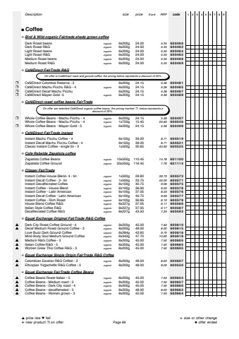 Descriptionsize price%u00a3/unitRRPcode123456789%u25a0Coffee %u274aBird & Wild organic Fairtrade shade grown coffeeDark Roast beansorganic6x200g 24.005.34600460Dark Roast R&Gorganic6x200g 24.005.34600462Light Roast beansorganic6x200g 24.005.34600464Light Roast R&Gorganic6x200g 24.005.34600465Medium Roast beansorganic6x200g 24.005.34600468Medium Roast R&Gorganic6x200g 24.005.34600469%u274aCaf%u00e9Direct FairTrade R&G%u2752Caf%u00e9Direct Colombia Reserva - 36x200g 24.155.36600481%u2752Caf%u00e9Direct Machu Picchu R&G - 4organic6x200g 24.155.36600485%u2752Caf%u00e9Direct Decaf Machu Picchu6x200g 24.155.36600487%u2752Caf%u00e9Direct Mayan Gold -5organic6x200g 24.155.36600489%u274aCaf%u00e9Direct roast coffee beans FairTrade%u2752Whole Coffee Beans - Machu Picchu - 4organic6x200g 24.155.36600497Whole Coffee Beans - Machu Picchu - 4organic1x750g 15.4520.60600546%u2752Whole Coffee Beans - Mayan Gold - 5organic6x200g 24.155.36600499%u274aCaf%u00e9Direct FairTrade instantInstant Machu Picchu Coffee - 46x100g 39.208.71600519Instant Decaf Machu Picchu Coffee - 46x100g 39.208.71600521Classic Instant Coffee - single tin - 31x500g 30.6540.92600525%u274aCafe Rebelde Zapatista coffeeZapatista Coffee Beansorganic10x500g 110.4514.78601100Zapatista Coffee Groundorganic20x250g 116.457.76601114%u274aClipper FairTradeInstant Coffee House Blend- 4 - tinorganic1x500g 29.8039.73600572Instant Decaf Coffee - 3 - tinorganic1x500g 33.7545.00600571Instant Decaffeinated Coffeeorganic6x100g 40.759.06600575Instant Coffee - House Blend organic6x100g 36.908.20600578Instant Coffee - Latin Americanorganic6x100g 37.058.23600576Instant Decaf Coffee - Latin Americanorganic6x100g 40.759.06500577Instant Coffee - Rich Roastorganic6x100g 36.858.19600579House Blend Coffee R&Gorganic8x227g 37.056.17600580Italian Style Coffee R&Gorganic8x227g 37.056.17600587Decaffeinated Coffee R&Gorganic8x227g 43.507.25600592%u274aEqual Exchange Original FairTrade R&G Coffee%u25b2Dark City Roast Coffee Ground - 4organic8x200g 45.007.50600610%u25b2Decaf Medium Roast Ground Coffee - 3organic8x200g 48.008.00600615Love Buzz Dark Ground Coffeeorganic6x284g 43.659.70600616Mind Body Soul Medium Ground Coffeeorganic6x340g 47.7010.60600618%u25b2Medium R&G Coffee - 3organic8x200g 45.007.50600605%u25b2Italian Coffee R&G - 5organic8x200g 45.007.50600685%u25b2Women Grew This Coffee R&G - 3organic8x200g 45.007.50600695%u274aEqual Exchange Single Origin FairTrade R&G Coffee%u25b2Colombian Excelso R&G Coffee - 3organic8x200g 48.008.00600607%u25b2Ethiopian Yirgacheffe R&G Coffee - 3organic8x200g 48.008.00600550%u274aEqual Exchange FairTrade Coffee Beans%u25b2Coffee Beans Roast-Italian - 5organic8x200g 45.007.50600654%u25b2Coffee Beans - Medium roast - 3organic8x200g 45.007.50600657%u25b2Coffee Beans - Dark City roast - 4organic8x200g 45.007.50600660%u25b2Coffee Beans - decaffeinated - 3organic8x200g 48.008.00600662%u25b2Coffee Beans - Women grown - 3organic8x200g 45.007.50600664 On offer is Caf%u00e9Direct roast and ground coffee, the pricing below represents a discount of 20%. On offer are selected Caf%u00e9Direct organic coffee beans, the pricing marked %u2752 below represents a discount of 20%.%u25b2price rise %u25bcfall%u2748new product %u2752on offerPage 89%u272bsize or other change%u25c6offer ended