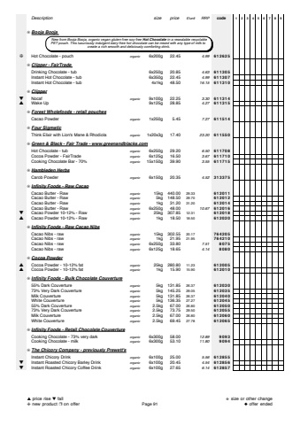 Descriptionsize price%u00a3/unitRRPcode123456789%u274aBooja Booja %u2748Hot Chocolate - pouchorganic6x200g 22.454.99612625%u274aClipper - FairTrade Drinking Chocolate - tub6x250g 20.854.63611305Instant Hot Chocolate - tub6x350g 22.454.99611307Instant Hot Chocolate - tub4x1kg 48.5016.15611310%u274aClipper%u25bcNocaforganic9x100g 22.253.30611314%u25b2Wake Up 9x125g 28.854.27611315%u274aForest Wholefoods - retail pouchesCacao Powderorganic1x250g 5.457.27611514%u274aFour SigmaticThink Elixir with Lion's Mane & Rhodiolaorganic1x20x3g 17.4023.20611550%u274aGreen & Black - Fair Trade - www.greenandblacks.comHot Chocolate - tuborganic6x250g 29.206.50611708Cocoa Powder - FairTradeorganic6x125g 16.503.67611710Cooking Chocolate Bar - 70%organic15x150g 39.903.55611715%u274aHambleden HerbsCarob Powderorganic6x150g 20.354.52313375%u274aInfinity Foods - Raw CacaoCacao Butter - Raworganic 15kg 440.0029.33612011Cacao Butter - Raworganic 5kg 148.5029.70612012Cacao Butter - Raworganic 1kg 31.2031.20612014Cacao Butter - Raworganic6x250g 48.0010.67612016%u25bcCacao Powder 10-12% - Raworganic 25kg 307.8512.31612018%u25b2Cacao Powder 10-12% - Raworganic 1kg 18.5018.50612020%u274aInfinity Foods - Raw Cacao NibsCacao Nibs - raw organic 15kg 302.5520.17764205Cacao Nibs - raw organic 1kg 21.9521.95764210Cacao Nibs - raw organic6x250g 33.807.518075Cacao Nibs - raw organic6x125g 18.654.148080%u274aCocoa Powder%u25b2Cocoa Powder - 10-12% fatorganic 25kg 280.8011.23612005%u25b2Cocoa Powder - 10-12% fatorganic 1kg 15.9015.90612010%u274aInfinity Foods - Bulk Chocolate Couverture55% Dark Couvertureorganic 5kg 131.8526.3761203073% Very Dark Couvertureorganic 5kg 145.2529.05612035Milk Couvertureorganic 5kg 131.8526.37612040White Couvertureorganic 5kg 136.3527.2761204555% Dark Couvertureorganic 2.5kg 67.0026.8061205073% Very Dark Couvertureorganic 2.5kg 73.7529.50612055Milk Couvertureorganic 2.5kg 67.0026.80612060White Couvertureorganic 2.5kg 69.4527.78612065%u274aInfinity Foods - Retail Chocolate CouvertureCooking Chocolate - 73% very darkorganic6x300g 58.0012.899093Cooking Chocolate - milkorganic6x300g 53.1011.809094%u274aThe Chicory Company - previously Prewett'sInstant Chicory Drinkorganic6x100g 25.005.56612855%u25bcInstant Roasted Chicory Barley Drinkorganic6x100g 20.454.54612856%u25bcInstant Roasted Chicory Coffee Drinkorganic6x100g 27.656.14612857 New from Booja Booja, organic vegan gluten-free soy-free Hot Chocolate in a resealable recyclable PET pouch. This luxuriously indulgent dairy-free hot chocolate can be mixed with any type of milk to create a rich smooth and deliciously comforting drink.%u25b2price rise %u25bcfall%u2748new product %u2752on offerPage 91%u272bsize or other change%u25c6offer ended
