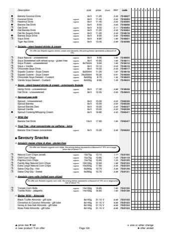 Descriptionsize price%u00a3/unitRRPcode123456789%u25c6Barista Coconut Drink6x1l 11.202.49724607%u2752Coconut Drinkorganic6x1l 11.452.54724593%u2752Hazelnut Drinkorganic6x1l 11.452.54724594%u25c6Barista Oat Drink6x1l 9.002.00724608%u2752Oat Drinkorganic6x1l 9.502.11724595%u25c6Oat Barista Drinkorganic6x1l 11.202.49724584Oat No Sugars Drinkorganic6x1l 11.202.49724616%u25c6Barista Soya Drinkorganic6x1l 9.002.00724005%u2752Soya Drinkorganic6x1l 8.801.96724601Tiger Nut Drinkorganic6x1l 13.452.99724598%u274aSojade - plant based drinks & cream%u2752Soya Natural - unsweetenedorganic8x1l 9.901.65724605%u2752Soya Sweetened with wheat syrup - gluten freeorganic8x1l 10.951.83724611%u2752Soya Protein - unsweetenedorganic8x750ml 9.901.65724612%u2752Soya + Vanillaorganic8x1l 12.152.03724615%u2752Chocolate Soya Drink organic8x1l 14.552.43724617%u2752Sojade Cuisine - Soya Creamorganic8x500ml 11.201.87724618%u2752Sojade Cuisine - Soya Creamorganic24x200ml 16.300.91724620%u2752Chocolate Soya Dessert - Custardorganic8x530g 8.701.45724622%u2752Vanilla Soya Dessert - Custardorganic8x530g 8.951.49724624%u274aSoon - plant based drinks & cream - previously SojadeHemp Drink - unsweetenedorganic8x1l 17.302.88724648Oat Drink - unsweetenedorganic8x1l 12.052.00724653%u274aSproud pea milkSproud - Unsweetened6x1l 10.002.22726530Sproud Barista6x1l 10.002.22726536Sproud Barista Zero6x1l 10.002.22726537Sproud Vanilla6x1l 10.002.22726539%u25c6Sproud Cooking/Whipping Cream6x1l 19.804.40726541%u274aWild OatBarista Oat Drink12x1l 17.601.95726547%u274aYogi Tea - chai concentrate no caffeine - tetraBarista Chai Classic concentrateorganic6x1l 15.203.46726555%u25a0Savoury Snacks%u274aAmaizin maize chips & dips - gluten-free%u2752Natural Corn Chips (small)organic15x75g 13.151.17750105%u2752Chilli Corn Chipsorganic15x75g 13.851.23750110%u2752Paprika Corn Chipsorganic15x75g 13.851.23750120%u2752Family Bag Natural Corn Chipsorganic10x150g 12.601.68750123%u2752Extra Large Natural Corn Chips organic10x250g 17.602.35750124%u2752Salsa Chip-Dip - Hot organic6x260g 10.702.38750126%u2752Salsa Chip-Dip - Sweet organic6x260g 10.702.38750131%u274aAmaizin corn rolls (rolled corn chips)%u2752Tomato Corn Rolls organic14x100g 16.851.60750135%u2752Tortilla Rolls - Jalape%u00f1oorganic14x100g 16.851.60750136%u274aBetter With - AlmondsBlack Truffle Almonds - gift tube8x140g 31.15 V6.68750150Cinnamon & Coconut Almonds - gift tube8x140g 31.15 V6.68750152Honey & Sea Salt Almonds - gift tube8x140g 31.15 V6.68750154Rose Petal Almonds - gift tube8x140g 31.15 V6.68750155 On offer are Amaizin organic corn chips, the pricing below represents a discount of 15% on a range price rise of about 7%. On offer are Amaizin organic corn rolls, the pricing below represents a discount of 15% on a range pricerise of about 7%. On offer are Sojade organic drinks, cream and desserts, the pricing below represents a discount of 15%.%u25b2price rise %u25bcfall%u2748new product %u2752on offerPage 100%u272bsize or other change%u25c6offer ended
