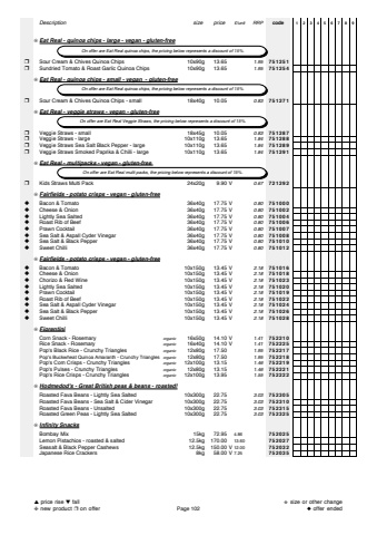 Descriptionsize price%u00a3/unitRRPcode123456789%u274aEat Real - quinoa chips - large - vegan - gluten-free%u2752Sour Cream & Chives Quinoa Chips10x90g 13.651.95751251%u2752Sundried Tomato & Roast Garlic Quinoa Chips10x90g 13.651.95751254%u274aEat Real - quinoa chips - small - vegan - gluten-free%u2752Sour Cream & Chives Quinoa Chips - small 18x40g 10.050.83751271%u274aEat Real - veggie straws - vegan - gluten-free%u2752Veggie Straws - small18x45g 10.050.83751287%u2752Veggie Straws - large10x110g 13.651.84751288%u2752Veggie Straws Sea Salt Black Pepper - large10x110g 13.651.84751289%u2752Veggie Straws Smoked Paprika & Chilli - large10x110g 13.651.84751291%u274aEat Real - multipacks - vegan - gluten-free %u2752Kids Straws Multi Pack24x20g 9.90 V0.67721292%u274aFairfields - potato crisps - vegan - gluten-free%u25c6Bacon & Tomato36x40g 17.75 V0.80751000%u25c6Cheese & Onion36x40g 17.75 V0.80751002%u25c6Lightly Sea Salted36x40g 17.75 V0.80751004%u25c6Roast Rib of Beef36x40g 17.75 V0.80751006%u25c6Prawn Cocktail36x40g 17.75 V0.80751007%u25c6Sea Salt & Aspall Cyder Vinegar36x40g 17.75 V0.80751008%u25c6Sea Salt & Black Pepper36x40g 17.75 V0.80751010%u25c6Sweet Chilli36x40g 17.75 V0.80751012%u274aFairfields - potato crisps - vegan - gluten-free%u25c6Bacon & Tomato10x150g 13.45 V2.18751016%u25c6Cheese & Onion10x150g 13.45 V2.18751018%u25c6Chorizo & Red Wine10x150g 13.45 V2.18751023%u25c6Lightly Sea Salted10x150g 13.45 V2.18751020%u25c6Prawn Cocktail10x150g 13.45 V2.18751019%u25c6Roast Rib of Beef10x150g 13.45 V2.18751022%u25c6Sea Salt & Aspall Cyder Vinegar10x150g 13.45 V2.18751024%u25c6Sea Salt & Black Pepper10x150g 13.45 V2.18751026%u25c6Sweet Chilli10x150g 13.45 V2.18751028%u274aFiorentiniCorn Snack - Rosemary organic16x50g 14.10 V1.41752210Rice Snack - Rosemary organic16x40g 14.10 V1.41752225Pop's Black Rice - Crunchy Trianglesorganic12x80g 17.501.95752217Pop's Buckwheat Quinoa Amaranth - Crunchy Trianglesorganic12x80g 17.501.95752218Pop's Corn Crisps - Crunchy Trianglesorganic12x100g 13.151.46752219Pop's Pulses - Crunchy Trianglesorganic12x80g 13.151.46752221Pop's Rice Crisps - Crunchy Trianglesorganic12x100g 13.951.55752222%u274aHodmedod's - Great British peas & beans - roasted!Roasted Fava Beans - Lightly Sea Salted10x300g 22.753.03752305Roasted Fava Beans - Sea Salt & Cider Vinegar10x300g 22.753.03752310Roasted Fava Beans - Unsalted10x300g 22.753.03752315Roasted Green Peas - Lightly Sea Salted10x300g 22.753.03752325%u274aInfinity SnacksBombay Mix 15kg 72.954.86752025Lemon Pistachios - roasted & salted 12.5kg 170.0013.60752027Seasalt & Black Pepper Cashews 12.5kg 150.00 V12.00752032Japanese Rice Crackers 8kg 58.00 V7.25752035 On offer are Eat Real quinoa chips, the pricing below represents a discount of 15%. On offer are Eat Real quinoa chips, the pricing below represents a discount of 15%. On offer are Eat Real Veggie Straws, the pricing below represents a discount of 15%. On offer are Eat Real multi packs, the pricing below represents a discount of 15%.%u25b2price rise %u25bcfall%u2748new product %u2752on offerPage 102%u272bsize or other change%u25c6offer ended