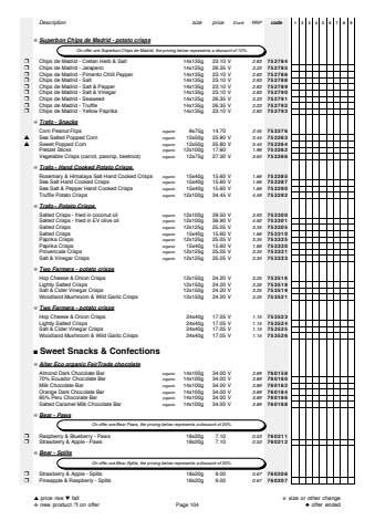 Descriptionsize price%u00a3/unitRRPcode123456789%u274aSuperbon Chips de Madrid - potato crisps%u2752Chips de Madrid - Cretan Herb & Salt14x135g 23.10 V2.83752784%u2752Chips de Madrid - Jalapeno14x125g 26.35 V3.23752785%u2752Chips de Madrid - Pimento Chilli Pepper14x135g 23.10 V2.83752786%u2752Chips de Madrid - Salt14x135g 23.10 V2.83752788%u2752Chips de Madrid - Salt & Pepper14x135g 23.10 V2.83752789%u2752Chips de Madrid - Salt & Vinegar14x135g 23.10 V2.83752790%u2752Chips de Madrid - Seaweed14x125g 26.35 V3.23752791%u2752Chips de Madrid - Truffle14x135g 26.35 V3.23752792%u2752Chips de Madrid - Yellow Paprika14x135g 23.10 V2.83752793%u274aTrafo - SnacksCorn Peanut Flipsorganic8x75g 14.702.45753276%u25b2Sea Salted Popped Cornorganic12x50g 25.80 V3.44753263%u25b2Sweet Popped Cornorganic12x50g 25.80 V3.44753264Pretzel Sticksorganic12x100g 17.601.96753262Vegetable Crisps (carrot, parsnip, beetroot)organic12x75g 27.30 V3.64753266%u274aTrafo - Hand Cooked Potato Crisps Rosemary & Himalaya Salt Hand Cooked Crisps organic15x40g 15.60 V1.66753285Sea Salt Hand Cooked Crisps organic15x40g 15.60 V1.66753287Sea Salt & Pepper Hand Cooked Crisps organic15x40g 15.60 V1.66753290Truffle Potato Crispsorganic12x100g 34.45 V4.59753292%u274aTrafo - Potato Crisps Salted Crisps - fried in coconut oilorganic12x100g 29.50 V3.93753300Salted Crisps - fried in EV olive oilorganic12x100g 36.90 V4.92753301Salted Crispsorganic12x125g 25.05 V3.34753305Salted Crispsorganic15x40g 15.60 V1.66753310Paprika Crispsorganic12x125g 25.05 V3.34753325Paprika Crispsorganic15x40g 15.60 V1.66753330Provencale Crispsorganic12x125g 25.05 V3.34753331Salt & Vinegar Crispsorganic12x125g 25.05 V3.34753333%u274aTwo Farmers - potato crispsHop Cheese & Onion Crisps12x150g 24.20 V3.25753516Lightly Salted Crisps12x150g 24.20 V3.25753518Salt & Cider Vinegar Crisps12x150g 24.20 V3.25753519Woodland Mushroom & Wild Garlic Crisps12x150g 24.20 V3.25753521%u274aTwo Farmers - potato crispsHop Cheese & Onion Crisps24x40g 17.05 V1.15753523Lightly Salted Crisps24x40g 17.05 V1.15753524Salt & Cider Vinegar Crisps24x40g 17.05 V1.15753525Woodland Mushroom & Wild Garlic Crisps24x40g 17.05 V1.15753526%u25a0Sweet Snacks & Confections%u274aAlter Eco organic FairTrade chocolateAlmond Dark Chocolate Barorganic14x100g 34.00 V3.8976015870% Ecuador Chocolate Barorganic14x100g 34.00 V3.89760160Milk Chocolate Barorganic14x100g 34.00 V3.89760162Orange Dark Chocolate Barorganic14x100g 34.00 V3.8976016485% Peru Chocolate Barorganic14x100g 34.00 V3.89760166Salted Caramel Milk Chocolate Barorganic14x100g 34.00 V3.89760168%u274aBear - Paws%u2752Raspberry & Blueberry - Paws18x20g 7.100.53760211%u2752Strawberry & Apple - Paws18x20g 7.100.53760212%u274aBear - Splits%u2752Strawberry & Apple - Splits18x20g 9.000.67760206%u2752Pineapple & Raspberry - Splits18x20g 9.000.67760207 On offer are Superbon Chips de Madrid, the pricing below represents a discount of 10%. On offer are Bear Paws, the pricing below represents a discount of 20%. On offer are Bear Splits, the pricing below represents a discount of 20%.%u25b2price rise %u25bcfall%u2748new product %u2752on offerPage 104%u272bsize or other change%u25c6offer ended