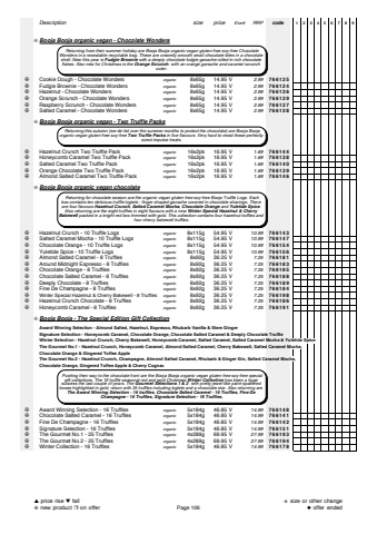 Descriptionsize price%u00a3/unitRRPcode123456789%u274aBooja Booja organic vegan - Chocolate Wonders%u2748Cookie Dough - Chocolate Wonders organic8x65g 14.95 V2.99766125%u2748Fudgie Brownie - Chocolate Wonders organic8x65g 14.95 V2.99766124%u2748Hazelnut - Chocolate Wonders organic8x65g 14.95 V2.99766126%u2748Orange Scrunch - Chocolate Wonders organic8x65g 14.95 V2.99766129%u2748Raspberry Scrunch - Chocolate Wonders organic8x65g 14.95 V2.99766127%u2748Salted Caramel - Chocolate Wonders organic8x65g 14.95 V2.99766128%u274aBooja Booja organic vegan - Two Truffle Packs%u2748Hazelnut Crunch Two Truffle Pack organic16x2pk 16.95 V1.69766144%u2748Honeycomb Caramel Two Truffle Packorganic16x2pk 16.95 V1.69766138%u2748Salted Caramel Two Truffle Packorganic16x2pk 16.95 V1.69766140%u2748Orange Chocolate Two Truffle Packorganic16x2pk 16.95 V1.69766139%u2748Almond Salted Caramel Two Truffle Pack organic16x2pk 16.95 V1.69766146%u274aBooja Booja organic vegan chocolate%u2748Hazelnut Crunch - 10 Truffle Logsorganic8x115g 54.95 V10.99766143%u2748Salted Caramel Mocha - 10 Truffle Logsorganic8x115g 54.95 V10.99766147%u2748Chocolate Orange - 10 Truffle Logsorganic8x115g 54.95 V10.99766154%u2748Yuletide Spice - 10 Truffle Logsorganic8x115g 54.95 V10.99766156%u2748Almond Salted Caramel - 8 Trufflesorganic8x92g 36.25 V7.25766181%u2748Around Midnight Espresso - 8 Trufflesorganic8x92g 36.25 V7.25766183%u2748Chocolate Orange - 8 Trufflesorganic8x92g 36.25 V7.25766185%u2748Chocolate Salted Caramel - 8 Trufflesorganic8x92g 36.25 V7.25766188%u2748Deeply Chocolate - 8 Trufflesorganic8x92g 36.25 V7.25766189%u2748Fine De Champagne - 8 Trufflesorganic8x92g 36.25 V7.25766184%u2748Winter Special Hazelnut & Cherry Bakewell - 8 Trufflesorganic8x92g 36.25 V7.25766198%u2748Hazelnut Crunch Chocolate - 8 Trufflesorganic8x92g 36.25 V7.25766186%u2748Honeycomb Caramel - 8 Trufflesorganic8x92g 36.25 V7.25766191%u274aBooja Booja - The Special Edition Gift CollectionAward Winning Selection - Almond Salted, Hazelnut, Espresso, Rhubarb Vanilla & Stem GingerSignature Selection - Honeycomb Caramel, Chocolate Orange, Chocolate Salted Caramel & Deeply Chocolate TruffleWinter Selection - Hazelnut Crunch, Cherry Bakewell, Honeycomb Caramel, Salted Caramel, Salted Caramel Mocha & Yuletide SpiceThe Gourmet No.1 - Hazelnut Crunch, Honeycomb Caramel, Almond Salted Caramel, Cherry Bakewell, Salted Caramel Mocha,Chocolate Orange & Gingered Toffee AppleThe Gourmet No.2 - Hazelnut Crunch, Champagne, Almond Salted Caramel, Rhubarb & Ginger Gin, Salted Caramel Mocha,Chocolate Orange, Gingered Toffee Apple & Cherry Cognac%u2748Award Winning Selection - 16 Trufflesorganic5x184g 46.85 V14.99766148%u2748Chocolate Salted Caramel - 16 Trufflesorganic5x184g 46.85 V14.99766141%u2748Fine De Champagne - 16 Trufflesorganic5x184g 46.85 V14.99766142%u2748Signature Selection - 16 Trufflesorganic5x184g 46.85 V14.99766151%u2748The Gourmet No.1 - 25 Trufflesorganic4x289g 69.95 V27.99766193%u2748The Gourmet No.2 - 25 Trufflesorganic4x289g 69.95 V27.99766194%u2748Winter Collection - 16 Trufflesorganic5x184g 46.85 V14.99766178 Returning from their summer holiday are Booja Booja organic vegan gluten-free soy-free Chocolate Wonders in a resealable recyclable bag. These are creamily smooth small chocolate bites in a chocolateshell. New this year is Fudgie Brownie with a deeply chocolate fudgie ganache rolled in rich chocolateflakes. Also new for Christmas is the Orange Scrunch with an orange ganache and caramel scrunch outer. Returning this autumn (we de-list over the summer months to protect the chocolate) are Booja Booja organic vegan gluten-free soy-free Two Truffle Packs in five flavours. Very hard to resist these perfectlysized impulse treats. Returning for chocolate season are the organic vegan gluten-free soy-free Booja Truffle Logs. Each box contains ten delicious truffle loglets - finger shaped ganache covered in chocolate shavings. Thereare four flavours Hazelnut Crunch,Salted Caramel Mocha,Chocolate Orange and Yuletide Spice.Also returning are the eight truffles in eight flavours with a new Winter Special Hazelnut & Cherry Bakewell packed in a bright red box trimmed with gold. This collection contains four hazelnut truffles andfour cherry bakewell truffles. Pushing their way to the chocolate front are the Booja Booja organic vegan gluten-free soy-free specialgift collections. The 16 truffle seasonal red and gold Christmas Winter Collection has been a huge success the last couple of years. The Gourmet Selections 1 & 2 with pretty jewel-like paint-spatteredboxes highlighted in gold, return with 25 truffles including loglets and a chocolate star. Also returning areThe Award Winning Selection - 16 truffles,Chocolate Salted Caramel - 16 Truffles,Fine De Champagne - 16 Truffles,Signature Selection - 16 Truffles.%u25b2price rise %u25bcfall%u2748new product %u2752on offerPage 106%u272bsize or other change%u25c6offer ended