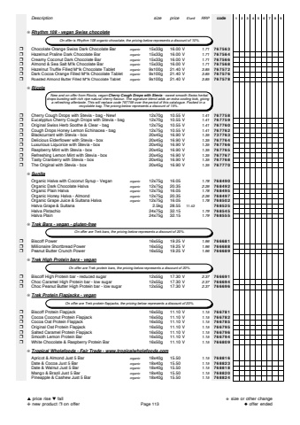 Descriptionsize price%u00a3/unitRRPcode123456789%u274aRhythm 108 - vegan Swiss chocolate%u2752Chocolate Orange Swiss Dark Chocolate Barorganic15x33g 16.00 V1.71767563%u2752Hazelnut Praline Dark Chocolate Barorganic15x33g 16.00 V1.71767564%u2752Creamy Coconut Dark Chocolate Barorganic15x33g 16.00 V1.71767566%u2752Almond & Sea Salt M'lk Chocolate Barorganic15x33g 16.00 V1.71767568%u2752Hazelnut Truffle Filled M*lk Chocolate Tabletorganic9x100g 21.40 V3.85767572%u2752Dark Cocoa Orange Filled M*lk Chocolate Tabletorganic9x100g 21.40 V3.85767576%u2752Roasted Almond Butter Filled M*lk Chocolate Tabletorganic9x100g 21.40 V3.85767578%u274aRicola%u2752Cherry Cough Drops with Stevia - bag - New!12x70g 10.55 V1.41767758%u2752Eucalyptus Cherry Cough Drops with Stevia - bag12x70g 10.55 V1.41767759%u2752Original Swiss Herb Soothe & Clear - bag12x75g 10.55 V1.41767760%u2752Cough Drops Honey Lemon Echinacea - bag12x75g 10.55 V1.41767762%u2752Blackcurrant with Stevia - box20x45g 16.90 V1.35737763%u2752Delicious Elderflower with Stevia - box20x45g 16.90 V1.35767764%u2752Luxurious Liquorice with Stevia - box20x45g 16.90 V1.35767766%u2752Raspberry Mint with Stevia - box20x45g 16.90 V1.35767765%u2752Refreshing Lemon Mint with Stevia - box20x45g 16.90 V1.35767767%u2752Tasty Cranberry with Stevia - box20x45g 16.90 V1.35767768%u2752The Original with Stevia - box20x45g 16.90 V1.35767770%u274aSunitaOrganic Halva with Coconut Syrup - Veganorganic12x75g 16.051.78768490Organic Dark Chocolate Halvaorganic12x75g 20.352.26768492Organic Plain Halvaorganic12x75g 16.051.78768495Organic Honey Halva - Almondorganic12x75g 20.352.26768497Organic Grape Juice & Sultana Halvaorganic12x75g 16.051.78768502Halva Grape & Sultana 2.5kg 28.5511.42768525Halva Pistachio24x75g 32.151.79768545Halva Plain 24x75g 32.151.79768555%u274aTrek Bars - vegan - gluten-free%u2752Biscoff Power16x55g 19.25 V1.96766681%u2752Millionaire Shortbread Power16x55g 19.25 V1.96766688%u2752Peanut Butter Crunch Power16x55g 19.25 V1.96766689%u274aTrek High Protein bars - vegan%u2752Biscoff High Protein bar - reduced sugar12x55g 17.30 V2.37766691%u2752Choc Caramel High Protein bar - low sugar12x55g 17.30 V2.37766694%u2752Choc Peanut Butter High Protein bar - low sugar12x55g 17.30 V2.37766696%u274aTrek Protein Flapjacks - vegan%u2752Biscoff Protein Flapjack16x50g 11.10 V1.15766781%u2752Cocoa Coconut Protein Flapjack 16x50g 11.10 V1.15766782%u2752Cocoa Oat Protein Flapjack 16x50g 11.10 V1.15766785%u2752Original Oat Protein Flapjack 16x50g 11.10 V1.15766795%u2752Salted Caramel Protein Flapjack 16x50g 11.10 V1.15766796%u2752Smooth Lemon Protein Bar16x50g 11.10 V1.15766794%u2752White Chocolate & Raspberry Protein Bar16x50g 11.10 V1.15766809%u274aTropical Wholefoods - Fair Trade - www.tropicalwholefoods.comApricot & Almond Just 5 Barorganic18x40g 15.501.15768816Date & Cocoa Just 5 Barorganic18x40g 15.501.15768823Date & Walnut Just 5 Barorganic18x40g 15.501.15768818Mango & Brazil Just 5 Barorganic18x40g 15.501.15768820Pineapple & Cashew Just 5 Bar organic18x40g 15.501.15768824 New and on offer from Ricola, vegan Cherry Cough Drops with Stevia - sweet smooth Swiss herbaldrops bursting with rich ripe natural cherry flavour. The signature blend adds an extra cooling kick, givinga refreshing aftertaste. This will replace code 767759 over the period of this catalogue. Packed in a recyclable bag. The pricing below represents a discount of 15%. On offer is Rhythm 108 organic chocolate, the pricing below represents a discount of 10%. On offer are Trek bars, the pricing below represents a discount of 20%. On offer are Trek protein bars, the pricing below represents a discount of 20%. On offer are Trek protein flapjacks, the pricing below represents a discount of 20%.%u25b2price rise %u25bcfall%u2748new product %u2752on offerPage 113%u272bsize or other change%u25c6offer ended