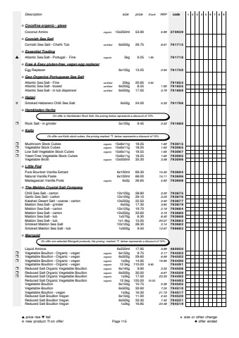 Descriptionsize price%u00a3/unitRRPcode123456789%u274aCocofina organic - glassCoconut Aminoorganic12x250ml 53.905.99370939%u274aCornish Sea SaltCornish Sea Salt - Chef's Tubcertified6x500g 29.756.61791715%u274aEssential Trading%u25b2Atlantic Sea Salt - Portugal - Fineorganic 5kg 9.251.85791718%u274aFree & Easy gluten-free, vegan egg replacerEgg Replacer6x135g 13.252.94791750%u274aGeo Organics Portuguese Sea SaltAtlantic Sea Salt - Finecertified 25kg 20.950.84791654Atlantic Sea Salt - boxedcertified6x250g 8.551.90791655Atlantic Sea Salt - in tub dispenser certified6x500g 17.053.79791660%u274aHatari%u272bSmoked Habanero Chilli Sea Salt6x50g 24.005.33791766%u274aHambleden Herbs%u2752Rock Salt - in grinder5x120g 9.452.52791680%u274aKallo%u2752Mushroom Stock Cubes organic15x6x11g 18.251.62793015%u2752Vegetable Stock Cubes organic15x6x11g 18.251.62793065%u2752Low Salt Vegetable Stock Cubes organic15x6x11g 18.551.65793067%u2752Yeast Free Vegetable Stock Cubes 15x6x11g 18.251.62793095Vegetable Brothorganic12x500ml 32.203.58793096%u274aLittle PodPure Bourbon Vanilla Extract6x100ml 69.3015.40793694Natural Vanilla Paste6x100ml 68.0015.11793696Madagascan Vanilla Podsorganic6x2p 26.655.92793698%u274aThe Maldon Crystal Salt CompanyChilli Sea Salt - carton12x100g 28.803.20793675Garlic Sea Salt - carton12x100g 29.103.23793676Kalahari Desert Salt - coarse - carton12x250g 22.502.50793677Maldon Sea Salt - grinder6x55g 17.303.84793679Maldon Sea Salt - carton 12x125g 19.702.19793684Maldon Sea Salt - carton12x250g 33.603.73793680Maldon Sea Salt - tub1x570g 6.308.40793668Maldon Sea Salt - tub1x1.4kg 15.0520.07793683Smoked Maldon Sea Salt12x125g 28.303.14793682Smoked Maldon Sea Salt - tub1x500g 9.5012.67796683%u274aMarigoldLiquid Aminos6x250ml 17.953.99480950%u2752Vegetable Bouillon - Organic - veganorganic6x150g 9.752.17794503%u2752Vegetable Bouillon - Organic - veganorganic6x500g 29.606.59794502%u2752Vegetable Bouillon - Organic - veganorganic1x2kg 14.9519.95794490Vegetable Bouillon - Organic - veganorganic 12.5kg 110.008.80794491%u2752Reduced Salt Organic Vegetable Bouillonorganic6x140g 9.902.20794508%u2752Reduced Salt Organic Vegetable Bouillonorganic6x500g 30.006.67794509%u2752Reduced Salt Organic Vegetable Bouillonorganic1x2kg 17.5023.33794492Reduced Salt Organic Vegetable Bouillonorganic 12.5kg 125.0010.00794493Vegetable Bouillon6x150g 10.752.39794505Vegetable Bouillon6x500g 32.607.24794510Vegetable Bouillon - vegan1x2kg 16.3021.73794517Reduced Salt Bouillon Vegan6x150g 11.002.44794520Reduced Salt Bouillon Vegan6x500g 33.307.40794521Reduced Salt Bouillon Vegan1x2kg 16.8522.48794519 On offer are selected Marigold products, the pricing marked%u2752 below represents a discount of 15%. On offer are Kallo stock cubes, the pricing marked%u2752 below represents a discount of 15%. On offer is Hambleden Rock Salt, the pricing below represents a discount of 15%.%u25b2price rise %u25bcfall%u2748new product %u2752on offerPage 115%u272bsize or other change%u25c6offer ended