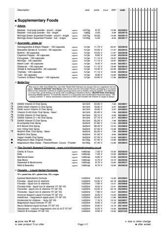 Descriptionsize price%u00a3/unitRRPcode123456789%u25a0Supplementary Foods%u274aAdunaBaobab - fruit pulp powder - pouch - singleorganic1x275g 8.7012.99850902Baobab - fruit pulp powder - tub - singleorganic1x80g 4.005.99850910Moringa Green Superleaf Powder - pouch - singleorganic1x275g 10.0014.96850912Moringa Green Superleaf Powder - tub - singleorganic1x100g 5.358.05850917%u274aAyurvediq - glass jarAshwagandha & Black Pepper - 120 capsulesorganic1x1jar 11.70 V20.97850940Boswellia Serata & Turmeric - 60 capsulesorganic1x1jar 10.05 V17.97850945Brahmi - 60 capsulesorganic1x1jar 10.05 V17.97850948Cayenne Pepper - 60 capsulesorganic1x1jar 8.90 V15.92850949Fenugreek - 120 capsulesorganic1x1jar 11.15 V19.97850946Moringa - 120 capsulesorganic1x1jar 11.15 V19.97850941Neem Leaf - 60 capsulesorganic1x1jar 9.45 V16.90850951Shatavari - 120 capsulesorganic1x1jar 11.15 V19.99850942Shilajit & Ashwagandha - 60 capsulesorganic1x1jar 13.40 V23.99850947Triphala - 120 capsulesorganic1x1jar 11.15 V19.99850943Tulsi - 60 capsulesorganic1x1jar 8.90 V15.92850952Turmeric & Black Pepper - 120 capsulesorganic1x1jar 10.00 V17.95850944%u274aBetterYou%u2752D3000 Vitamin D Oral Spray6x15ml 23.90 V7.55850881%u2752D400 Infant Vitamin D Oral Spray6x15ml 18.90 V5.97850887%u2752D400 Junior Vitamin D Oral Spray6x15ml 18.90 V5.97850882%u2752Vitamin D+K2 Kids' Oral Spray - New!6x15ml 25.20 V7.95850895%u2752D1000 Vitamin D Oral Spray6x15ml 20.15 V6.36850883%u2752D3000 Vitamin D + K2 Oral Spray6x12ml 27.70 V8.77850884%u2752D4000 Vitamin D Oral Spray6x15ml 25.20 V7.96850885B-complete Oral Spray6x25ml 37.80 V11.94850889B12 Boost Oral Spray6x25ml 39.40 V12.45850886Iron 10mg Oral Spray6x25ml 47.35 V14.96850892%u2752MultiVit Kids' Oral Spray - New!6x25ml 25.20 V7.95850896MultiVit Oral Spray6x25ml 31.50 V9.95850890Vegan Health Oral Spray6x25ml 47.35 V14.95850891%u25c6Magnesium Max Original Powder6x120g 47.40 V14.96850893%u25c6Magnesium Max Sleep - Passionflower, Cocoa - Powder 6x160g 47.40 V14.96850894%u274aThe Cornish Seaweed Company - www.cornishseaweedcompany.co.ukClarity & Focusorganic1x60cap 7.50 V12.00850930Kelporganic1x60cap 7.50 V12.00850932Menstrual Easeorganic1x60cap 6.85 V10.96850935Sea Mossorganic1x60cap 6.70 V10.72850936Seaweed & Mushroomsorganic1x60cap 8.70 V13.92850937Wild & Beautifulorganic1x60cap 8.70 V13.92850939%u274aFloradix - Liquid Herbal Formulas YF = yeast-free, GF = gluten-free, VG = veganEpresat Multivitamin formula1x250ml 8.25 V14.00850984Floradix - liquid iron & vitamins1x500ml 13.05 V22.18850986Floradix - liquid iron & vitamins1x250ml 7.90 V13.41850988Floradix Kids - liquid iron & vitamins YF GF VG 1x250ml 8.55 V14.51850989Floravital - liquid iron & vitamins YF GF VG 1x500ml 13.05 V22.18850990Floravital - liquid iron & vitamins YF GF VG 1x250ml 7.90 V13.41850992Immune Support Liquid Formula YF GF VG 1x250ml 8.25 V14.00850994IntestCare - magnesium apple plum YF GF VG 1x250ml 10.50 V17.82850996Kindervital for children - fruity GF VG1x250ml 7.10 V12.16850997Magnesium liquid formula YF GF1x250ml 6.60 V11.22850999Neuro Balance liquid formula YF GF VG 1x250ml 8.95 V15.19851000Saludynam - calcium magnesium zinc & vit D YF GF 1x250ml 8.25 V14.05850998Vitamin B Complex YF GF VG 1x250ml 9.00 V15.30850100 New and on offer from BetterYou, two kids' Roald Dahl themed oral sprays that are vegetarian but notvegan.Vitamin D+K2 Kids' Oral Spray with Charlie and the Chocolate Factory packaging is an expertblend of two essential nutrients to support growing bones and a healthy immune system. It is deliveredin a fuss-free, great tasting oral spray with a bubblegum blueberry flavour. MultiVit Kids' Oral Spray featuring Matilda delivers 14 essential vitamins in a chocolate and marshmallow flavoured spray. The pricing marked%u2752 below represents a discount of 20% and includes the Vitamin D range of sprays%u25b2price rise %u25bcfall%u2748new product %u2752on offerPage 117%u272bsize or other change%u25c6offer ended