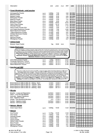 Descriptionsize price%u00a3/unitRRPcode123456789%u274aForest Wholefoods - retail pouchesAshwagandha Powderorganic1x250g 7.359.80851904Banana Powderorganic1x250g 5.307.07851906Baobab Powderorganic1x250g 6.458.60851908Barleygrass Powderorganic1x250g 6.208.27851911Beetroot Powderorganic1x250g 5.307.07851912Black Maca Powderorganic1x250g 6.208.27851914Blueberry Powderorganic1x250g 22.6530.20851916Camu Camu Powderorganic1x250g 10.1013.47851920Chlorella Powderorganic1x250g 8.5511.40851922Hemp Protein Powder 50%organic1x250g 4.906.53851924Lion's Mane Mushroom Powderorganic1x125g 7.9510.60851925Reishi Mushroom Powderorganic1x125g 7.459.938519277 Blend Mushroom Powderorganic1x125g 6.658.87851929Shiitake Mushroom Powderorganic1x125g 6.959.27851931Maca Powderorganic1x250g 5.657.53851926Spirulina Powderorganic1x250g 5.957.93851930Wheatgrass Powderorganic1x250g 6.058.07851932%u274aInfinity FoodsBrewers Yeast Powder 1kg 18.6018.60792203%u274aKaapa Mushrooms%u2748Lion's Mane Extract Powderorganic1x30g 20.20 V34.63855375%u2748Cordyceps Mushroom Tinctureorganic1x50ml 16.15 V27.69855376%u2748Lion's Mane Mushroom Tinctureorganic1x50ml 16.15 V27.69855377%u2748Reishi Mushroom Tinctureorganic1x50ml 16.15 V27.69855378%u274afrom the Leaf CBD%u2752Broad Spectrum CBD & CBG Oil - 500mg - New!1x10ml 10.90 V19.50855436%u2752Broad Spectrum CBD & CBG Oil - 1000mg - New!1x10ml 18.00 V32.25855437%u2752Broad Spectrum CBD & CBG Oil - 1500mg - New!1x30ml 28.50 V50.95855438%u2752Broad Spectrum CBD & CBG Oil - 3000mg - New!1x30ml 36.10 V64.65855439%u274aMicrobzBreathe - Lungs and Respiration1x475ml 13.85 V24.95855440Detox - Liver and Gall Bladder1x475ml 13.85 V24.95855442Immunity - Support Resilience1x475ml 13.85 V24.95855444Kids - Digestive Health1x475ml 13.85 V24.95855445Simple - Only Beneficial Microbes1x1l 17.35 V29.50855446Sustain - Digestive health1x475ml 13.85 V24.95855447Women - Hormone health1x475ml 13.85 V24.95855448%u274aNaturya - BlendsGreen Super Blendorganic1x250g 10.0015.02855408%u274aNaturyaAcai Powderorganic1x125g 13.3019.98855410Chia Seedsorganic1x300g 4.006.01855416Chlorella Powder organic1x200g 8.6513.00855417Cacao Nibsorganic1x125g 4.406.49855421Cacao Powderorganic1x250g 6.008.00855419Hemp Protein Powderorganic1x300g 6.659.99855420Maca Powderorganic1x300g 4.656.99855423Spirulina Powder organic1x200g 6.009.01855425Wheatgrass Powderorganic1x200g 5.307.95855427 New and on offer from From the Leaf CBD, a range of vegan gluten-free Broad Spectrum CBD oils in dark glass bottles with a dropper. They all contain C8 MCT coconut oil and hemp extract. Broad Spectrum CBD delivers the benefits of multiple cannabinoids and terpenes working together to enhanceeffectiveness. From the Leaf work closely with trusted partners, including farmers and suppliers, who aregood practice certified. The soil is tested for contaminants before planting, crops are monitored throughout the growing season and every batch undergoes thorough testing after extraction. There is a10mlsize in two strengths 500mg and1000mg. There is a larger 30mlsize in 1500mgand a whopping3000mg.The bottles are packaged in card boxes. The pricing below represents a discount of 15%. New from Kaapa, a range of organic vegan gluten-free mushroom products grown in the pristine forestsof Finland. PEFC/FCA certified Finnish birch is used as a growing substrate ensuring the triple extractedmushrooms are rich in essential compounds derived solely from the mushroom fruiting bodies. Lion'sMane Extract Powder for helping maintain focus, memory and digestion is packed in a dark glass jar. There are three tinctures in dark glass bottles with droppers, packed in card boxes: Lion's Mane Mushroom Tincture,Cordyceps Mushroom Tincture known as the energy mushroom and ReishiMushroom Tincture for calming and immune health. %u25b2price rise %u25bcfall%u2748new product %u2752on offerPage 118%u272bsize or other change%u25c6offer ended
